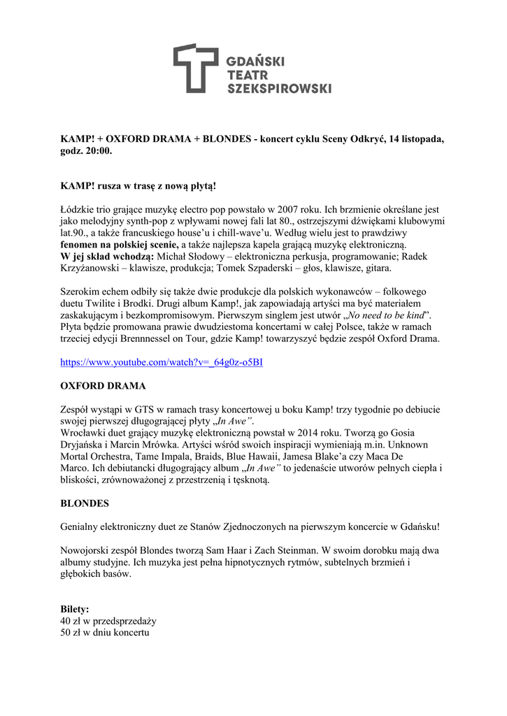KAMP! + OXFORD DRAMA + BLONDES - koncert cyklu Sceny Odkryć, 14 listopada, godz. 20:00. KAMP! rusza w trasę z nową płytą! Łódzkie trio grające muzykę electro pop powstało w 2007 roku. Ich brzmienie określane jest jako melodyjny synth-pop z wpływami nowej fali lat 80., ostrzejszymi dźwiękami klubowymi lat.90., a także francuskiego house’u i chill-wave’u. Według wielu jest to prawdziwy fenomen na polskiej scenie, a także najlepsza kapela grającą muzykę elektroniczną. W jej skład wchodzą: Michał Słodowy – elektroniczna perkusja, programowanie; Radek Krzyżanowski – klawisze, produkcja; Tomek Szpaderski – głos, klawisze, gitara. Szerokim echem odbiły się także dwie produkcje dla polskich wykonawców – folkowego duetu Twilite i Brodki. Drugi album Kamp!, jak zapowiadają artyści ma być materiałem zaskakującym i bezkompromisowym. Pierwszym singlem jest utwór „No need to be kind”. Płyta będzie promowana prawie dwudziestoma koncertami w całej Polsce, także w ramach trzeciej edycji Brennnessel on Tour, gdzie Kamp! towarzyszyć będzie zespół Oxford Drama. https://www.youtube.com/watch?v=_64g0z-o5BI OXFORD DRAMA Zespół wystąpi w GTS w ramach trasy koncertowej u boku Kamp! trzy tygodnie po debiucie swojej pierwszej długogrającej płyty „In Awe”. Wrocławki duet grający muzykę elektroniczną powstał w 2014 roku. Tworzą go Gosia Dryjańska i Marcin Mrówka. Artyści wśród swoich inspiracji wymieniają m.in. Unknown Mortal Orchestra, Tame Impala, Braids, Blue Hawaii, Jamesa Blake’a czy Maca De Marco. Ich debiutancki długogrający album „In Awe” to jedenaście utworów pełnych ciepła i bliskości, zrównoważonej z przestrzenią i tęsknotą. BLONDES Genialny elektroniczny duet ze Stanów Zjednoczonych na pierwszym koncercie w Gdańsku! Nowojorski zespół Blondes tworzą Sam Haar i Zach Steinman. W swoim dorobku mają dwa albumy studyjne. Ich muzyka jest pełna hipnotycznych rytmów, subtelnych brzmień i głębokich basów. Bilety: 40 zł w przedsprzedaży 50 zł w dniu koncertu Początek: 14 listopada 2015, godz. 20:00 Miejsce: Gdański Teatr Szekspirowski Bilety na wszystkie koncerty do nabycia w kasie Teatru oraz na stronie http://bilety.teatrszekspirowski.pl/. UWAGA! W kasach Teatru pojawi się również kolekcjonerska wersja limitowanych karnetów uprawniających wstępu na koncert Nosaj Thing dwa dni później (16.11) w cenie 50 PLN! Kontakt dla mediów: Marta Jaszczerska [email protected] tel.: 881-468-035