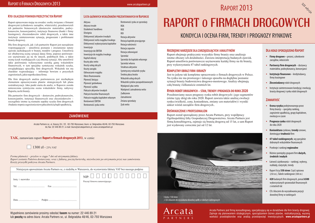 www.arcatapartners.pl Raport opracowano mając na uwadze: osoby związane z firmami drogowymi (członkowie zarządów, właściciele), przedstawicieli ich partnerów biznesowych (dostawców materiałów, podwykonawców, konsorcjantów), instytucje finansowe (banki i firmy leasingowe), zleceniodawców robót drogowych, a także inne instytucje zainteresowane sytuacją, prognozami i problemami branży drogowej. Aktywa Aktywa trwałe Działalność handlowa Dźwignia Efektywność aktywów trwałych Efektywność netto majątku trwałego Efektywność wykorzystania kapitałów Inwestycje Inwestycje do EBITDA Inwestycje do majątku trwałego Kapitał własny Koszty płac netto Koszty usług obcych Koszty zarządu Odtwarzanie majątku Okres finansowania Płynność bieżąca Płynność gotówkowa Płynność szybka Pokrycie aktywów trwałych Pokrycie kosztów finansowych Pokrycie majątku kapitałem własnym Rentowność EBITDA Rentowność zysku netto Dla firm drogowych, jak i ich partnerów Raport jest narzędziem wspomagającym – umożliwia poznanie i zrozumienie natury zjawisk zachodzących w branży, trendów i prognoz. Umożliwia też obiektywną ocenę sytuacji danej firmy, poprzez porównawcze usytuowanie jej na tle innych, podobnych firm, a także ocenę ryzyk wynikających z jej obecnej sytuacji. Aby umożliwić takie porównania wykorzystano szeroką gamę wskaźników finansowych, w tym specjalny syntetyczny wskaźnik ryzyka, uwzględniający specyfikę firm drogowych. Wskaźnik ten ma charakter wyprzedzający – informuje bowiem o przyszłych zagrożeniach, jakie napotka dana firma. Dla firm drogowych analiza porównawcza jest niezbędnym elementem opracowywania planów strategicznych lub planu restrukturyzacji. Jako punkt startu do analiz, w Raporcie została umieszczona syntetyczna ocena wskaźników firmy, nabywcy Raportu, na tle branży. Dla partnerów firm drogowych – dostawców, podwykonawców, konsorcjantów, instytucji finansowych oraz zleceniodawców – szczególnie istotne są rozmaite aspekty ryzyka firm drogowych i badanie stopnia zagrożenia niewypłacalnością bądź upadłością. Rentowność zysku ze sprzedaży ROA ROE ROI Rotacja aktywów Rotacja kapitału pracującego Rotacja należności Rotacja zapasów Rotacja zobowiązań Sprzedaż Sprzedaż do kapitału własnego Sprzedaż własna Struktura aktywów Syntetyczny wskaźnik ryzyka Średnia płaca brutto Wskaźnik usług obcych Wskaźnik zysków pozapodstawowych Wydajność płac netto Wydajność zatrudnienia netto Zadłużenie Zatrudnienie Zmiana sprzedaży Zysk netto RAPORT O FIRMACH DROGOWYCH KONDYCJA I OCENA FIRM, TRENDY I PROGNOZY RYNKOWE NIEZBĘDNE NARZĘDZIE DLA ZARZĄDZAJĄCYCH I ANALITYKÓW Raport obejmuje praktycznie wszystkie firmy branży oraz analizuje istotne obszary ich działalności. Zawiera interpretację badanych zjawisk. Raport umożliwia porównawcze usytuowanie każdej firmy na tle branży, przy wykorzystaniu 47 tabel rankingowych. Arcata Partners sc, ul. Kazury 2A / 22, 02-795 Warszawa; biuro: ul. Belgradzka 48/46, 02-793 Warszawa tel./fax: 22 446 89 21; e-mail: [email protected]; www.arcatapartners.pl DLA KOGO SPORZĄDZONO RAPORT Firmy drogowe – prezesi, członkowie zarządów, właściciele Partnerzy firm drogowych – dostawcy materiałów, podwykonawcy, konsorcjanci KOMPLETNY OBRAZ FIRM I BRANŻY Jest to jedyne tak kompletne opracowanie o firmach drogowych w Polsce. Na rynku nie ma prostszego i tańszego sposobu na dogłębne poznanie sytuacji branży budownictwa drogowo-mostowego. Analizy obejmują całą branżę i kilkanaście ostatnich lat. RYNEK ROBÓT DROGOWYCH – STAN, TRENDY I PROGNOZA DO ROKU 2020 Przedstawiamy nasze prognozy rynku robót drogowych i jego segmentów (różne typy dróg) do roku 2020. Raport zawiera także analizę ewolucji rynku (wielkość, ceny, koniunktura, zmiany cen materiałów) i wyniki ankiet wśród zarządów firm drogowych.. DOŚWIADCZENIE I PROFESJONALIZM ZAMÓWIENIE a cj LISTA GŁÓWNYCH WSKAŹNIKÓW PREZENTOWANYCH W RAPORCIE RAPORT 2013 y ed II KTO I DLACZEGO POWINIEN PRZECZYTAĆ TEN RAPORT X RAPORT O FIRMACH DROGOWYCH 2013 Raport został sporządzony przez Arcata Partners, przy współpracy Ogólnopolskiej Izby Gospodarczej Drogownictwa. Arcata Partners jest firmą konsultingową, zajmuje się branżą drogową od 15 lat, a sam Raport jest wydawany corocznie już od 12 lat. Instytucje finansowe – kredytodawcy, firmy leasingowe Zleceniodawcy robót drogowych Instytucje zainteresowane kondycją i ewolucją branży drogowej i rynku robót drogowych ZAWARTOŚĆ Ocena ryzyka podejmowanego przez firmy branży – specjalny ranking, zagrożenie upadłością, grupy kapitałowe, ewolucja w czasie Prognoza rynku robót drogowych do roku 2020 Koniunktura rynkowa, trendy cenowe, dominujące trudności firm TAK, zamawiam raport Raport o firmach drogowych 2013, w cenie: 47 tabel rankingowych, wg specjalnie dobranych wskaźników finansowych 1300 zł + 23% VAT Przekroje i rankingi regionalne Różnice pomiędzy grupami firm dużych, średnich i małych Forma płatności – przelew w ciągu 7 dni od otrzymania faktury. Raport zostanie Państwu dostarczony, wraz z fakturą, pocztą kurierską, niezwłocznie po otrzymaniu przez nas zamówienia. Koszty przesyłki pokrywa Arcata Partners. Łatwość użytkowania – rankingi, wykresy, rozkłady, statystyki, trendy Niniejszym upoważniam Arcata Partners sc, z siedzibą w Warszawie, do wystawienia faktury VAT bez naszego podpisu Imię i nazwisko ............................................................................. Tel. ............................................. Raport liczy 550 stron: Część opisowa (250 str.), Tabele rankingowe (300 str.) NIP: 420 badanych firm drogowych, ponad 6500 Pieczęć firmowa zamawiającego: wykorzystanych sprawozdań finansowych z ostatnich lat Fax ......................................... CD z kluczem do wyszukiwania pozycji Data ............................