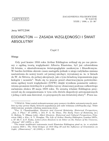 ZAGADNIENIA FILOZOFICZNE W NAUCE XXIII / 1998, s. 21–36∗ ARTYKUŁY Jerzy WITCZAK EDDINGTON — ZASADA WZGLĘDNOŚCI I ŚWIAT ABSOLUTNY Część I Wstęp Gdy pod koniec 1916 roku Arthur Eddington zetknął się po raz pierwszy z ogólną teorią względności Alberta Einsteina, był już człowiekiem 34–letnim, o ukształtowanym światopoglądzie naukowym i filozoficznym. W bardzo krótkim okresie czasu nastąpiła jednak u niego radykalna zmiana nastawienia do nowej teorii: od jawnej niechęci, wyrażonej m. in. w listach do W. de Sittera, do pełnej akceptacji, jak o tym świadczą wspomnienia jego kolegów i uczniów1 . Stało się to jeszcze przed obserwacyjnym potwierdzeniem ogólnej teorii względności (OTW) dzięki wynikom pomiarów zakrzywienia promieni świetlnych w pobliżu tarczy słonecznej podczas całkowitego zaćmienia słońca 29 maja 1919 roku. To zresztą właśnie Eddington przyczynił się do zorganizowania w tym celu dwóch ekspedycji astronomicznych i jedną z nich sam kierował, co przysporzyło mu światowej sławy2 . Przez na∗ UWAGA: Tekst został zrekonstruowany przy pomocy środków automatycznych; możliwe są więc pewne błędy, których sygnalizacja jest mile widziana ([email protected]). Tekst elektroniczny posiada odrębną numerację stron. 1 Por. S. Chandrasekhar, Einstein and General Relativity: Historical Perspectives, „Am. J. Phys.” 47 (1979), s. 215; P. A. M. Dirac, The Early Years of Relativity, [w:] G. Holton, Y. Elkana (eds), Albert Einstein. Historical and Cultural Perspectives, Princeton 1982, s. 81n.; A. V. Douglas, The Life of Arthur Stanley Eddington, London 1957e, s. 37–40; C. & F. Kahn, Letters from Einstein to de Sitter on the Nature of the Universe, „Nature” 257 (1975), s. 454. 2 Na temat możliwości testowania teorii Einsteina Eddington pisał m. in. w artykule z marca 1919 r. The Total Eclipse of 1919 May 29 and the Influence of Gravitation on Light, „Observatory”, 42 (1919), s. 119–122. 2 Jerzy WITCZAK stępne lata działał aktywnie jako główny propagator nowej teorii na terenie Anglii, rozwijając ją i wzbogacając o własne koncepcje. Dostrzec należy filozoficzne racje tej zmiany. Już wydany w 1918 roku Report on the Relativity Theory of Gravitation zawierał kompletny wykład OTW i był wyrazem przekonania autora o jej prawdziwości. O książce tej H. Dingle powiedział, że świadczy ona, iż Eddington uchwycił z niezwykłą szybkością istotę i implikacje teorii względności. Przytacza on w związku z tym swą rozmowę z uczonym, w której na pytanie, czy jakikolwiek aspekt tej idei zrodził się wcześniej u niego niezależnie od Einsteina, otrzymał odpowiedź przeczącą3 . Teoria Einsteina stanowiła zatem dla Eddingtona zupełną nowość, i to także w sensie filozoficznym, zmieniła ona bowiem kierunek, w którym zmierzało jego ogólne stanowisko filozoficzne. Bez wątpienia można ją uważać za jedno ze źródeł filozofii Sir Arthura4 . Wszystkie późniejsze jego idee pojawiły się w najczystszej formie już w pierwszych pracach na temat teorii względności, a szczególnie w dziele The Mathematical Theory of Relativity. To powiązanie jest tak silne, że niemożliwe jest oddzielenie dorobku naukowego Eddingtona od jego filozofii5 . Z tego też względu nie można rozpatrywać tej filozofii w oderwaniu od jego fizyki. W dość powszechnym niedocenianiu tej zależności leży bowiem przyczyna wielu trudności napotykanych przez badaczy w zrozumieniu późniejszych jego poglądów filozoficznych. Zadaniem niniejszego artykułu będzie ukazanie wpływu samej zasady względności w jej najogólniejszym sformułowaniu na oryginalne stanowisko epistemologiczne Eddingtona, zwane przez niego strukturalizmem. Filozoficzna dyskusja tego stanowiska rozwinęła się zwłaszcza po opublikowaniu w 1939 roku książki The Philosophy of Physical Science. Koncentrowała się ona wokół przedstawionej w tym dziele powszechnie krytykowanej epistemologii i przyczyniła się w znacznej mierze do ukształtowania oblicza Eddingtona jako filozofa tkwiącego w tradycji kantowskiego idealizmu. Ta ostatnia jego filozoficzna praca zaważyła również znacznie na próbach całościowej 3 Por. H. Dingle, Sir Arthur Eddington O. M., F. R. S. (Obituary), „Proc. Phys. Soc.” 57 (1945), s. 245. 4 Por. tenże, The Sources of Eddington’s Philosophy, Cambridge 1954, s. 61n. Dingle uważa, że drugim równorzędnym źródłem była wiktoriańska tradycja filozoficzna, której tradycyjny realistyczny obraz świata pozostawał podświadomym założeniem Eddingtona (por. tamże, s. 4, 61). Metafizyczne nastawienie uczonego sprawiało też, jego zdaniem, że każdy problem widział on sub specie aeternitatis (por. Sir Arthur, s. 245). 5 Tego zdania jest np. H. Dingle, Sir Arthur, s. 246. EDDINGTON — ZASADA WZGLĘDNOŚCI I ŚWIAT ABSOLUTNY 3 oceny jego stanowiska filozoficznego. Trzeba więc wrócić do fizycznych podstaw jego poglądów. 1. Idea niezmienniczego poznania 1.1. Relatywizm i niezmienniczość zasady względności Istotną rolę w konstrukcji ogólnej teorii względności odegrała postulatywnie potraktowana przez A. Einsteina zasada względności. Toteż przystępując do analizy eddingtonowskiej interpretacji teorii względności również wypada najpierw przedstawić, w jaki sposób on sam formułuje tę zasadę, jak ją rozumie i jakie zajmuje stanowisko wobec sugerowanego jakoby przez nią relatywizmu. Szczególną zasadę względności będzie się tu traktować w ślad za autorem6 jako szczególny przypadek zasady ogólnej, a więc w świetle rezultatów OTW. Wyrazem tego było m. in. konsekwentne stosowanie przez niego określenia restricted w stosunku do zasady względności dla STW. Z szerszym nawiązaniem do zasady względności po raz pierwszy spotykamy się u Eddingtona w artykule poświęconym grawitacji, opublikowanym w roku 1915, a więc jeszcze przed ogłoszeniem OTW przez A. Einstein