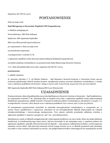 Sygnatura akt VIII Gz 13/16 POSTANOWIENIE Dnia 30 maja 2016 Sąd Okręgowy w Szczecinie Wydział VIII Gospodarczy w składzie następującym: Przewodniczący: SSO Piotr Sałamaj Sędziowie: SSO Agnieszka Kądziołka SSO Leon Miroszewski (sprawozdawca) po rozpoznaniu w dniu 30 maja 2016 na posiedzeniu niejawnym w postępowaniu z wniosku D. M. o ogłoszenie upadłości osoby fizycznej nieprowadzącej działalności gospodarczej na skutek zażalenia wnioskodawcy na postanowienie Sądu Rejonowego Szczecin-Centrum w S. z dnia 28 października 2015 roku, sygnatura akt XII GU 173/15 postanawia: I. oddalić zażalenie; II. przyznać adwokat J. T. od Skarbu Państwa – Sąd Rejonowy Szczecin-Centrum w Szczecinie kwotę 450,00 (czterysta pięćdziesiąt) złotych tytułem kosztów nieopłaconej pomocy prawnej udzielonej wnioskodawcy z urzędu wraz z należnym podatkiem od towarów i usług w stawce 23%, to jest kwotą 103,50 (sto trzy 50/100) złotych. SSO Agnieszka Kądziołka SSO Piotr Sałamaj SSO Leon Miroszewski UZASADNIENIE Postanowieniem z dnia 28 października 2015 roku Sąd Rejonowy Szczecin-Centrum w Szczecinie – Sąd Upadłościowy, po rozpoznaniu wniosku T. M., złożonego dnia 10 sierpnia 2015 roku, o ogłoszenie upadłości osoby nieprowadzącej działalności gospodarczej, oddalił wniosek. Przyznał też pełnomocnikowi wnioskodawcy adwokatowi z urzędy J. T. wynagrodzenie w kwocie 1.800 złotych wraz z należnym podatkiem Vat w stawce 23%, to jest 414 złotych. W uzasadnieniu postanowienia stwierdził, że zaistniała niewypłacalność wnioskodawcy w rozumieniu art. 11 ustawy Prawo upadłościowe i naprawcze, natomiast do tej niewypłacalności dłużnik doprowadził się wskutek nieodpowiedzialnego i nierozważnego postępowania. Tym samym zachodzi przesłanka oddalenia wniosku o ogłoszenie upadłości w oparciu o przepis art. 4914 ust. 1 powołanej ustawy. Sąd Rejonowy uznał, że dłużnik zaciągał pożyczki i zobowiązania kredytowe na rzecz osoby, która nie miała zdolności kredytowej, ze świadomością tego stanu rzeczy. Sąd ten stwierdził, że nie zmieniają oceny, w aspekcie podstaw do ogłoszenia upadłości, pobudki, którymi kierował się dłużnik – chęć pomocy zadłużonemu koledze, wychowującemu samotnie czworo dzieci. Sąd pierwszej instancji zwrócił uwagę również na to, że dłużnik przekazał część pieniędzy tej osobie w celu wymiany samochodu na nowszy, nie podjął żadnych kroków zmierzających do zaspokojenia swoich roszczeń, co więcej zaciągał kolejne zobowiązania i przekazywał uzyskane środki, choć poprzednie pożyczki nie były spłacane. Na koniec Sąd Rejonowy stwierdził, że dłużnik jest zdolny do pracy zarobkowej, posiada zawód, w którym pracuje, a nadto nie ma nikogo na utrzymaniu, tym samym żadne szczególne względy nie przemawiają za tym, aby na skutek przeprowadzonego postępowania upadłościowego uzyskał chociażby częściowe umorzenie zobowiązań kredytowych kosztem banków udzielających kredytów i innych kredytobiorców. Wnioskodawca złożył zażalenie na to postanowienie w zakresie oddalenia wniosku o ogłoszenie upadłości. Zarzucił naruszenie art. 4914 ust. 1 ustawy Prawo upadłościowe i naprawcze poprzez jego błędną interpretację i niewłaściwe zastosowanie polegające na przyjęciu, że zachowanie dłużnika nosiło znamiona co najmniej rażącego niedbalstwa w stosunku do prowadzenia własnych spraw, podczas gdy było co najwyżej lekkomyślnością lub niedbalstwem zwykłym. Wskazując na powyższy zarzut skarżący wniósł o uchylenie zaskarżonego postanowienia i przekazanie sprawy sądowi pierwszej instancji do ponownego rozpoznania, a także o zasądzenie od Skarbu Państwa na rzecz J. T., adwokata z urzędu, kosztów nieopłaconej pomocy prawnej. W uzasadnieniu zażalenia skarżący powołał się na zapatrywania w sprawie definiowania pojęcia rażącego niedbalstwa i stwierdził, że zaciągając pożyczki, które doprowadziły go do niewypłacalności kierował się współczuciem dla kolegi i jego dzieci w związku z własnym pobytem w Domu Dziecka w B. od 4 roku życia, wierzył zapewnieniom kolegi, że ten zadłużenie spłaci i z tego względu zaciągał kolejne pożyczki, zamiarem dłużnika była spłata pożyczek, co dłużnik realizował, niezależnie od wysokości kwot otrzymywanych od osoby, na rzecz której pożyczki zaciągał, nie unika spłaty zobowiązań o czym świadczy to, że na bieżąco reguluje należności związane z obsługą jego życia codziennego, tym samym nie chciał doprowadzić do swojej niewypłacalności i nie przewidywał takiego skutku. Podniesiono też, że dłużnik wyjawił swojemu pełnomocnikowi w grudniu 2015 roku, że leczył się psychiatrycznie. W związku z tym we wnioskach zażalenia wniesiono o zwrócenie się o dokumentację tego leczenia, a także o dokumentację pobytu dłużnika w Domu Dziecka w B., wreszcie o dopuszczenie dowodu z opinii biegłego psychiatry i biegłego psychologa na okoliczność stanu zdrowia dłużnika i podatności na wpływy innych osób przy podejmowaniu przez dłużnika decyzji życiowych. Sąd Okręgowy zważył, co następuje. Zażalenie nie może być uwzględnione. Skarżący w istocie nie zaprzeczył żadnym istotnym ustaleniom dokonanym przez Sąd Rejonowy a wskazanym w uzasadnieniu zaskarżonego postanowienia. Skarżący zakwestionował natomiast przyjęcie, że jego zachowanie, jako dłużnika, nosiło znamiona rażącego niedbalstwa. W uzasadnieniu zażalenia przyznano, z czym Sąd Okręgowy się zgadza, że rażące niedbalstwo obejmuje takie zachowanie, które uchybia podstawowym, elementarnym zasadom staranności, takiej, jakiej można wymagać od osób najmniej nawet rozgarniętych. Sąd pierwszej instancji słusznie przyjął, że takim właśnie było zachowanie dłużnika. Wniosek ten nasuwa się choćby z treści przesłuchania dłużnika. Stwierdził on, że decydując się na