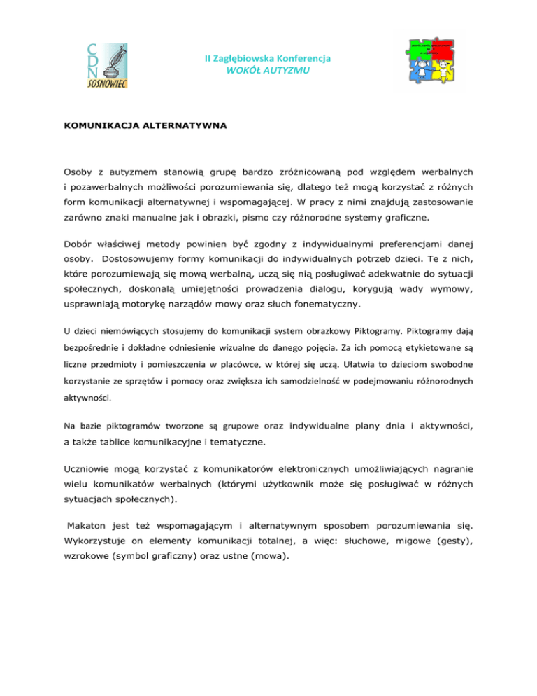 II Zagłębiowska Konferencja WOKÓŁ AUTYZMU KOMUNIKACJA ALTERNATYWNA Osoby z autyzmem stanowią grupę bardzo zróŜnicowaną pod względem werbalnych i pozawerbalnych moŜliwości porozumiewania się, dlatego teŜ mogą korzystać z róŜnych form komunikacji alternatywnej i wspomagającej. W pracy z nimi znajdują zastosowanie zarówno znaki manualne jak i obrazki, pismo czy róŜnorodne systemy graficzne. Dobór właściwej metody powinien być zgodny z indywidualnymi preferencjami danej osoby. Dostosowujemy formy komunikacji do indywidualnych potrzeb dzieci. Te z nich, które porozumiewają się mową werbalną, uczą się nią posługiwać adekwatnie do sytuacji społecznych, doskonalą umiejętności prowadzenia dialogu, korygują wady wymowy, usprawniają motorykę narządów mowy oraz słuch fonematyczny. U dzieci niemówiących stosujemy do komunikacji system obrazkowy Piktogramy. Piktogramy dają bezpośrednie i dokładne odniesienie wizualne do danego pojęcia. Za ich pomocą etykietowane są liczne przedmioty i pomieszczenia w placówce, w której się uczą. Ułatwia to dzieciom swobodne korzystanie ze sprzętów i pomocy oraz zwiększa ich samodzielność w podejmowaniu różnorodnych aktywności. Na bazie piktogramów tworzone są grupowe oraz indywidualne plany dnia i aktywności, a takŜe tablice komunikacyjne i tematyczne. Uczniowie mogą korzystać z komunikatorów elektronicznych umoŜliwiających nagranie wielu komunikatów werbalnych (którymi uŜytkownik moŜe się posługiwać w róŜnych sytuacjach społecznych). Makaton jest teŜ wspomagającym i alternatywnym sposobem porozumiewania się. Wykorzystuje on elementy komunikacji totalnej, a więc: słuchowe, migowe (gesty), wzrokowe (symbol graficzny) oraz ustne (mowa). II Zagłębiowska Konferencja WOKÓŁ AUTYZMU METODA KNILLA Zajęcia prowadzone metodą M i CH. Knillów „Świadomość Ciała, Kontakt i Komunikacja" obejmują cztery programy oraz Program Wprowadzający i Program Specjalny. Podstawowym załoŜeniem tej metody jest fakt, iŜ dotyk dla rozwoju człowieka jest niezwykle waŜny. Przez kontakt fizyczny rozwijają się pierwsze ludzkie emocje i nawiązany zostaje kontakt z otaczającym światem. Kontakt fizyczny ma ogromny wpływ na rozwój dziecka, jego zdrowie, aktywność i komunikację z otoczeniem, a takŜe pewność siebie i poczucie własnej wartości. W tej metodzie waŜną rolę odgrywa ruch, poniewaŜ ruchy powolne i rytmiczne zmniejszają stopień pobudzenia dzieci, a ruchy nagłe i szybkie sprawiają, Ŝe pobudzenie wzrasta. Podstawowym źródłem kontaktu są ręce, które przekazują pozytywne nastawienie i dają poczucie bezpieczeństwa. Celem nadrzędnym zajęć jest rozwijanie świadomości i wraŜliwości dzieci na wzajemne kontakty, sygnały i reakcje. Niezwykle waŜnym elementem tej metody jest muzyka, specjalnie dostosowana do poszczególnych programów. Towarzyszy wykonywanym czynnościom w sposób nieodłączny przez cały czas trwania zajęć. Muzyka zwiększa i stymuluje uwagę dziecka, kieruje nią i motywuje do określonej aktywności. Muzyka podpowiada dziecku jaki będzie kolejny wykonany przez nie ruch. Proponowane przez Knillów programy rozwijają kontakt społeczny, ruch, a równocześnie są formą zabawy dla podopiecznych. Dają podstawy rozwoju i rozumienia języka ciała. Dzieci nabywają wiedzę o sobie i stosują ją w praktyce. Ćwiczenia pozwalają na rozwijanie świadomości własnego ciała, oraz pozwalają na coraz lepszą kontrolę nad ruchami, co ułatwia komunikację z otoczeniem. Programy moŜna stosować w kaŜdym wieku, a ich poziom naleŜy dostosować do poziomu rozwoju intelektualnego oraz rodzaju niepełnosprawności fizycznej. II Zagłębiowska Konferencja WOKÓŁ AUTYZMU PECS PECS (Picture Exchange Communication System) to opracowana przez Lori Frost i Andrew S. Bondy metoda komunikacji alternatywnej i wspomagającej, skierowana do osób ze spektrum autyzmu lub z innymi zaburzeniami rozwojowymi. Metoda ta promuje komunikację funkcjonalną w róŜnorodnych sytuacjach rozpoczyna nauczenie dziecka podawania obrazka społecznych. Sesję PECS przedstawiającego poŜądaną rzecz „partnerowi komunikacyjnemu”, który uznaje tę inicjację jako prośbę. Metoda umoŜliwia skuteczną wymianę informacji: od spontanicznego wyraŜania próśb aŜ do rozwijania umiejętności budowania zdań. W bardziej zaawansowanych fazach naucza się odpowiadania na pytania i komentowania. ZałoŜenia metody PECS bazują na zasadach stosowanej analizy zachowania. Zachowania komunikacyjne podpowiadania są systematycznie (i ich nauczane za wycofywania) pomocą oraz stosowania strategii procedur wzmacniania. W metodzie PECS wyróŜnia się 6 faz. Nie są stosowane podpowiedzi słowne, które eliminują w znacznym stopniu uzaleŜnienie się od nich w toku nauczania. PECS przeznaczony jest dla osób w kaŜdym wieku, posiadających rozmaite trudności komunikacyjne, poznawcze i fizyczne. Rozwijanie komunikacji poprzez PECS ma duŜy wpływ na rozwój niezaleŜnej mowy czynnej oraz wykształcenie efektywnej komunikacji funkcjonalnej, która jest natychmiastowo uŜyteczna. II Zagłębiowska Konferencja WOKÓŁ AUTYZMU METODA TEACCH Metoda TEACCH jest to program terapii i edukacji dzieci autystycznych oraz dzieci mających zaburzenia w komunikacji. Praca z dzieckiem rozpoczyna się od oceny poziomu rozwojowego dziecka, jego profilu psychoedukacyjnego PEP, a takŜe deficytów i mocnych stron podopiecznego. Na podstawie wyników testu PEP-R opracowuje się strategię nauczania, która ma pomóc w realizacji krótkotrwałych i odległych celów nauczania za pomocą ćwiczeń prowadzonych przy stole, od 15 minut do godziny dziennie. KaŜde dziecko posiada swój indywidualny program ćwiczeń, który moŜe być równieŜ stosowany w środowisku domowym przez rodziców. Postępy dziecka są rejestrowane przez specjalistę, który na bieŜąco modyfikuje program. Kieruje się przy 