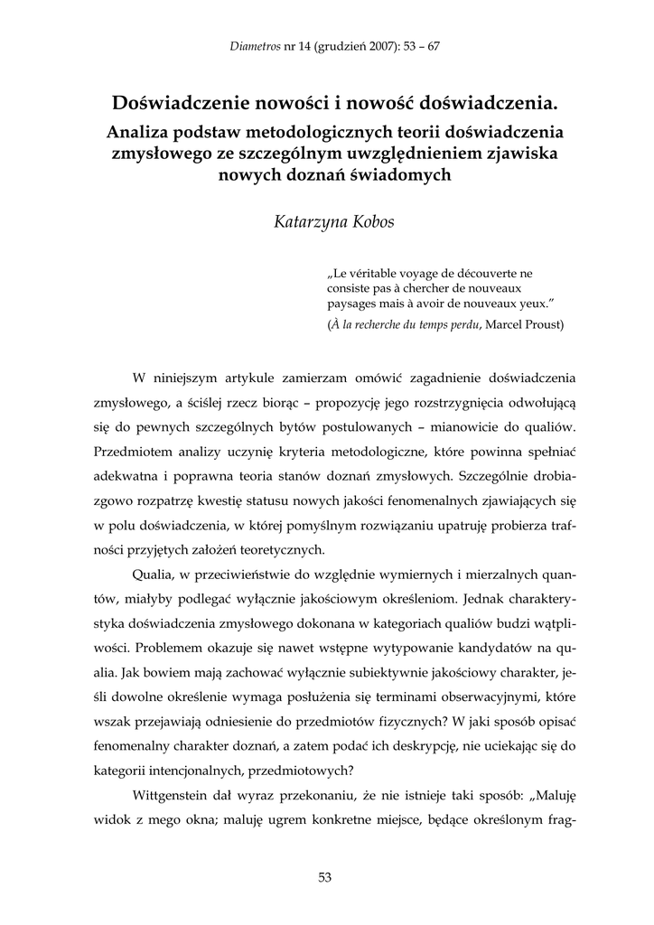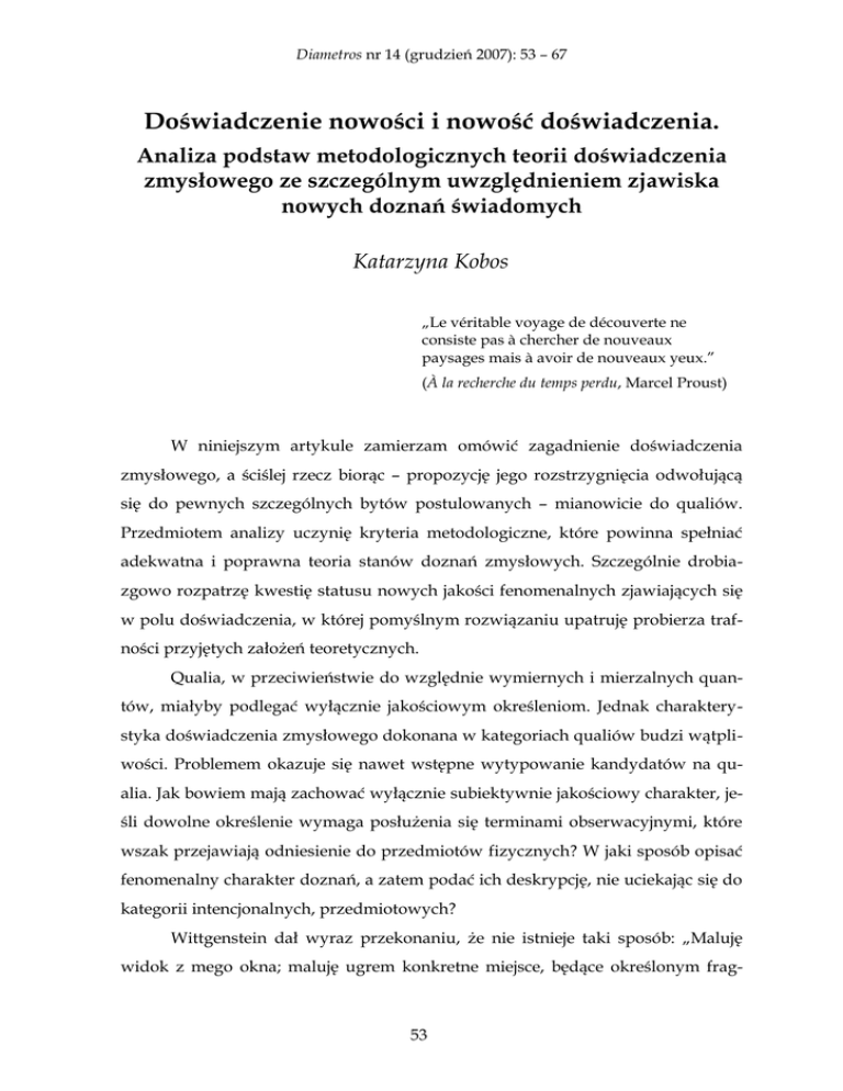 Diametros nr 14 (grudzień 2007): 53 – 67 Doświadczenie nowości i nowość doświadczenia. Analiza podstaw metodologicznych teorii doświadczenia zmysłowego ze szczególnym uwzględnieniem zjawiska nowych doznań świadomych Katarzyna Kobos „Le véritable voyage de découverte ne consiste pas à chercher de nouveaux paysages mais à avoir de nouveaux yeux.” (À la recherche du temps perdu, Marcel Proust) W niniejszym artykule zamierzam omówić zagadnienie doświadczenia zmysłowego, a ściślej rzecz biorąc – propozycję jego rozstrzygnięcia odwołującą się do pewnych szczególnych bytów postulowanych – mianowicie do qualiów. Przedmiotem analizy uczynię kryteria metodologiczne, które powinna spełniać adekwatna i poprawna teoria stanów doznań zmysłowych. Szczególnie drobia zgowo rozpatrzę kwestię statusu nowych jakości fenomenalnych zjawiających się w polu doświadczenia, w której pomyślnym rozwiązaniu upatruję probierza traf ności przyjętych założeń teoretycznych. Qualia, w przeciwieństwie do względnie wymiernych i mierzalnych quan tów, miałyby podlegać wyłącznie jakościowym określeniom. Jednak charaktery styka doświadczenia zmysłowego dokonana w kategoriach qualiów budzi wątpli wości. Problemem okazuje się nawet wstępne wytypowanie kandydatów na qu alia. Jak bowiem mają zachować wyłącznie subiektywnie jakościowy charakter, je śli dowolne określenie wymaga posłużenia się terminami obserwacyjnymi, które wszak przejawiają odniesienie do przedmiotów fizycznych? W jaki sposób opisać fenomenalny charakter doznań, a zatem podać ich deskrypcję, nie uciekając się do kategorii intencjonalnych, przedmiotowych? Wittgenstein dał wyraz przekonaniu, że nie istnieje taki sposób: „Maluję widok z mego okna; maluję ugrem konkretne miejsce, będące określonym frag 53 Katarzyna Kobos Doświadczenie nowości i nowość doświadczenia... mentem architektury pewnego domu. Mówię, że widzę to miejsce w tym kolorze. Nie oznacza to, że widzę w tym miejscu kolor ugru [...]. «Widzę to miejsce tak, jak je tutaj namalowałem ugrem, to znaczy jako silnie czerwonawą żółć». Ale jak – gdyby ode mnie tego zażądano – podać dokładny odcień kolorystyczny, jaki tam widzę?”1. Wobec trudności ze wskazaniem pojedynczych qualiów, bezzasadne są wy siłki zmierzające do podania ich ogólnej definicji. Qualia utożsamia się z jakościa mi. Metodologiczna poprawność wykładni doświadczenia zmysłowego narzuca wymóg, by w jego opisie nie stosować terminów o zakresie spoza dziedziny prze żyć. Jak jednak spełnić postulat adekwatności teorii qualiów, jeśli żadne terminy empiryczne nie mają charakteru fenomenalnego, gdyż terminy teorii wykazują ważność intersubiektywną i są pozbawione komponenty czysto subiektywnej? Nie potrafimy zrekonstruować doznań, ani ich wyczerpująco opisać. Jedyne, co nam pozostaje, to zabieg nazywania, chrzcin poszczególnych barw, dźwięków itp. w akcie swego rodzaju introspekcyjnej ostensji. Gest wskazywania, którym zazna cza się zwyczajną ostensję, zostaje zastąpiony przez uwagę perceptualną, nakiero wującą świadomość na wybraną jakość fenomenalną. Pod groźbą popełnienia błę du kategorialnego jakości zmysłowe należy zatem uznać za monadyczne, atomi styczne, nierelacyjne, a terminy służące do ich określenia – za pierwotne. W konse kwencji, należałoby przyjąć, że same qualia nie poddają się analizie pojęciowej. Niemniej, wszystkie dostępne nam środki opisu zakładają relacyjność przedmiotów deskrypcji. Terminy obserwacyjne, tj. nazwy barw, dźwięków itp., wchodzą w złożone związki strukturalne z pozostałymi terminami teorii. Niewy dolność zasobów języka naukowego w deskrypcji aktów spostrzeżeń zmysłowych stawia pod znakiem zapytania możliwość wypracowania empirycznej wykładni doświadczenia. Jak pogodzić postulowany charakter jakościowy doświadczenia z fiaskiem starań, by je opisać jakościowo? Założenie o jakościowym charakterze doświad czenia i ograniczenia metodologiczne, które napotyka jego deskrypcja, wydają się nawzajem wykluczać. 1 Wittgenstein [1998] s. 22, par. 59. 54 Diametros nr 14 (grudzień 2007): 53 – 67 Najczęstszą taktyką obieraną przez protagonistów tezy o realności qualiów jest próba pokazania, że pewne qualia mogą znajdować się poza polem naszego doświadczenia zmysłowego, a zatem – że faktycznie konstytuują odrębną jakość, odrębną, gdyż dla nas nieuchwytną. Dopóki dyskusja na temat stanów świado mych dotyczy naszych własnych standardowych przeżyć, qualia mogą być uzna wane wyłącznie za byty postulowane, gdyż wydaje się, że są nieistotne z punktu widzenia teorii rzeczywistości empirycznej. Normalne doświadczenie sprawia wrażenie trywialnego, ponieważ świadomość zmysłowa tylko reprezentuje, du bluje fizyczne własności przedmiotów i zjawisk przyrodniczych2. Inaczej przed stawia się wartość teoretyczna opisu doznań nowych bądź takich, których wcale nie potrafimy doświadczać. Nieuchwytność przeżyć jeszcze nam nieznanych lub zgoła niepoznawalnych nie wynika z ich subiektywnego charakteru. Wielu teore tyków skłonnych jest im przyznać status obiektywnych faktów empirycznych. Je śli udałoby się pokazać, że istnieją qualia niezrelatywizowane do naszej indywi dualnej perspektywy pierwszoosobowej, dowiedziona zostałaby realność wszyst kich qualiów. Oznaczałoby to bowiem, że dziedzina wszystkich możliwych qu aliów wykracza poza jednostkową sferę subiektywności, że termin „własność by cia-doświadczanym” zachowuje znaczenie także dla podmiotów innych niż ja sam i jest obiektywny. Niedostępność qualiów w naszym osobistym doświadczeniu zmysłowym, wskazująca na ich odrębność kwalitatywną, może być konsekwencją specyfiki jed nostkowego lub gatunkowego rozwoju biologicznego (filogen