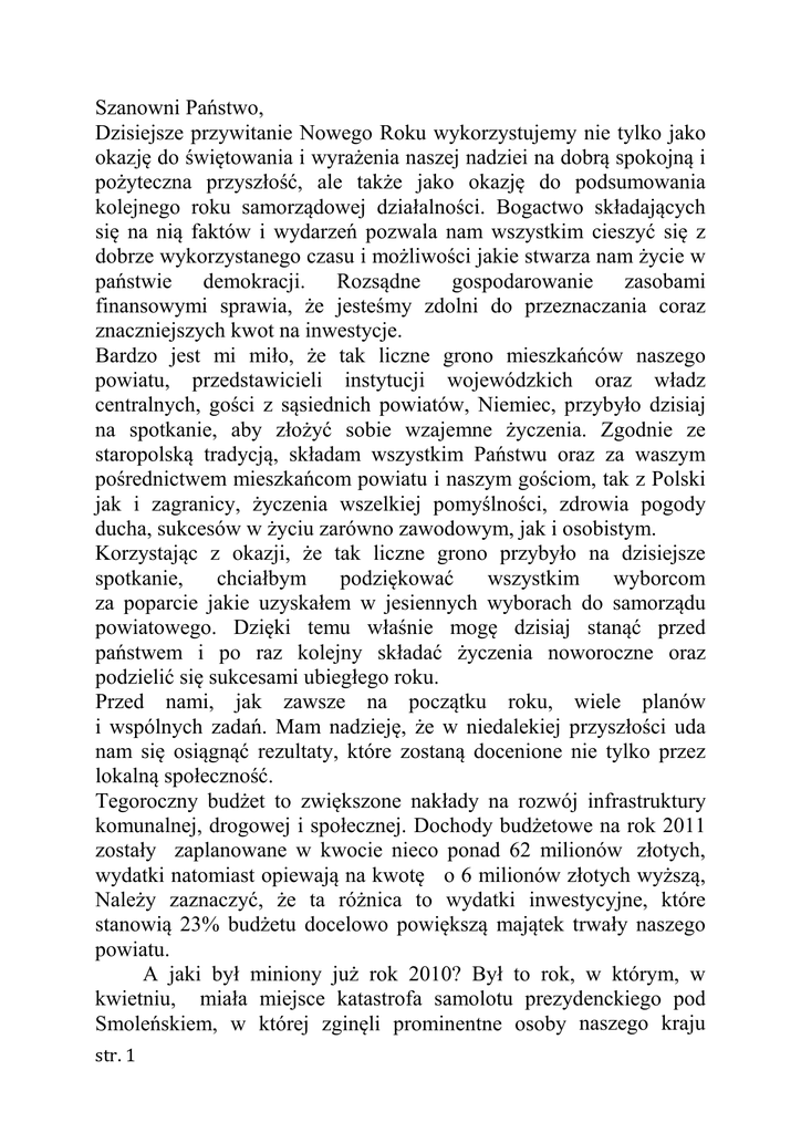 Szanowni Państwo, Dzisiejsze przywitanie Nowego Roku wykorzystujemy nie tylko jako okazję do świętowania i wyrażenia naszej nadziei na dobrą spokojną i pożyteczna przyszłość, ale także jako okazję do podsumowania kolejnego roku samorządowej działalności. Bogactwo składających się na nią faktów i wydarzeń pozwala nam wszystkim cieszyć się z dobrze wykorzystanego czasu i możliwości jakie stwarza nam życie w państwie demokracji. Rozsądne gospodarowanie zasobami finansowymi sprawia, że jesteśmy zdolni do przeznaczania coraz znaczniejszych kwot na inwestycje. Bardzo jest mi miło, że tak liczne grono mieszkańców naszego powiatu, przedstawicieli instytucji wojewódzkich oraz władz centralnych, gości z sąsiednich powiatów, Niemiec, przybyło dzisiaj na spotkanie, aby złożyć sobie wzajemne życzenia. Zgodnie ze staropolską tradycją, składam wszystkim Państwu oraz za waszym pośrednictwem mieszkańcom powiatu i naszym gościom, tak z Polski jak i zagranicy, życzenia wszelkiej pomyślności, zdrowia pogody ducha, sukcesów w życiu zarówno zawodowym, jak i osobistym. Korzystając z okazji, że tak liczne grono przybyło na dzisiejsze spotkanie, chciałbym podziękować wszystkim wyborcom za poparcie jakie uzyskałem w jesiennych wyborach do samorządu powiatowego. Dzięki temu właśnie mogę dzisiaj stanąć przed państwem i po raz kolejny składać życzenia noworoczne oraz podzielić się sukcesami ubiegłego roku. Przed nami, jak zawsze na początku roku, wiele planów i wspólnych zadań. Mam nadzieję, że w niedalekiej przyszłości uda nam się osiągnąć rezultaty, które zostaną docenione nie tylko przez lokalną społeczność. Tegoroczny budżet to zwiększone nakłady na rozwój infrastruktury komunalnej, drogowej i społecznej. Dochody budżetowe na rok 2011 zostały zaplanowane w kwocie nieco ponad 62 milionów złotych, wydatki natomiast opiewają na kwotę o 6 milionów złotych wyższą, Należy zaznaczyć, że ta różnica to wydatki inwestycyjne, które stanowią 23% budżetu docelowo powiększą majątek trwały naszego powiatu. A jaki był miniony już rok 2010? Był to rok, w którym, w kwietniu, miała miejsce katastrofa samolotu prezydenckiego pod Smoleńskiem, w której zginęli prominentne osoby naszego kraju str. 1 z Prezydentem Lechem Kaczyńskim na czele. We wrześniu w Schnoenefeld pod Berlinem 13 osób straciło życie w wypadku polskiego autokaru. I tutaj w tym miejscu chciałbym serdecznie podziękować Staroście Staphanowi Loge oraz Wicestarosście Wolfgangowi Schmidtowi i ich współpracownikom za osobiste zaangażowanie w pomoc ofiarom tragicznego wypadku Poza tym rok 2010 obfitował w wiele innych ważnych wydarzenia na świecie, w Polsce i w naszej lokalnej społeczności. Jako samorząd powiatowy podjęliśmy zrealizowaliśmy kilka ważnych inwestycji takich jak: - rozpoczęcie budowy zakładu pielęgnacyjno – opiekuńczego i przychodni lekarza rodzinnego przy Samodzielnym Publicznym Zakładzie Opieki Zdrowotnej w Wolsztynie, - pozyskaliśmy środki finansowe w wysokości ponad 1 miliona 400 tysięcy PLN na budowę Warsztatów Terapii zajęciowej przy Zespole Szkół Specjalnych – rozpoczęto budowę . - przebudowano drogę powiatową w miejscowości Stara Tuchorza, - zakończono inwestycję rozpoczętą w 2009 roku na drodze Stary Widzim – Kębłowo – Świętno z udziałem środków unijnych, - wybudowano ciąg pieszo – rowerowy w ciągu drogi powiatowej Bucz – Boszkowo, - wybudowano chodnik w ciągu drogi powiatowej w miejscowości Jaromierz, – ruszyła przebudowa wiaduktu drogowego w ciągu drogi powiatowej w miejscowości Adamowo, gdzie zaangażowane były środki pozyskane z Ministerstwa Infrastruktury, - wyremontowano 15 letni stadion lekkoatletyczny z bieżnią o nawierzchni tartanowej przy Zespole Szkól Rolniczych i technicznych w Powodowie, – ważną inwestycją dla turystyki naszego powiatu była budowa małej infrastruktury turystycznej i odnowienie śluzy na rzece Dojcy – w tym przypadku korzystaliśmy z pomocy finansowej Urzędu Marszałkowskiego. Jeśli chodzi o inwestycje na infrastrukturę prosportową nasz powiat w 2010 roku zajął IV miejsce w kraju i I w Wielkopolsce. Ogółem na inwestycje pozyskaliśmy około 6 milionów złotych środków pozabudżetowych. str. 2 Realizacja powyższych inwestycji oraz wielu innych działań realizowanych przez samorząd powiatowy była możliwa dzięki bardzo dobrej współpracy z samorządem Województwa Wielkopolskiego oraz administracją rządową na szczeblu województwa za co w tym miejscu składam podziękowania. W roku 2010 nasz powiat jako jedyny w Wielkopolskce został wyróżniony statuetką „LAURUS AUREUS” (Złoty Laur) oraz specjalnym dyplomem „SUMMA CUM LAUDE” (z najwyższą pochwałą) za działalność na rzecz przetwórstwa. W rankingu Związku Powiatów Polskich w kategorii energia odnawialna Powiat Wolsztyński zajął wysokie szóstce miejsce W zeszłym roku udało nam się zorganizować wiele imprez kulturalnych o charakterze cyklicznym takich jak, spotkanie noworoczne, koncert wiedeński, charytatywny koncert z okazji Dnia Kobiet, dożynki powiatowe, Międzynarodowy Plener Malarski. Po raz drugi w Powiecie Wolsztyńskim odbyły się Muzyczne Dni Powiatu podczas których świętowaliśmy jubileusz 10- lecia współpracy z Powiatem Dahme - Spreewald. Dużym zainteresowaniem cieszył się zorganizowany w sierpniu, przy ogromnym zaangażowaniu sponsorów, Koncert Wiesława Prządki i Przyjaciół. Zgromadził on w parku miejskim liczną publiczność, która przez prawie trzy godzina bawiła się słuchając muzyki w wykonaniu wielu znakomitych artystów, takich jak Grażyna Brodzińska, Zbigniew Wodecki, Justyna Szafran, Jacek i Patrycja Kotlarscy a przede wszystkim Wiesława Prządki. Wspomnę tylko jeszcze, iż Patrycji i Jacka Kotlarskich będziemy mogli posłuchać jeszcze podczas dzisiejszego wieczoru. 