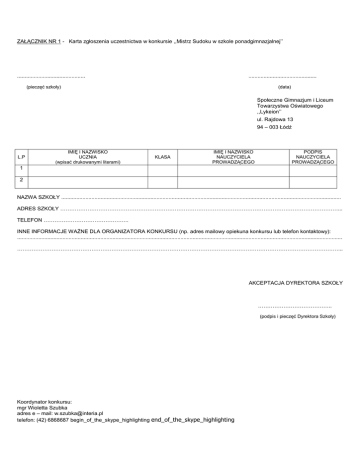 ZAŁĄCZNIK NR 1 - Karta zgłoszenia uczestnictwa w konkursie ,,Mistrz Sudoku w szkole ponadgimnazjalnej’’ ............................................. ............................................. (pieczęć szkoły) (data) Społeczne Gimnazjum i Liceum Towarzystwa Oświatowego ,,Lykeion’’ ul. Rajdowa 13 94 – 003 Łódź L.P IMIĘ I NAZWISKO UCZNIA (wpisać drukowanymi literami) KLASA IMIĘ I NAZWISKO NAUCZYCIELA PROWADZĄCEGO PODPIS NAUCZYCIELA PROWADZĄCEGO 1 2 NAZWA SZKOŁY ......................................................................................................................................................................................... ADRES SZKOŁY ………………………………………………………………………………………………………………………………………... TELEFON ……………………………………….. INNE INFORMACJE WAśNE DLA ORGANIZATORA KONKURSU (np. adres mailowy opiekuna konkursu lub telefon kontaktowy): ....................................................................................................................................................................................................................... ……………………………………………………………………………………………………………………………………………………………... AKCEPTACJA DYREKTORA SZKOŁY ………………………………….. (podpis i pieczęć Dyrektora Szkoły) Koordynator konkursu: mgr Wioletta Szubka adres e – mail: [email protected] telefon: (42) 6868687 begin_of_the_skype_highlighting end_of_the_skype_highlighting