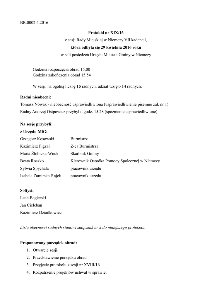 BR.0002.4.2016 Protokół nr XIX/16 z sesji Rady Miejskiej w Niemczy VII kadencji, która odbyła się 29 kwietnia 2016 roku w sali posiedzeń Urzędu Miasta i Gminy w Niemczy Godzina rozpoczęcia obrad 15.00 Godzina zakończenia obrad 15.54 W sesji, na ogólną liczbę 15 radnych, udział wzięło 14 radnych. Radni nieobecni: Tomasz Nowak - nieobecność usprawiedliwiona (usprawiedliwienie pisemne zał. nr 1) Radny Andrzej Osipowicz przybył o godz. 15.28 (spóźnienie usprawiedliwione) Na sesję przybyli: z Urzędu MiG: Grzegorz Kosowski Burmistrz Kazimierz Figzał Z-ca Burmistrza Beata Roszko Kierownik Ośrodka Pomocy Społecznej w Niemczy Izabela Zamirska-Rajek pracownik urzędu Marta Żłobicka-Wnuk Sylwia Spychała Skarbnik Gminy pracownik urzędu Sołtysi: Lech Begierski Jan Cieleban Kazimierz Dziadkowiec Lista obecności radnych stanowi załącznik nr 2 do niniejszego protokołu. Proponowany porządek obrad: 1. Otwarcie sesji. 2. Przedstawienie porządku obrad. 3. Przyjęcie protokołu z sesji nr XVIII/16. 4. Rozpatrzenie projektów uchwał w sprawie: 1) uchwalenia zmiany „Studium uwarunkowań i kierunków zagospodarowania przestrzennego miasta i gminy Niemcza”; 2) uchwalenia Gminnego Programu Wspierania Rodziny na lata 2016-2019; 3) uchwalenia Gminnego Programu Przeciwdziałania Przemocy w Rodzinie oraz Ochrony Ofiar Przemocy w Rodzinie na lata 2016-2019; 4) dokonania zmian w budżecie Miasta i Gminy Niemcza na 2016 rok. 5. Sprawozdanie z realizacji Rocznego programu współpracy z organizacjami pozarządowymi. 6. Ośrodek Pomocy Społecznej w Niemczy: 1) sprawozdanie z działalności za 2015 rok; 2) Ocena Zasobów Pomocy Społecznej za 2015 rok; 7. Informacja z pracy międzysesyjnej Burmistrza. 8. Interpelacje i zapytania radnych. 9. Wolne wnioski i informacje. 10. Wolne wnioski i informacje sołtysów. 11. Zamknięcie sesji. Ad 1. Przewodnicząca Rady Miejskiej w Niemczy o godz. 15.00 otworzyła sesję, powitała wszystkich przybyłych i na podstawie listy obecności stwierdziła kworum obrad. Ad 2. Uwag do porządku obrad nie zgłoszono. Ad 3. Protokół z sesji nr XVIII/16został przyjęty przez aklamację. Ad 4. Radni przystąpili dorozpatrzenie projektów uchwał w sprawie: 1)uchwalenia zmiany „Studium uwarunkowań i kierunków zagospodarowania przestrzennego miasta i gminy Niemcza”(zał. nr 3); Radni nie wnieśli uwag do projektu, któryuzyskał pozytywną opinię połączonych Komisji Rady Miejskiej podczas ostatniego posiedzenia. Przewodnicząca zarządziła głosowanie. Rada Miejska w Niemczy w obecności 13 radnych – 13 głosami „ za” podjęła uchwałę nr XIX/93/16 w sprawie uchwalenia zmiany „Studium uwarunkowań i kierunków zagospodarowania przestrzennego miasta i gminy Niemcza”(zał. nr 4). 2) uchwalenia Gminnego Programu Wspierania Rodziny na lata 2016-2019(zał. nr 5); Projekt uchwały uzyskałpozytywną opinię połączonych Komisji Rady Miejskiej podczas ostatniego posiedzenia. Radni nie wnieśli uwag. Przewodnicząca zarządziła głosowanie. Rada Miejska w Niemczy w obecności 13 radnych – 13 głosami „ za” podjęła uchwałę nr XIX/94/16 w sprawie uchwalenia Gminnego Programu Wspierania Rodziny na lata 20162019(zał. nr 6). 3) uchwalenia Gminnego Programu Przeciwdziałania Przemocy w Rodzinie oraz Ochrony Ofiar Przemocy w Rodzinie na lata 2016-2019 (zał. nr 7); Radni nie wnieśli uwag do projektu, któryuzyskał pozytywną opinię połączonych Komisji Rady Miejskiej podczas ostatniego posiedzenia. Przewodnicząca zarządziła głosowanie. Rada Miejska w Niemczy w obecności 13 radnych – 13 głosami „ za” podjęła uchwałę nr XIX/95/16 w sprawie uchwalenia Gminnego Programu Przeciwdziałania Przemocy w Rodzinie oraz Ochrony Ofiar Przemocy w Rodzinie na lata 2016-2019(zał. nr 8). 4) dokonania zmian w budżecie Miasta i Gminy Niemcza na 2016 rok (zał. nr 9); Przewodnicząca odczytała wniesioną przez Burmistrza poprawkę do projektu uchwały dotycząca § 7 i 9 (zał. nr 10). Skarbnik Gminy przeprosiła i wyjaśniła pomyłkę. Przewodnicząca zarządziła głosowanie nad wprowadzeniem poprawek do projektu. Rada Miejska w Niemczyw obecności 13 radnych – 13 głosami „ za” przyjęła poprawki do projektu uchwaływ sprawie dokonania zmian w budżecie Miasta i Gminy Niemcza na 2016 rok. Następnie zarządziła głosowanie projektu, który przy 1 głosie „przeciw” i 3 głosach „wstrzymującym się”, uzyskałpozytywną opinię połączonych Komisji Rady Miejskiej podczas ostatniego posiedzenia. Rada Miejska w Niemczy w obecności 13 radnych – 11 głosami „ za” i przy 2 głosach „wstrzymujących się” podjęła uchwałę nr XIX/96/16 w sprawie dokonania zmian w budżecie Miasta i Gminy Niemcza na 2016 rok (zał. nr 11). o godz. 15.09 salę posiedzeń opuścił Radny Jarosław Dydo Ad 5. Burmistrz oddał głos Pani Izabeli Zamirskiej-Rajek, pracownikowi merytorycznemu w sprawach współpracy z organizacjami pozarządowymi. Radni nie mieli uwag do przedstawionego Sprawozdania z realizacji Rocznego programu współpracy z organizacjami pozarządowymi (zał. nr 12). o godz. 15.13 na salę posiedzeń wrócił Radny Jarosław Dydo Ad 6. Ośrodek Pomocy Społecznej w Niemczy: 1) Pani Beata Roszko, Kierownik Ośrodka Pomocy Społecznej w Niemczy, przedstawiła sprawozdanie z działalności Ośrodka Pomocy Społecznej w Niemczy za 2015 rok (zał. nr 13). Omówiła strukturę, stan zatrudnienia oraz zakres działalności ośrodka. Radni poruszyli temat opłat za pobyty podopiecznych w domach pomocy społecznej i domach dziecka. Pani Kierownik omówiła także realizację programu 500 plus. o godz. 15.28 na sesję przybył Radny Andrzej Osipowicz 2) Radni nie mieli uwag do informacji sporządzonych przez Kierownika Ośrodka Pomocy Społecznej w Niemczy Panią Beatę Roszko. Przewodnicząca zarządziła głosowanie. Rada Miejska w Niemczy w obecności 14 radnych – 14 głosami „ za” przyjęła Ocenę zasobów 
