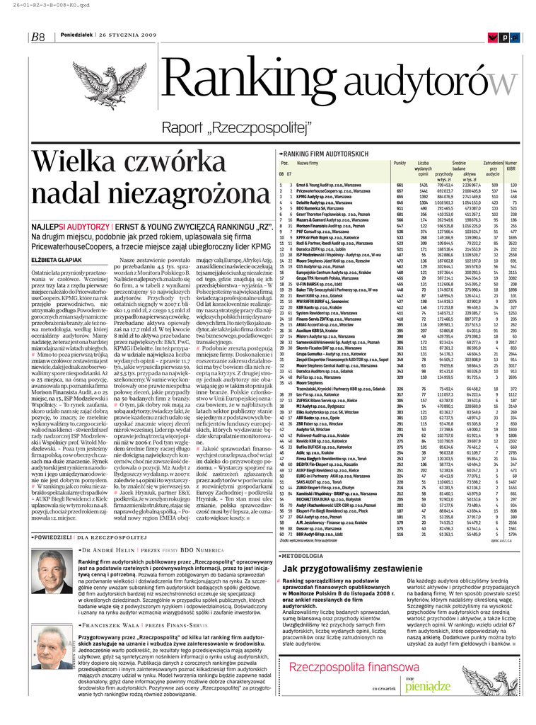 26-01-RZ-3-B-008-KO.qxd B8 Poniedziałek | 26 stycznia 2009 ◊ rp .pl Ranking audytorów Raport „Rzeczpospolitej” Wielka czwórka nadal niezagrożona NAJLEPSI AUDYTORZY | ERNST & YOUNG ZWYCIĘZCĄ RANKINGU „RZ”. Na drugim miejscu, podobnie jak przed rokiem, uplasowała się firma PricewaterhouseCoopers, a trzecie miejsce zajął ubiegłoroczny lider KPMG ELŻBIETA GLAPIAK Ostatnie lata przyniosły przetasowania w czołówce. Wcześniej przez trzy lata z rzędu pierwsze miejsce należało do PricewaterhouseCoopers. KPMG, które na rok przejęło przewodnictwo, nie utrzymało go długo. Powodem tegorocznych zmian są dynamiczne przeobrażenia branży, ale też nowa metodologia, według której ocenialiśmy audytorów. Mamy nadzieję, że teraz jest ona bardziej miarodajna niż w latach ubiegłych. # Mimo to poza pierwszą trójką zmian w czołówce zestawienia jest niewiele, dalej jednak zaobserwowaliśmy spore niespodzianki. Aż o 23 miejsca, na ósmą pozycję, awansowała np. poznańska firma Morison Finansista Audit, a o 25 miejsc, na 13., ISP Modzelewski i Wspólnicy. – To rynek zaufania, skoro udało nam się zająć dobrą pozycję, to znaczy, że rzetelnie wykonywaliśmy to, czego oczekiwali od nas klienci – stwierdził szef rady nadzorczej ISP Modzelewski i Wspólnicy prof. Witold Modzelewski. – Poza tym jesteśmy firmą polską, co w obecnych czasach ma duże znaczenie. Rynek audytorski jest rynkiem narodowym i jego umiędzynarodowienie nie jest dobrym pomysłem. # W rankingu jak co roku nie zabrakło spektakularnych spadków – AUKP Biegli Rewidenci z Kielc uplasowała się w tym roku na 48. pozycji, chociaż przed rokiem zajmowała 12. miejsce. Nasze zestawienie powstało po przebadaniu 4,5 tys. sprawozdań z Monitora Polskiego B. Na liście najlepszych znalazło się 60 firm, a w tabeli z wynikami prezentujemy 50 największych audytorów. Przychody tych ostatnich sięgnęły w 2007 r. blisko 1,9 mld zł, z czego 1,5 mld zł przypadło na pierwszą czwórkę. Przebadane aktywa opiewały zaś na 17,7 mld zł. W tej kwocie 8 mld zł to aktywa przebadane przez największych: E&Y, PwC, KPMG i Deloitte. Im też przypada w udziale największa liczba wydanych opinii – z prawie 11,7 tys., jakie wypuściła pierwsza 50, aż 5,5 tys. przypada na największe koncerny. W sumie więc kontrolowały one prawie niespełna połowę zleceń, jakie przypadły na 50 badanych firm z branży. # O tym, jak dobry rok mają za sobą audytorzy, świadczy fakt, że prawie każdemu z nich udało się uzyskać znacznie więcej zleceń niż rok wcześniej. Lider np. wydał o prawie jedną trzecią więcej opinii niż w 2006 r. Pod tym względem średnie firmy raczej długo nie dościgną największych koncernów, choć nie zawsze ilość decydowała o pozycji. M2 Audyt z Bydgoszczy wydała np. w 2007 r. zaledwie 14 opinii i to wystarczyło, by znaleźć się w pierwszej 50. # Jacek Hryniuk, partner E&Y, podkreśla, że w zeszłym roku jego firma zmieniła strukturę, stając się naprawdę globalną spółką. – Powstał nowy region EMEIA obej- mujący całą Europę, Afrykę i Azję, a nasi klienci na świecie oczekują tej samej jakości usług niezależnie od tego, gdzie znajdują się ich przedsiębiorstwa – wyjaśnia. – W Polsce jesteśmy największą firmą świadcząca profesjonalne usługi. Od lat konsekwentnie realizujemy naszą strategię pracy dla największych polskich i międzynarodowych firm. I to nie tylko jako audytor, ale także jako firma doradztwa biznesowego, podatkowego i transakcyjnego. # Podobnie zresztą postępują mniejsze firmy. Doskonalenie i rozszerzanie zakresu działalności ma być bowiem dla nich receptą na kryzys. Z drugiej strony jednak audytorzy nie obawiają się go w takim stopniu jak inne branże. Polskie członkostwo w Unii Europejskiej oznacza bowiem, że w najbliższych latach sektor publiczny stanie się jednym z podstawowych beneficjentów funduszy europejskich, których wydawanie będzie skrupulatnie monitorowane. # Jakość sprawozdań finansowych jest coraz lepsza, choć wciąż im daleko do przyzwoitego poziomu. – Wystarczy spojrzeć na ilość zastrzeżeń zgłaszanych przez audytorów w porównaniu z rozwiniętymi gospodarkami Europy Zachodniej – podkreśla Hryniuk. – Ten stan musi ulec zmianie, polska sprawozdawczość musi być lepsza, ale oznacza to większe koszty. ∑ >POWIEDZIELI | dla rzeczpospolitej >Dr André Helin | P R E Z E S F I R MY >RANKING FIRM AUDYTORSKICH Poz. Nazwa firmy Punkty 08 07 1 2 3 4 5 6 7 8 9 10 11 12 13 14 15 16 17 18 19 20 21 22 23 24 25 26 27 28 29 30 31 32 33 34 35 3 2 1 4 5 6 16 31 7 9 11 8 38 22 19 36 37 38 39 40 41 42 43 44 45 46 47 48 49 50 51 52 53 54 55 56 57 58 59 60 39 13 25 29 21 10 20 61 18 15 36 14 32 30 41 48 45 37 17 26 42 40 23 60 12 44 84 70 59 27 88 72 Ernst & Young Audit sp. z o.o., Warszawa PricewaterhouseCoopers sp. z o.o., Warszawa KPMG Audyty sp. z o.o., Warszawa Deloitte Audyt sp. z o.o., Warszawa BDO Numerica SA, Warszawa Grant Thornton Frąckowiak sp. z o.o., Poznań Mazars & Guerard Audyt sp. z o.o., Warszawa Morison Finansista Audit sp. z o.o., Poznań PKF Consult sp. z o.o., Warszawa KPFK dr Piotr Rojek sp. z o.o., Katowice Rodl & Partner, Roedl Audit sp. z o.o., Warszawa Doradca ZDFK sp. z o.o., Lublin ISP Modzelewski i Wspólnicy - Audyt sp. z o.o., W-wa Moore Stephens Józef Król sp. z o.o., Rzeszów CGS Audytor sp. z o.o., Poznań Europejskie Centrum Audytu sp. z o.o., Kraków Grupa TPA Horwath Polska, Warszawa U-FIN BAiRSK sp. z o.o., Łódź Baker Tilly Smoczyński i Partnerzy sp. z o.o., W-wa Rewit KiBR sp. z o.o., Gdańsk MW RAFIN BURiF s.j., Sosnowiec KBR Konto sp. z o.o., Kraków System Rewident sp. z o.o., Warszawa Finans-Servis ZDFK sp. z o.o., Warszawa AKiAG Accord'ab sp. z o.o., Wrocław Auxilium KBR SA, Kraków Misters Audytor sp. z o.o., Warszawa Sarnowski&Wiśniewski Sp. Audyt. sp. z o.o., Poznań Skonto-Ficadex BAF sp. z o.o., Warszawa Grupa Gumułka
