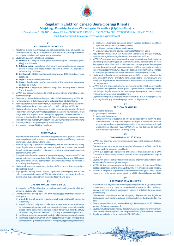 Regulamin Elektronicznego Biura Obsługi Klienta Miejskiego Przedsiębiorstwa Wodociągów i Kanalizacji Spółka Akcyjna ul. Senatorska 1, 30-106 Kraków, KRS nr 0000057956, REGON: 350720714, NIP: 6750000065, tel. 12 421 20 11 mail: [email protected], www.wodociagi.krakow.pl § 1. POSTANOWIENIA OGÓLNE 1. Regulamin określa zasady korzystania z Elektronicznego Biura Obsługi Klienta (zwanego dalej e-BOK), w szczególności zasad zakładania, udostępniania i wykorzystywania indywidualnego konta użytkownika. 2. Użyte w Regulaminie określenia oznaczają: 1) MPWiK S.A. – Miejskie Przedsiębiorstwo Wodociągów i Kanalizacji Spółka Akcyjna w Krakowie, 2) Odbiorca usług – osoba fizyczna lub prawna, która zawarła umowę o zaopatrzenie w wodę i/lub odprowadzania ścieków z MPWiK S.A., posiadająca indywidualny kod klienta, 3) Użytkownik – Odbiorca usług zarejestrowany w e-BOK, posiadający login oraz hasło, 4) Login – adres e-mail Użytkownika, 5) Hasło – kombinacja znaków zapewniająca Użytkownikowi wyłączność dostępu do e-BOK, 6) Regulamin – Regulamin Elektronicznego Biura Obsługi Klienta MPWiK S.A. w Krakowie. 3. MPWiK S.A. zapewnia dostęp do e-BOK poprzez stronę internetową ebok. mpwik.krakow.pl. 4. Założenie konta w e-BOK możliwe jest tylko dla Odbiorców usług MPWiK S.A. 5. Funkcjonowanie e-BOK nadzorowane jest przez Biuro Obsługi Klienta. 6. Administratorem danych osobowych, w rozumieniu ustawy z dnia 29 sierpnia 1997r. o ochronie danych osobowych (Dz.U.2015.2135), jest MPWiK S.A. 7. Użytkownik, akceptując Regulamin, wyraża zgodę na dostęp do informacji i opcji interaktywnych, który następuje (zgodnie z ustawą o świadczeniu usług drogą elektroniczną Dz.U.2013.1422) przez wysyłanie i odbieranie danych za pomocą systemów teleinformatycznych. Transmisja danych następuje za pośrednictwem sieci publicznych w rozumieniu Ustawy Prawo Telekomunikacyjne. 8. Transmisja danych odbywa się po łączu szyfrowanym. 9. Korzystanie z usług e-BOK jest bezpłatne. § 2. 3. 4. 5. 6. 7. 5) możliwość dokonania zgłoszenia sprawy według dostępnej klasyfikacji zgłoszeń, z możliwością przesłania plików, 6) możliwość podania wskazań wodomierzy, 7) wgląd w indywidualne powiadomienia dla Odbiorców usług. Posiadanie konta w e-BOK jest warunkiem skorzystania z usługi e-faktury, realizowanej zgodnie z Regulaminem udostępniania e-faktur. MPWiK S.A. zastrzega sobie prawo podejmowania decyzji o odstąpieniu od załatwienia sprawy wpływającej od Użytkownika drogą elektroniczną, na rzecz formy pisemnej, w zależności od treści zawartych w wystąpieniu. Rozpatrywanie wniosków zgłoszonych za pośrednictwem e-BOK, a wymagających zajęcia stanowiska przez MPWiK S.A., odbywa się zgodnie z Regulaminem Dostarczania Wody i Odprowadzania ścieków na terenie Gminy Miejskiej Kraków. Użytkownik zobowiązuje się do korzystania z e-BOK zgodnie z obowiązującymi przepisami prawa i przyjętymi normami społeczno – obyczajowymi oraz niniejszym Regulaminem. Użytkownik nie może dostarczać treści o charakterze bezprawnym. MPWiK S.A. ma prawo zablokować dostęp do konta e-BOK w przypadku stwierdzenia korzystania z niego przez Użytkownika w sposób sprzeczny z niniejszym Regulaminem lub obowiązującymi przepisami prawa i przyjętymi normami społeczno-obyczajowymi. Użytkownik ma prawo zrezygnować z korzystania z e-BOK w każdym czasie, w szczególności, gdy nie zaakceptuje zmian do Regulaminu. § 4. SPOSOBY PŁATNOŚCI Płatności można dokonać: 1) gotówką w kasie MPWiK S.A., 2) przelewem bankowym, 3) kartą kredytową w systemie on-line za pośrednictwem PayU, na zasadach określonych w regulaminie płatności PayU, przelewem bankowym w systemie on-line za pośrednictwem PayU, na zasadach określonych w regulaminie płatności PayU. MPWiK S.A. nie ma dostępu do żadnych danych dotyczących konta Odbiorcy usług. REJESTRACJA § 5. 1. Rejestracji do e-BOK można dokonać drogą elektroniczną, poprzez stronę internetową ebok.mpwik.krakow.pl., po otrzymaniu pierwszej faktury za dostarczoną wodę i/lub odprowadzone ścieki. 2. Podczas rejestracji Użytkownik zobowiązany jest do zaakceptowania niniejszego Regulaminu, wyrażając tym samym zgodę na przetwarzanie swoich danych osobowych, w celach związanych z realizacją usług świadczonych za pośrednictwem e-BOK. 3. Po wypełnieniu formularza rejestracyjnego dostępnego na stronie e-BOK, następuje automatyczne przesłanie linku aktywującego konto w e-BOK na podany adres email. W celu potwierdzenia dokonania rejestracji, należy kliknąć w przesłany link aktywujący. 4. Użytkownik może rozpocząć korzystanie z e-BOK po użyciu linku aktywującego zgodnie z pkt 3). 5. W przypadku zmiany adresu e-mail, Użytkownik zobowiązany jest do niezwłocznego powiadomienia MPWiK S.A. o tym fakcie, z zachowaniem formy pisemnej lub za pośrednictwem funkcji dostępnych w e-BOK. ODPOWIEDZIALNOŚĆ STRON 1. MPWiK S.A. podejmie wszelkie działania, aby zapewnić poprawne działanie serwisu e-BOK. 2. Zaktualizowane informacje/dane mogą być dostępne w e-BOK z opóźnieniem, ze względu na proces weryfikacji. 3. MPWiK S.A. zastrzega sobie prawo zmiany zasad funkcjonowania e-BOK. O zmianach Użytkownicy zostaną powiadomieni drogą elektroniczną lub na piśmie. 4. Użytkownik ponosi pełną odpowiedzialność za błędnie wprowadzone dane we wniosku/formularzu zgłoszeniowym. 5. MPWiK S.A. jest zobowiązana do zablokowania dostępu do konta w e-BOK na każde zgłoszenie dokonane przez Użytkownika w formie pisemnego wniosku. 6. MPWiK S.A. nie ponosi odpowiedzialności za skutki wynikające z użycia loginu i hasła przez osoby trzecie oraz za sposób, w jaki Użytkownik korzysta z e-BOK. § 3. POSTANOWIENIA KOŃCOWE ZASADY KORZYSTANIA Z E-BOK 1. W sprawach nie uregulowanych w niniejszym Regulaminie mają zastosowanie obowiązujące przepisy prawa, w szczególności przepisy kodeksu cywiln