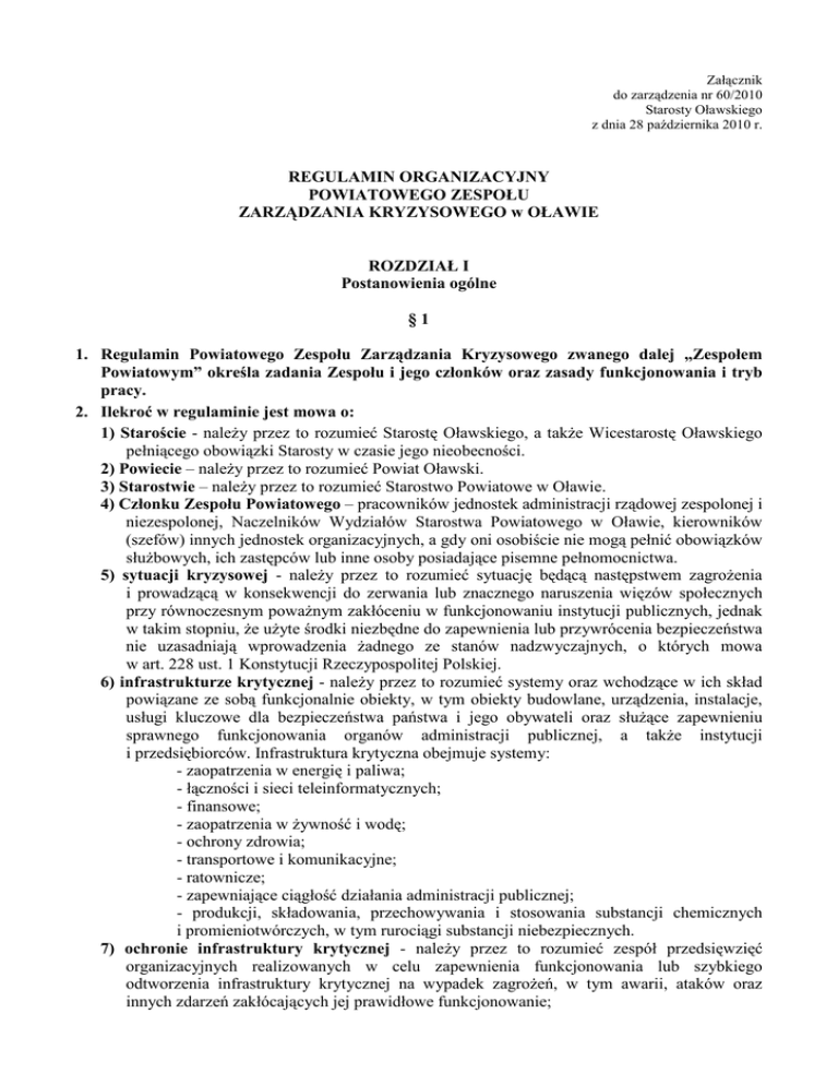 Załącznik do zarządzenia nr 60/2010 Starosty Oławskiego z dnia 28 października 2010 r. REGULAMIN ORGANIZACYJNY POWIATOWEGO ZESPOŁU ZARZĄDZANIA KRYZYSOWEGO w OŁAWIE ROZDZIAŁ I Postanowienia ogólne §1 1. Regulamin Powiatowego Zespołu Zarządzania Kryzysowego zwanego dalej „Zespołem Powiatowym” określa zadania Zespołu i jego członków oraz zasady funkcjonowania i tryb pracy. 2. Ilekroć w regulaminie jest mowa o: 1) Staroście - należy przez to rozumieć Starostę Oławskiego, a także Wicestarostę Oławskiego pełniącego obowiązki Starosty w czasie jego nieobecności. 2) Powiecie – należy przez to rozumieć Powiat Oławski. 3) Starostwie – należy przez to rozumieć Starostwo Powiatowe w Oławie. 4) Członku Zespołu Powiatowego – pracowników jednostek administracji rządowej zespolonej i niezespolonej, Naczelników Wydziałów Starostwa Powiatowego w Oławie, kierowników (szefów) innych jednostek organizacyjnych, a gdy oni osobiście nie mogą pełnić obowiązków służbowych, ich zastępców lub inne osoby posiadające pisemne pełnomocnictwa. 5) sytuacji kryzysowej - należy przez to rozumieć sytuację będącą następstwem zagrożenia i prowadzącą w konsekwencji do zerwania lub znacznego naruszenia więzów społecznych przy równoczesnym poważnym zakłóceniu w funkcjonowaniu instytucji publicznych, jednak w takim stopniu, że użyte środki niezbędne do zapewnienia lub przywrócenia bezpieczeństwa nie uzasadniają wprowadzenia żadnego ze stanów nadzwyczajnych, o których mowa w art. 228 ust. 1 Konstytucji Rzeczypospolitej Polskiej. 6) infrastrukturze krytycznej - należy przez to rozumieć systemy oraz wchodzące w ich skład powiązane ze sobą funkcjonalnie obiekty, w tym obiekty budowlane, urządzenia, instalacje, usługi kluczowe dla bezpieczeństwa państwa i jego obywateli oraz służące zapewnieniu sprawnego funkcjonowania organów administracji publicznej, a także instytucji i przedsiębiorców. Infrastruktura krytyczna obejmuje systemy: - zaopatrzenia w energię i paliwa; - łączności i sieci teleinformatycznych; - finansowe; - zaopatrzenia w żywność i wodę; - ochrony zdrowia; - transportowe i komunikacyjne; - ratownicze; - zapewniające ciągłość działania administracji publicznej; - produkcji, składowania, przechowywania i stosowania substancji chemicznych i promieniotwórczych, w tym rurociągi substancji niebezpiecznych. 7) ochronie infrastruktury krytycznej - należy przez to rozumieć zespół przedsięwzięć organizacyjnych realizowanych w celu zapewnienia funkcjonowania lub szybkiego odtworzenia infrastruktury krytycznej na wypadek zagrożeń, w tym awarii, ataków oraz innych zdarzeń zakłócających jej prawidłowe funkcjonowanie; 8) planowaniu cywilnym - należy przez to rozumieć: - całokształt przedsięwzięć organizacyjnych, polegających na opracowywaniu planów, w tym planów reagowania kryzysowego, i programów, mających na celu optymalne wykorzystanie dostępnych sił i środków w sytuacjach kryzysowych oraz w czasie stanów nadzwyczajnych i w czasie wojny, w zakresie zapobiegania sytuacjom kryzysowym, przygotowania do przejmowania nad nimi kontroli, reagowania w sytuacjach kryzysowych oraz odtwarzania infrastruktury i przywracania jej pierwotnego charakteru; - planowanie w zakresie wspierania Sił Zbrojnych Rzeczypospolitej Polskiej w razie ich użycia oraz planowanie wykorzystania Sił Zbrojnych Rzeczypospolitej Polskiej do realizacji zadań z zakresu zarządzania kryzysowego. §2 1. Zespół Powiatowy działa na podstawie: 1) Ustawy z dnia 26 kwietnia 2007 r. o zarządzaniu kryzysowym (Dz. U Nr 89, poz.590); 2) Ustawy z dnia 18 kwietnia 2002 r. o stanie klęski żywiołowej (Dz. U. Nr 62, poz. 558 z póź. zm.); 3) Zarządzenia Nr.55/2007 Starosty Oławskiego z dnia 31 sierpnia 2007r. w sprawie powołania Powiatowego Zespołu Zarządzania Kryzysowego; 4) Niniejszego regulaminu; 5) Rocznego planu pracy. ROZDZIAŁ II Skład Powiatowego Zespołu Zarządzania Kryzysowego /PZZK/ §3 1. Skład Powiatowego Zespołu Zarządzania Kryzysowego: 1) Szef Zespołu Powiatowego – Starosta Oławski; 2)Zastępca Szefa Zespołu Powiatowego - Inspektor ds. Obronnych i Zarządzania Kryzysowego Kierownik Powiatowego Centrum Zarządzania Kryzysowego; 3) Zastępca Szefa Zespołu Powiatowego – Komendant Powiatowy Państwowej Straży Pożarnej w Oławie; 4) Grupy Robocze o charakterze stałym: a) Grupa Planowania Cywilnego; b) Grupa Monitorowania, Prognoz i Analiz. 5) Grupy robocze o charakterze czasowym: a) Grupa Operacji; b) Grupa Zabezpieczenia Logistycznego; c) Grupa Opieki Zdrowotnej i Pomocy Socjalno - Bytowej. 2. Grupa Planowania Cywilnego składa się z: 1) pracownika Powiatowego Centrum Zarządzania Kryzysowego - przewodniczący; 2) pracownika Wydziału Organizacyjnego Starostwa; 3) pracownika Wydziału Ochrony Środowiska Starostwa; 4) radcy prawnego. 3. Szef Zespołu Powiatowego może uzupełnić skład grupy, o której mowa w ust. 2, poprzez zaproszenie do udziału w jej pracach po jednym przedstawicielu: - Komendy Powiatowej Policji; - Komendy Powiatowej Państwowej Straży Pożarnej; - Wojskowej Komendy Uzupełnień; - Powiatowej Stacji Sanitarno - Epidemiologicznej; - Powiatowego Inspektoratu Weterynarii; - Powiatowego Inspektoratu Nadzoru Budowlanego; - innych jednostek administracji, służb, inspekcji, straży. 4. Grupy Monitorowania, Prognoz i Analiz składa się z: 1) Naczelnika Wydziału Komendy Powiatowej Państwowej Straży Pożarnej w Oławie przewodniczący; 2) służby dyżurnej Powiatowego Stanowiska Kierowania, funkcjonariuszy wyznaczonych przez Komendanta Powiatowego PSP. 5. Szef Zespołu Powiatowego może uzupełnić skład grupy, o której mowa w ust. 4, o pracowników: - Starostwa Powiatowego; - Komendy Powiatowej Policji; - Powiatowego Centrum Zarządzania Kryzysowego; - Powiatowej Stacji Sanitarno - Epidemiologicznej; - innych służb, straży i inspekcji. 6. Grupa Operacji skł