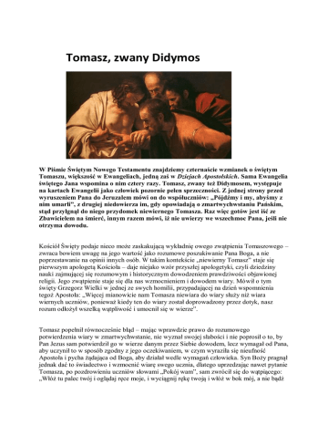 Tomasz, zwany Didymos W Piśmie Świętym Nowego Testamentu znajdziemy czternaście wzmianek o świętym Tomaszu, większość w Ewangeliach, jedną zaś w Dziejach Apostolskich. Sama Ewangelia świętego Jana wspomina o nim cztery razy. Tomasz, zwany też Didymosem, występuje na kartach Ewangelii jako człowiek pozornie pełen sprzeczności. Z jednej strony przed wyruszeniem Pana do Jeruzalem mówi on do współuczniów: „Pójdźmy i my, abyśmy z nim umarli”, z drugiej niedowierza im, gdy opowiadają o zmartwychwstaniu Pańskim, stąd przylgnął do niego przydomek niewiernego Tomasza. Raz więc gotów jest iść ze Zbawicielem na śmierć, innym razem mówi, iż nie uwierzy we wszechmoc Pana, jeśli nie otrzyma dowodu. Kościół Święty podaje nieco może zaskakującą wykładnię owego zwątpienia Tomaszowego – zwraca bowiem uwagę na jego wartość jako rozumowe poszukiwanie Pana Boga, a nie poprzestawanie na opinii innych osób. W takim kontekście „niewierny Tomasz” staje się pierwszym apologetą Kościoła – daje niejako wzór przyszłej apologetyki, czyli dziedziny nauki zajmującej się rozumowym i historycznym dowodzeniem prawdziwości objawionej religii. Jego zwątpienie staje się dla nas wzmocnieniem i dowodem wiary. Mówił o tym święty Grzegorz Wielki w jednej ze swych homilii, przypadającej na dzień wspomnienia tegoż Apostoła: „Więcej mianowicie nam Tomasza niewiara do wiary służy niż wiara wiernych uczniów, ponieważ kiedy ten do wiary został doprowadzony przez dotyk, nasz rozum odłożył wszelką wątpliwość i umocnił się w wierze”. Tomasz popełnił równocześnie błąd – mając wprawdzie prawo do rozumowego potwierdzenia wiary w zmartwychwstanie, nie wyznał swojej słabości i nie poprosił o to, by Pan Jezus sam potwierdził go w wierze danym przez Siebie dowodem, lecz wymagał od Pana, aby uczynił to w sposób zgodny z jego oczekiwaniem, w czym wyraziła się nieufność Apostoła i pycha żądająca od Boga, aby działał wedle wymagań człowieka. Syn Boży pragnął jednak dać to świadectwo i wzmocnić wiarę swego ucznia, dlatego uprzedzając nawet pytanie Tomasza, po pozdrowieniu uczniów słowami „Pokój wam”, sam zwrócił się do wątpiącego: „Włóż tu palec twój i oglądaj ręce moje, i wyciągnij rękę twoją i włóż w bok mój, a nie bądź niewierny, ale wierny”, na co przekonany uczeń odpowiedział słynnymi słowami: „Pan mój i Bóg mój” stanowiącymi wyznanie Bóstwa Chrystusowego i prawdziwości Jego nauczania. O działalności apostoła Tomasza po zesłaniu Ducha Świętego dowiadujemy się już z podań Tradycji. Pisał o nim autor Historii kościelnej (Historia Ecclesiastica), a także Ojcowie Kościoła (Klemens aleksandryjski, Grzegorz z Nazjanzu, Hieronim), pisarze kościelni na czele z Tertulianem czy chociażby święty Paulin z Noli. Źródła te informują, iż Święty wyruszył podobnie jak inni uczniowie, by w odległych krajach głosić Dobrą Nowinę zmartwychwstałego Chrystusa. Miał się znaleźć w kraju Partów (obecny Iran) i wśród sąsiednich ludów (Medów, Persów i innych). Informacje o ostatnich latach i o męczeńskiej śmierci Didymosa uzupełniają źródła apokryficzne, wspominane w dawnych źródłach kościelnych. Ostatnim miejscem, w jakim Apostoł głosił Ewangelię, chrzcił i rozszerzał Królestwo Jezusowe, miały być Indie. Odwodząc coraz większe rzesze od bałwochwalstwa, Tomasz naraził się miejscowemu władcy i został przez niego zgładzony. Chrześcijańska ludność Indii czci do dziś Apostoła jako swego patrona, a miejscem pielgrzymek związanym z jego kultem jest Calamina, czyli góra świętego Tomasza położona na przedmieściach miasta Madras – tam wedle miejscowych podań Święty miał zginąć śmiercią męczeńską. W polskiej tradycji Tomasz zapisał się jako patron Zamościa i został umieszczony w herbie miasta. Kościół wspomina św. Tomasza Apostoła 3 lipca.