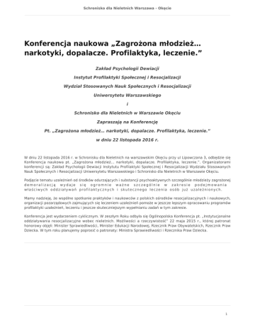 Schronisko dla Nieletnich Warszawa - Okęcie Konferencja naukowa „Zagrożona młodzież… narkotyki, dopalacze. Profilaktyka, leczenie.” Zakład Psychologii Dewiacji Instytut Profilaktyki Społecznej i Resocjalizacji Wydział Stosowanych Nauk Społecznych i Resocjalizacji Uniwersytetu Warszawskiego i Schronisko dla Nieletnich w Warszawie Okęciu Zapraszają na Konferencję Pt. „Zagrożona młodzież… narkotyki, dopalacze. Profilaktyka, leczenie.” w dniu 22 listopada 2016 r. W dniu 22 listopada 2016 r. w Schronisku dla Nieletnich na warszawskim Okęciu przy ul Lipowczana 3, odbędzie się Konferencja naukowa pt. „Zagrożona młodzież… narkotyki, dopalacze. Profilaktyka, leczenie.”. Organizatorami konferencji są: Zakład Psychologii Dewiacji Instytutu Profilaktyki Społecznej i Resocjalizacji Wydziału Stosowanych Nauk Społecznych i Resocjalizacji Uniwersytetu Warszawskiego i Schronisko dla Nieletnich w Warszawie Okęciu. Podjęcie tematu uzależnień od środków odurzających i substancji psychoaktywnych szczególnie młodzieży zagrożonej demoralizacją wydaje się ogromnie ważne szczególnie w zakresie podejmowania właściwych oddziaływań profilaktycznych i skutecznego leczenia osób już uzależnionych. Mamy nadzieję, że wspólne spotkanie praktyków i naukowców z polskich ośrodków resocjalizacyjnych i naukowych, organizacji pozarządowych zajmujących się leczeniem uzależnień pomoże w jeszcze lepszym opracowaniu programów profilaktyki uzależnień, leczeniu i jeszcze skuteczniejszym wypełnianiu zadań w tym zakresie. Konferencja jest wydarzeniem cyklicznym. W zeszłym Roku odbyła się Ogólnopolska Konferencja pt. „Instytucjonalne oddziaływania resocjalizacyjne wobec nieletnich. Możliwości a rzeczywistość” 22 maja 2015 r., której patronat honorowy objęli: Minister Sprawiedliwości, Minister Edukacji Narodowej, Rzecznik Praw Obywatelskich, Rzecznik Praw Dziecka. W tym roku planujemy poprosić o patronaty: Ministra Sprawiedliwości i Rzecznika Praw Dziecka. 1