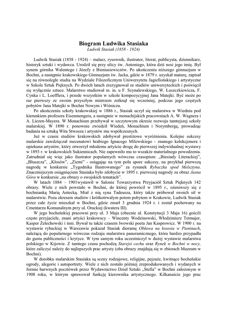 Biogram Ludwika Stasiaka Ludwik Stasiak (1858 - 1924) Ludwik Stasiak (1858 - 1924) – malarz, rysownik, ilustrator, literat, publicysta, dziennikarz, historyk sztuki i wydawca. Urodził się przy ulicy św. Antoniego, która dziś nosi jego imię. Był synem górnika Walentego i Józefy z Bieniasiewiczów. Po ukończeniu niŜszego gimnazjum w Bochni, a następnie krakowskiego Gimnazjum św. Jacka, gdzie w 1879 r. uzyskał maturę, zapisał się na równoległe studia na Wydziale Filozoficznym Uniwersytetu Jagiellońskiego i artystyczne w Szkole Sztuk Pięknych. Po dwóch latach zrezygnował ze studiów uniwersyteckich i poświęcił się wyłącznie sztuce. Malarstwo studiował m. in. u F. Szynalewskiego, W. Łuszczkiewicza, F. Cynka i L. Loefflera, i przede wszystkim w szkole kompozycyjnej Jana Matejki. Być moŜe po raz pierwszy ze swoim przyszłym mistrzem zetknął się wcześniej, podczas jego częstych pobytów Jana Matejki w Bochni Nowym i Wiśniczu. Po ukończeniu szkoły krakowskiej w 1886 r., Stasiak uczył się malarstwa w Wiedniu pod kierunkiem profesora Eisenmengera, a następnie w monachijskich pracowniach A. W. Wagnera i A. Liezen-Mayera. W Monachium przebywał w szczytowym okresie rozwoju tamtejszej szkoły malarskiej. W 1890 r. ponownie zwiedził Wiedeń, Monachium i Norymbergę, prowadząc badania na sztuką Wita Stwosza i artystów mu współczesnych. JuŜ w czasie studiów krakowskich zdobywał prestiŜowe wyróŜnienia. Kolejne sukcesy malarskie zawdzięczał mecenatowi hrabiego Ignacego Milewskiego - znanego kolekcjonera i opiekuna artystów, który otworzył młodemu artyście drogę do pierwszej indywidualnej wystawy w 1893 r. w krakowskich Sukiennicach. Nie zapewniło mu to wszakŜe materialnego powodzenia. Zatrudniał się więc jako ilustrator popularnych wówczas czasopism: „Biesiady Literackiej”, „Bluszcza”, „Kłosów”, „Ziemi” - osiągając na tym polu spore sukcesy, na przykład pierwszą nagrodę w konkursie „Tygodnika Ilustrowanego” za rysunek Rybaczka spod Melsztyna. Znaczniejszym osiągnięciem Stasiaka było zdobycie w 1895 r. pierwszej nagrody za obraz Jasna Góra w konkursie „na obrazy o swojskich tematach”. W latach 1884 – 1901wystawił w Salonie Towarzystwa Przyjaciół Sztuk Pięknych 142 obrazy. Wiele z nich powstało w Bochni, do której powrócił w 1895 r., oŜeniwszy się z bochnianką Marią Antecką. Miał z nią syna Tadeusza, który takŜe próbował swoich sił w malarstwie. Poza okresem studiów i krótkotrwałym potem pobytem w Krakowie, Ludwik Stasiak przez całe Ŝycie mieszkał w Bochni, gdzie zmarł 3 grudnia 1924 r. i został pochowany na Cmentarzu Komunalnym przy ul. Orackiej (kwatera III). W jego bocheńskiej pracowni przy ul. 3 Maja (obecnie ul. Konstytucji 3 Maja 16) gościli często przyjaciele, znani artyści krakowscy – Wincenty Wodzinowski, Włodzimierz Tetmajer, Kasper śelechowski i inni. Bywał tu takŜe czasem lwowski poeta Jan Kasprowicz. W 1900 r. na wystawie rybackiej w Warszawie pokazał Stasiak dioramę Obława na łososia w Pieninach, naleŜącą do popularnego wówczas rodzaju malarstwa panoramicznego, która bardzo przypadła do gustu publiczności i krytyce. W tym samym roku uczestniczył w duŜej wystawie malarstwa polskiego w Kijowie. Z tamtego czasu pochodzą Starejsi cechu oraz Rynek w Bochni w nocy, które zaliczyć naleŜy do najlepszych prac artysty (oba obrazy znajdują się w zbiorach Muzeum w Bochni). W dorobku malarskim Stasiaka są sceny rodzajowe, religijne, pejzaŜe, kwitnące bocheńskie ogrody, alegorie i autoportrety. Wiele z nich zostało później zreprodukowanych i wydanych w formie barwnych pocztówek przez Wydawnictwo Dzieł Sztuki „Stella” w Bochni załoŜonym w 1908 roku, w którym sprawował funkcję kierownika artystycznego. Kilkanaście jego prac malarskich znajduje się w zbiorach muzeum bocheńskiego, inne w Muzeum Narodowym w Krakowie, Muzeum Śląskim w Katowicach i w wielu zbiorach prywatnych. Pojawiające się sporadycznie w ofercie antykwarycznej obrazy bocheńskiego artysty cieszą się wciąŜ sporym zainteresowaniem. W 1901 r. Stasiak zupełnie nieoczekiwanie porzucił malarstwo, najpierw dla publicystyki, następnie krytyki i historii sztuki; zarazem stał się popularnym autorem powieści, opowiadań, humoresek a takŜe dramaturgiem. Do najbardziej znanych powieści historycznych Stasiaka zaliczyć naleŜy: Bolesława Chrobrego, Brandenburg. Krainę słowiańskich mogił, Obronę sztandaru, Krwawe ręce, W zapadłym szybie, Srebrny dzwon. W niektórych poruszył wątki bocheńskie. Szczególnym obszarem publicystycznej działalności Ludwika Stasiaka były dzieje sztuki średniowiecznej w Polsce. Pragnął przede wszystkim udowodnić swoją podstawową tezę, Ŝe Wit Stwosz był Polakiem, a sztuka niemiecka ukształtowała się pod wpływem tego genialnego rzeźbiarza. Swoje poglądy na twórczość Stwosza i polską sztukę średniowieczną wyłoŜył w ksiąŜkach Prawda o Piotrze Vischerze, Ród Stwoszów od wodza wojsk polskich z r. 1181 Ottona Stwosza aŜ do ostatniego z rodu Bogusława Stwosza, Rewindykacje własności naszej, Polska plastyka średniowieczna, Wit Stwosz źródłem natchnień Albrechta Dürera. Materiały do nich zbierał po całej Europie środkowej.