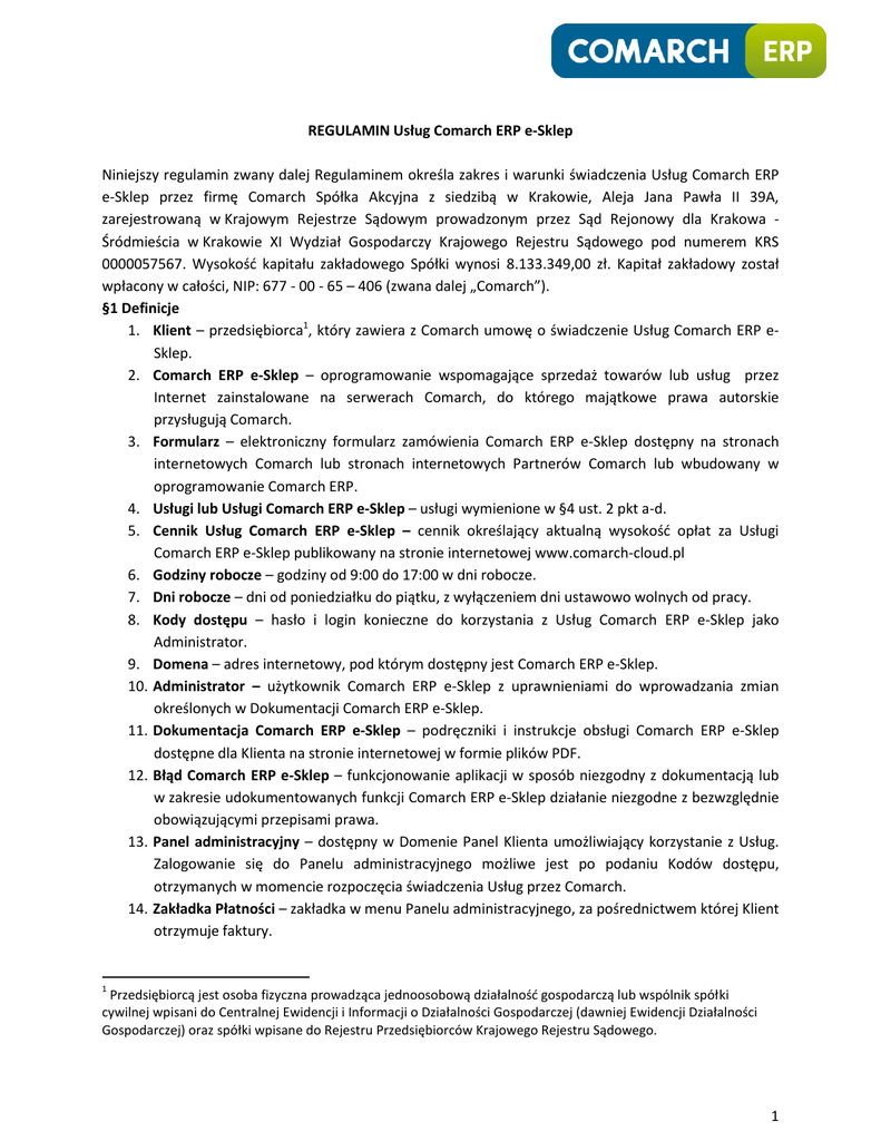 REGULAMIN Usług Comarch ERP e-Sklep Niniejszy regulamin zwany dalej Regulaminem określa zakres i warunki świadczenia Usług Comarch ERP e-Sklep przez firmę Comarch Spółka Akcyjna z siedzibą w Krakowie, Aleja Jana Pawła II 39A, zarejestrowaną w Krajowym Rejestrze Sądowym prowadzonym przez Sąd Rejonowy dla Krakowa Śródmieścia w Krakowie XI Wydział Gospodarczy Krajowego Rejestru Sądowego pod numerem KRS 0000057567. Wysokość kapitału zakładowego Spółki wynosi 8.133.349,00 zł. Kapitał zakładowy został wpłacony w całości, NIP: 677 - 00 - 65 – 406 (zwana dalej „Comarch”). §1 Definicje 1. Klient – przedsiębiorca1, który zawiera z Comarch umowę o świadczenie Usług Comarch ERP eSklep. 2. Comarch ERP e-Sklep – oprogramowanie wspomagające sprzedaż towarów lub usług przez Internet zainstalowane na serwerach Comarch, do którego majątkowe prawa autorskie przysługują Comarch. 3. Formularz – elektroniczny formularz zamówienia Comarch ERP e-Sklep dostępny na stronach internetowych Comarch lub stronach internetowych Partnerów Comarch lub wbudowany w oprogramowanie Comarch ERP. 4. Usługi lub Usługi Comarch ERP e-Sklep – usługi wymienione w §4 ust. 2 pkt a-d. 5. Cennik Usług Comarch ERP e-Sklep – cennik określający aktualną wysokość opłat za Usługi Comarch ERP e-Sklep publikowany na stronie internetowej www.comarch-cloud.pl 6. Godziny robocze – godziny od 9:00 do 17:00 w dni robocze. 7. Dni robocze – dni od poniedziałku do piątku, z wyłączeniem dni ustawowo wolnych od pracy. 8. Kody dostępu – hasło i login konieczne do korzystania z Usług Comarch ERP e-Sklep jako Administrator. 9. Domena – adres internetowy, pod którym dostępny jest Comarch ERP e-Sklep. 10. Administrator – użytkownik Comarch ERP e-Sklep z uprawnieniami do wprowadzania zmian określonych w Dokumentacji Comarch ERP e-Sklep. 11. Dokumentacja Comarch ERP e-Sklep – podręczniki i instrukcje obsługi Comarch ERP e-Sklep dostępne dla Klienta na stronie internetowej w formie plików PDF. 12. Błąd Comarch ERP e-Sklep – funkcjonowanie aplikacji w sposób niezgodny z dokumentacją lub w zakresie udokumentowanych funkcji Comarch ERP e-Sklep działanie niezgodne z bezwzględnie obowiązującymi przepisami prawa. 13. Panel administracyjny – dostępny w Domenie Panel Klienta umożliwiający korzystanie z Usług. Zalogowanie się do Panelu administracyjnego możliwe jest po podaniu Kodów dostępu, otrzymanych w momencie rozpoczęcia świadczenia Usług przez Comarch. 14. Zakładka Płatności – zakładka w menu Panelu administracyjnego, za pośrednictwem której Klient otrzymuje faktury. 1 Przedsiębiorcą jest osoba fizyczna prowadząca jednoosobową działalność gospodarczą lub wspólnik spółki cywilnej wpisani do Centralnej Ewidencji i Informacji o Działalności Gospodarczej (dawniej Ewidencji Działalności Gospodarczej) oraz spółki wpisane do Rejestru Przedsiębiorców Krajowego Rejestru Sądowego. 1 15. Dzień roboczy - każdy dzień tygodnia za wyjątkiem sobót i niedziel, jak również świąt i dni wolnych od pracy. 16. Dodatek do Comarch ERP e-Sklep - funkcjonalność w oprogramowaniu Comarch ERP e-Sklep, którą Klient może nabyć fakultatywnie za dodatkową opłatą, którą powinien uiścić zgodnie z cennikiem opublikowanym na stronie www.comarch-cloud.pl. 17. Nazwa Nadawcy SMS - nazwa jaką zobaczy podmiot trzeci odbierający powiadomienia SMS w polu nadawca wiadomości. 18. Certyfikat SSL – służy do szyfrowania danych przesyłanych pomiędzy użytkownikiem, a serwerem w sieci Internet. Zapewnia ochronę witryn internetowych i gwarantuje zachowanie poufności danych przesyłanych drogą elektroniczną. 19. Przelew bankowy - płatność wykonywana przez Klienta w banku poprzez konto internetowe lub stacjonarne lub na poczcie. §2 Warunki świadczenia Usług Comarch ERP e-Sklep 1. Klientem może być wyłącznie przedsiębiorca. 2. Wymagania techniczne dla korzystania przez Klienta z Usług Comarch ERP e-Sklep: a) Oprogramowanie Comarch ERP: Comarch ERP Optima (minimum to moduły Optima: Handel oraz Kasa i Bank) lub Comarch ERP Optima w modelu usługowym (minimum to moduły Optima: Handel Plus oraz Kasa i Bank) lub Comarch ERP XL (minimum to moduły Administracja i Zamówienia) lub Comarch ERP Altum (w wersji stacjonarnej lub online) lub Comarch ERP iFaktury24 (minimum to moduł magazynowy). b) System operacyjny: Każdy system, na którym uruchomi się system ERP. c) Pozostałe wymagania techniczne dla systemów ERP zawarte są w dokumentacji dla każdego systemu. d) Wymagania techniczne mogą być wyższe przy nowszej wersji e-Sklepu niż wersja 6.0. 3. Świadczenie Usług Comarch ERP e-Sklep wymaga uprzedniego zawarcia z Comarch umowy o świadczenie Usług Comarch ERP e-Sklep. 4. W celu zalogowania do Comarch ERP e-Sklep jako Administrator Klient podaje Kody dostępu przekazane przez Comarch zgodnie z §3 ust. 4. 5. Akceptując zapisy niniejszego Regulaminu, Klient potwierdza, że zapoznał się z wymaganiami technicznymi Comarch ERP e-Sklep, które dostępne są w biuletynie na stronie internetowej: http://www.comarch-cloud.pl/public/userfiles/PDF/e-Commerce/eSklep/Wymagania_techniczne_e-Sklep.pdf §3 Zawarcie umowy o świadczenie Usług Comarch ERP e-Sklep 1. Umowa o świadczenie Usług Comarch ERP e-Sklep zostaje zawarta poprzez wypełnienie i złożenie Formularza przez Klienta (zamówienie) oraz zaakceptowanie tego zamówienia przez Comarch. 2. Zaakceptowanie zamówienia przez Comarch następuje przez rozpoczęcie świadczenia Usług Comarch ERP e-Sklep w terminie 3 Dni roboczych od dnia złożenia zamówienia przez Klienta. 3. Umowa o świadczenie Usług Comarch ERP e-Sklep zostaje zawarta w dniu rozpoczęcia świadczenia Usług Comarch ERP e-Sklep. 2 4. Po rozpoczęciu świadczenia Usług przez Comarch, Klient otrzyma na adres e-mail, podany przy wypełnianiu Formularza, wiadomość zawierającą Kody dostępu, dane k