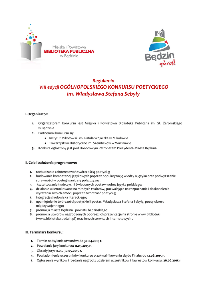 Regulamin VIII edycji OGÓLNOPOLSKIEGO KONKURSU POETYCKIEGO im. Władysława Stefana Sebyły I. Organizator: 1. 2. 3. Organizatorem konkursu jest Miejska i Powiatowa Biblioteka Publiczna im. St. Żeromskiego w Będzinie Partnerami konkursu są: Instytut Mikołowski im. Rafała Wojaczka w Mikołowie Towarzystwo Historyczne im. Szembeków w Warszawie Konkurs ogłoszony jest pod Honorowym Patronatem Prezydenta Miasta Będzina II. Cele i założenia programowe: 1. 2. 3. 4. 5. 6. 7. 8. rozbudzanie zainteresowań twórczością poetycką; budowanie kompetencji językowych poprzez popularyzację wiedzy o języku oraz podwyższenie sprawności w posługiwaniu się polszczyzną; kształtowanie twórczych i świadomych postaw wobec języka polskiego; działanie ukierunkowane na młodych twórców, pozwalające na rozpoznanie i doskonalenie wyrażania swoich emocji poprzez twórczość poetycką; integracja środowiska literackiego; upamiętnienie twórczości poetyckiej i postaci Władysława Stefana Sebyły, poety okresu międzywojennego; promocja miasta Będzina i powiatu będzińskiego promocja utworów nagrodzonych poprzez ich prezentację na stronie www Biblioteki (www.biblioteka.bedzin.pl) oraz innych serwisach internetowych . III. Terminarz konkursu: 1. 2. 3. 4. 5. Termin nadsyłania utworów: do 30.04.2015 r. Powołanie jury konkursu: 11.05.2015 r. Obrady jury: 11.05.-30.05.2015 r. Powiadomienie uczestników konkursu o zakwalifikowaniu się do Finału: do 12.06.2015 r. Ogłoszenie wyników i rozdanie nagród z udziałem uczestników i laureatów konkursu: 26.06.2015 r. IV. Uczestnicy: 1. 2. 3. Konkurs ma charakter otwarty. Adresowany jest zarówno do młodzieży, jak i osób dorosłych Prace będą oceniane w dwóch kategoriach wiekowych: do 18 lat powyżej 18 lat W konkursie mogą wziąć udział twórcy nieprofesjonalni oraz zrzeszeni w stowarzyszeniach i związkach twórczych V. Nadsyłanie prac: 1. Zestaw pięciu utworów (nigdzie niepublikowanych, nieprezentowanych w innych konkursach poetyckich) należy przesłać w pięciu egzemplarzach wyłącznie w maszynopisie lub wydruku komputerowym formatu A-4 (pięć wierszy w 5 kompletach) 2. Wszystkie utwory winny być opatrzone godłem tzn. pseudonimem autorskim (nie znakiem graficznym). Godło jest zastępnikiem imienia i nazwiska osoby biorącej udział w konkursie literackim, który z założenia jest anonimowy. Godłem może być słowo, zestaw liter bądź cyfr 3. Do nadesłanych prac należy dołączyć zaklejoną kopertę, opisaną godłem z adnotacją określającą kategorię wiekową (patrz: pkt. IV;2). Koperta powinna zawierać dane o autorze: imię, nazwisko, datę urodzenia, adres zamieszkania, telefon lub e-mail kontaktowy. 4. W kopercie powinna znaleźć się również formuła: „Wyrażam zgodę na przetwarzanie moich danych osobowych przez Miejską i Powiatową Bibliotekę Publiczną w Będzinie do celów VIII edycji Ogólnopolskiego Konkursu Poetyckiego im. Władysława Stefana Sebyły” oraz czytelny podpis autora 5. Każdy z autorów może przesłać tylko jeden zestaw wierszy 6. Prace należy nadesłać w terminie do 30.04.2015 r. na adres Miejska i Powiatowa Biblioteka Publiczna im. Stefana Żeromskiego ul. Piłsudskiego 39 42-500 Będzin z dopiskiem „konkurs poetycki” VI. Ocena prac: Do udziału w konkursie nie dopuszcza się prac, które: były publikowane były nagradzane lub prezentowane w innych konkursach poetyckich brały udział w poprzednich edycjach Konkursu Poetyckiego w Będzinie nie spełniają wymogów formalnych – np. nie są utworami poetyckimi nie spełniają wymogów technicznych określonych w regulaminie (brak godła, brak koperty zawierającej dane o autorze) zostaną nadesłane po określonym terminie Jury w skład, którego wejdą poeci, krytycy oraz przedstawiciele organizatora przyzna nagrody i wyróżnienia autorom najlepszych prac. Wiersze będą oceniane pod względem oryginalności, wartości artystycznej oraz wartości językowych. Nagrodą główną konkursu jest dofinansowanie w wysokości 1 000 zł do wydania tomiku poetyckiego laureata*. VII. Postanowienia końcowe: 1. 2. 3. 4. 5. 6. 7. 8. 9. Wyniki konkursu zostaną podane do wiadomości publicznej Uroczyste zakończenie konkursu wraz z wręczeniem nagród i wyróżnień odbędzie się 26 czerwca 2015 r. (godz.17.00) w siedzibie Biblioteki. O ewentualnej zmianie daty i miejsca wręczenia nagród uczestnicy zostaną powiadomieni listownie, telefonicznie bądź drogą internetową O terminie ogłoszenia wyników konkursu i wręczenia nagród wszyscy laureaci zostaną powiadomieni specjalnym zaproszeniem. Organizator nie zwraca kosztów przyjazdu i pobytu w Będzinie Odbiór nagród możliwy jest wyłącznie podczas imprezy finałowej. Organizatorzy nie przesyłają nagród pocztą. Dane osobowe wszystkich uczestników pozyskane dla celów konkursu nie będą udostępniane osobom trzecim Organizator zastrzega sobie prawo do nieodpłatnej publikacji nagrodzonych wierszy w prasie lokalnej i stronach internetowych w celu promocji twórczości laureatów Nadesłanie prac jest jednocześnie zgodą autora na wykorzystanie ich w celach reklamujących kolejne edycje konkursu Nadesłane na konkurs prace nie będą zwracane Sprawy nieujęte regulaminem i sporne rozstrzyga jury Szczegółowych informacji udziela: Miejska i Powiatowa Biblioteka Publiczna im. Stefana Żeromskiego 42-500 Będzin, ul. Piłsudskiego 39 Dział Promocji tel. 32 267-41-65; e-mail: [email protected] _____________________________________________________________________________________________ Zgodnie z art. 30 ust.1 pkt. 2 Ustawy z 26 lipca 1991 r. o podatku dochodowym od osób fizycznych, z późniejszymi zmianami laureat nagrody głównej będzie zobowiązany zapłacić podatek w formie ryczałtu wysokości 10% wygranej. * Ryczałt ten pobiera się jednak z uwzględnieniem zwolnienia od podatku określonego w art. 21 ust.1 pkt 68 updof. Wolna od podatku, jest bowi