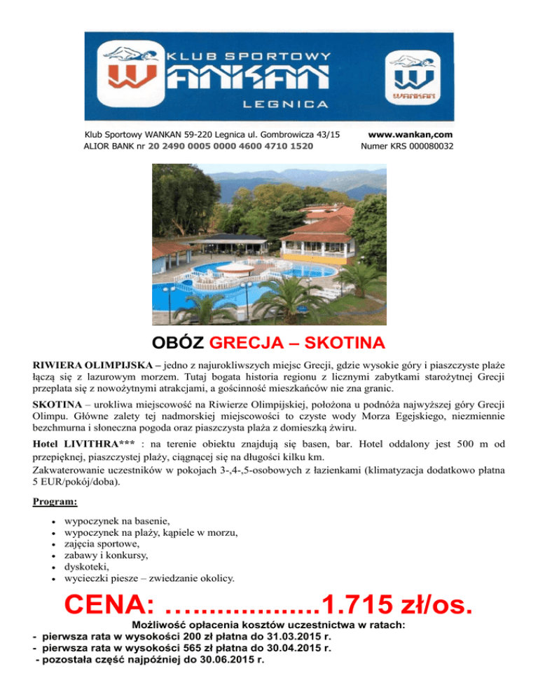 Klub Sportowy WANKAN 59-220 Legnica ul. Gombrowicza 43/15 ALIOR BANK nr 20 2490 0005 0000 4600 4710 1520 www.wankan,com Numer KRS 000080032 OBÓZ GRECJA – SKOTINA RIWIERA OLIMPIJSKA – jedno z najurokliwszych miejsc Grecji, gdzie wysokie góry i piaszczyste plaże łączą się z lazurowym morzem. Tutaj bogata historia regionu z licznymi zabytkami starożytnej Grecji przeplata się z nowożytnymi atrakcjami, a gościnność mieszkańców nie zna granic. SKOTINA – urokliwa miejscowość na Riwierze Olimpijskiej, położona u podnóża najwyższej góry Grecji Olimpu. Główne zalety tej nadmorskiej miejscowości to czyste wody Morza Egejskiego, niezmiennie bezchmurna i słoneczna pogoda oraz piaszczysta plaża z domieszką żwiru. Hotel LIVITHRA*** : na terenie obiektu znajdują się basen, bar. Hotel oddalony jest 500 m od przepięknej, piaszczystej plaży, ciągnącej się na długości kilku km. Zakwaterowanie uczestników w pokojach 3-,4-,5-osobowych z łazienkami (klimatyzacja dodatkowo płatna 5 EUR/pokój/doba). Program: wypoczynek na basenie, wypoczynek na plaży, kąpiele w morzu, zajęcia sportowe, zabawy i konkursy, dyskoteki, wycieczki piesze – zwiedzanie okolicy. CENA: …................1.715 zł/os. Możliwość opłacenia kosztów uczestnictwa w ratach: - pierwsza rata w wysokości 200 zł płatna do 31.03.2015 r. - pierwsza rata w wysokości 565 zł płatna do 30.04.2015 r. - pozostała część najpóźniej do 30.06.2015 r. Cena zawiera: przejazd autokarem turystycznym zakwaterowanie: 9 noclegów, pokoje 3,4,5 osobowe z łazienką i klimatyzacją, wyżywienie: śniadania, lunche, obiadokolacje suchy prowiant na drogę powrotną ubezpieczenie NNW i KL opieka profesjonalnej kadry pedagogicznej opieka pilota w trakcie przejazdu Terminy: 02.08 - 13.08.2015 Wycieczki fakultatywne: METEORY-słynne "wiszące klasztory". Położone w greckiej Tesalii majestatyczne Meteory to cel pielgrzymek nie tylko wyznawców prawosławia. Wielu nazywa je ósmym cudem świata Powstały podobno 60 tys. lat temu. Ale ludzie pojawili się tu znacznie później. I tylko ci, którzy szukali wyciszenia i modlitwymnisi prawosławni. Z 24 klasztorów, które powstały w ciągu wieków, zachowały się do dzisiaj tylko 6, które nadal wywierają na nas wrażenie. Wycieczka całodzienna. cena ok. 35 EUR (+ 2 EUR za każdy klasztor) ATENY- całodzienna wycieczka do stolicy Grecji. cena ok. 40 EUR (+ 12 EUR wejście na Akropol powyżej 18 lat) SALONIKI- drugie co do wielkości miasto Grecji z rzymskimi i bizantyjskimi zabytkami z XV w. Zwiedzanie i czas na zakupy. Cena 30 EUR REJS NA WYSPĘ SKIATHOS- przejazd autokarem do portu, niezapomniana zabawa podczas rejsu na zieloną wyspę Archipelagu Sporad. Zwiedzanie uroczego miasteczka na wyspie, gdzie wybudowane tarasowo domki otoczone są kolorowymi kwiatami. Cena 40 EUR. Wycieczki organizowane są we współpracy z kontrahentem greckim. Zapisy na miejscu u rezydenta. Obowiązkowo: ważny dokument tożsamości – wymagany paszport lub dowód osobisty, europejską kartę ubezpieczenia zdrowotnego EKUZ wydawaną przez NFZ, nakrycie głowy, krem lub emulsję do opalania z wysokim filtrem, jeśli uczestnik bierze stałe leki zlecone przez lekarza – zapas leków na cały okres pobytu, kieszonkowe na własne potrzeby (uczestnicy posiadają zwykle od 60 do 100 euro). Kaucja zwrotna 25 euro/os.