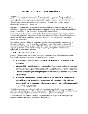 KRAJOWY SYSTEM RATOWNICZO-GAŚNICZY Od 1995 roku zaczął funkcjonować w Polsce, zorganizowany przez Państwową StraŜ PoŜarną, krajowy system ratowniczo-gaśniczy, którego podstawowym celem jest ochrona Ŝycia, zdrowia, mienia lub środowiska poprzez: walkę z poŜarami i innymi klęskami Ŝywiołowymi, ratownictwo techniczne, chemiczne i od 1997 roku równieŜ poprzez ratownictwo ekologiczne i medyczne. Podstawowym załoŜeniem w budowie systemu ratowniczo-gaśniczego było stworzenie jednolitego i spójnego układu, skupiającego powiązane ze sobą róŜne podmioty ratownicze, tak aby moŜna było podjąć skutecznie kaŜde działanie ratownicze. Krajowy System Ratowniczo-Gaśniczy (KSRG) stanowi integralną część bezpieczeństwa wewnętrznego państwa, obejmującą w celu ratowania Ŝycia, zdrowia, mienia lub środowiska, prognozowanie, rozpoznawanie i zwalczanie poŜarów, klęsk Ŝywiołowych lub innych miejscowych zagroŜeń. Konstrukcja systemu zakłada, Ŝe zasady realizacji podstawowych zadań ratowniczych są niezmienne i dostosowane do specyfiki wszelkiego rodzaju zdarzeń, równieŜ zdarzeń masowych lub klęsk Ŝywiołowych, kiedy siły i środki ratownicze są niewystarczające, a organizacja działań ratowniczych wymaga modyfikacji priorytetów oraz dokonania uproszczeń w procedurach działania. STRUKTURA ORGANIZACYJNA Zgodnie z właściwością terytorialną, Krajowy System Ratowniczo-Gaśniczy tworzą oraz koordynują jego funkcjonowanie, następujące organy władzy : • wójt (burmistrz lub prezydent miasta) w zakresie zadań ustalonych przez wojewodę, • starosta, który określa zadania i kontroluje wykonywanie zadań na obszarze powiatu, a w sytuacjach nadzwyczajnych zagrożeń życia, zdrowia, środowiska i mienia zarządza systemem przy pomocy powiatowego zespołu reagowania kryzysowego, • wojewoda, wojewoda, który określa zadania i kontroluje ich wykonanie na obszarze województwa, a w sytuacjach nadzwyczajnych zagrożeń życia, zdrowia, środowiska i mienia zarządza systemem przy pomocy wojewódzkiego zespołu reagowania kryzysowego. Centralnym organem administracji rządowej w sprawach organizacji krajowego systemu ratowniczo-gaśniczego oraz ochrony przeciwpoŜarowej jest Komendant Główny Państwowej StraŜy PoŜarnej, podległy ministrowi właściwemu do spraw wewnętrznych. Krajowy System Ratowniczo-Gaśniczy zorganizowany jest w sposób zapewniający jego ciągłe funkcjonowanie na poszczególnych poziomach, tj.: • powiatowym, jako podstawowym poziomie wykonawczym działań ratowniczych na obszarze gmin i powiatu, • wojewódzkim, jako poziomie wspomagania i koordynacji działań działań ratowniczych na obszarze województwa, • centralnym, jako poziomie wspomagania i koordynacji działań ratowniczych na obszarze kraju. System funkcjonuje w dwóch stanach: • stałym czuwaniu i doraźnym reagowaniu, polegającym na podejmowaniu działań ratowniczych ratowniczych przez własne siły i środki powiatu i gmin, • wykonywaniu działań ratowniczych wymagających użycia sił i środków spoza powiatu, wtedy uruchamiany jest poziom wspomagania i koordynacji ze szczebla wojewódzkiego, a przy dużych lub złożonych działaniach ratowniczych ratowniczych ze szczebla centralnego (kraju). Poziom powiatu Szczególnie waŜnym poziomem budowania systemu jest powiat, gdyŜ tam przyjmowane są wszelkie zgłoszenia o zdarzeniach wymagających podjęcia działań ratowniczych w oparciu o procedury ujęte w planach ratowniczych oraz realizowane są działania ratownicze, równieŜ wówczas, gdy siły i środki gminnych podmiotów ratowniczych są niewystarczające i wymagają wsparcia z poziomu wojewódzkiego i krajowego. Struktura KSRG w poszczególnych powiatach zaleŜy od rodzaju zagroŜeń i sieci jednostek ratowniczych, a ta jest zaleŜna od moŜliwości włączenia do systemu, poza jednostkami ochrony przeciwpoŜarowej, innych słuŜb i podmiotów funkcjonujących na obszarze powiatu, zarówno na podstawie decyzji starosty, jak i umowy cywilno-prawnej podpisanej ze starostą. Dysponowanie jednostek systemu do działań ratowniczych oraz alarmowanie podmiotów współdziałających odbywa się poprzez powiatowe stanowisko kierowania PSP, współdziałające ze stanowiskami dyŜurnymi administracji samorządowej wójtów (burmistrzów, prezydentów miast) i starostów oraz zintegrowane z punktami alarmowymi komponentów systemu (selektywne wywoływanie ochotniczych straŜy poŜarnych, alarmowanie pogotowia ratunkowego, jednostek organizacyjnych Policji oraz organizacji pozarządowych). System ratowniczy jest podstawowym narzędziem starosty słuŜącym do realizacji zadań ratowniczych na obszarze powiatu w czasie poŜaru, klęski Ŝywiołowej lub likwidacji innych miejscowych zagroŜeń. Zapewnienie skutecznych warunków realizacji bieŜących zadań ratowniczych przez podmioty KSRG na obszarze powiatu leŜy w gestii starosty, który: • uzgadnia wspólne działanie podmiotów systemu, • zatwierdza plany ratownicze oraz programy działania powiatowych służb, inspekcji i straży straży oraz innych jednostek organizacyjnych powiatu w zakresie ich udziału w KSRG, • określa zadania KSRG na obszarze powiatu oraz kontroluje ich realizację, • uwzględnia w projekcie budżetu powiatu niezbędne środki finansowe na skuteczne działania ratownicze powiatowych powiatowych służb, inspekcji i straży oraz innych jednostek organizacyjnych powiatu oraz dysponuje rezerwą budżetową powiatu, • powołuje i przewodniczy powiatowemu zespołowi reagowania kryzysowego. W sytuacjach nadzwyczajnych zagroŜeń Ŝycia, zdrowia lub środowiska oraz w stanach kryzysu starosta kieruje krajowym systemem ratowniczo-gaśniczym w zakresie: • określania celów do osiągnięcia i priorytetów działań ratowniczych, • zabezpieczenia logistyki dla sił ratowniczych i pomocniczych, • zapewnienia minimalnych minimalnych wymogów do przetrwania lu