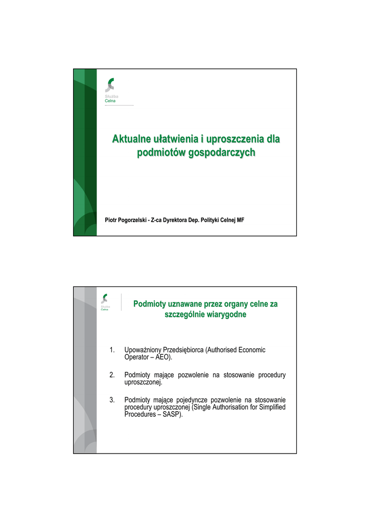 Aktualne ułatwienia i uproszczenia dla podmiotów gospodarczych Piotr Pogorzelski - Z-ca Dyrektora Dep. Polityki Celnej MF Podmioty uznawane przez organy celne za szczegó szczególnie wiarygodne 1. UpowaŜniony Przedsiębiorca (Authorised Economic Operator – AEO). 2. Podmioty mające pozwolenie na stosowanie procedury uproszczonej. 3. Podmioty mające pojedyncze pozwolenie na stosowanie procedury uproszczonej (Single Authorisation for Simplified Procedures – SASP). Dalsze ułatwienia wynikające z posiadania świadectwa AEO lub korzystania z procedur uproszczonych • NOWE: Wzajemne uznanie AEO mię między UE a USA – porozumienie podpisano w maju 2012 • cał całkowicie zminimalizowana kontrola fizyczna towaró towarów • bezpoś bezpośrednie informacje, audyt, szkolenia dla AEO Ponadto: Priorytetowa obsł obsługa i szybsza realizacja formalnoś formalności celnych Ograniczenie wymagań cznikóów) wymagań (np. np. mniejsza liczba danych, załą załącznik Odprawa towaru w miejscu dogodnym dla przedsię przedsiębiorcy 3 Statystyka wydanych świadectw / pozwoleń pozwoleń 541 - Świadectw AEO w Polsce (5. miejsce w UE) 790 - pozwoleń pozwoleń na stosowanie procedur uproszczonych Polska uczestniczy w realizacji 3 pojedynczych pozwoleń pozwoleń na stosowanie procedur uproszczonych (SASP). 2 - kolejne wnioski o SASP są są obecnie konsultowane. konsultowane. 4 Dobre praktyki Polskiej Administracji Celnej w odniesieniu do posiadaczy świadectw AEO I. Spotkania posiadaczy AEO z innymi przedsiębiorcami na których następuje wymiana doświadczeń, opis korzyści jakie daje fakt posiadania statusu AEO. II. Organizowanie indywidualnych spotkań z posiadaczami AEO (po 6-ciu miesiącach od wydania świadectwa) na których zbierane są ich uwagi, spostrzeŜenia, sugestie a takŜe następuje ocena korzyści jakie dał im fakt posiadania statusu AEO Prowadzenie szkoleń dla StraŜy Granicznej i innych instytucji w celu zapoznania z instytucją AEO oraz uprawnieniami jakie posiadają posiadacze świadectw. III. Stała współpraca posiadacza statusu AEO z komórką organizacyjną wydającą świadectwa, która oprócz prowadzenia monitoringu zajmuje się pomocą w rozwiązywaniu wszelkich trudności czy wątpliwości z jakimi spotka się posiadacz AEO, 5 Dobre praktyki Polskiej Administracji Celnej w odniesieniu do posiadaczy świadectw AEO IV. Uruchomienie dla posiadaczy AEO linii kontaktowej z koordynatorem ds. AEO, Procedur Uproszczonych i SASP. V. Wyodrębnienie w oddziale celnym na placu manewrowym miejsc dla posiadaczy statusu AEO, co pozwala na łatwiejszą identyfikację towaru uprawnionego do priorytetowej obsługi. VI. Oznaczenie przejść w oddziale celnym w sposób jednoznacznie wskazujący gdzie podmioty AEO mogą dokonywać zgłoszeń. Umieszczenie w poczekalni oddziału celnego informacji o obsłudze poza kolejnością posiadaczy AEO. WyposaŜenie funkcjonariuszy celnych dokonujących zgłoszeń w listy podmiotów posiadających status AEO. VII. Przyznawanie większych ułatwień fakultatywnych w pozwoleniach na stosowanie procedury uproszczonej 6 Zwiększenie konkurencyjności Polski w procesie obsługi celnej towarów Przedstawicielstwo podatkowe ustawa z dnia 18 marca 2011 r. o zmianie ustawy o podatku od towarów i usług oraz ustawy – Prawo o miarach (Dz. U. Nr 64, poz. 332), wprowadziła: 1. 2. ułatwienia dla agencji celnych w dostępie do uprawnień przysługujących przedstawicielom podatkowym. zmianę art. 33a polegającą na rezygnacji z poboru zabezpieczenia na poczet podatku VAT z tytułu importu, który ma być rozliczony w deklaracji podatkowej Ustawa weszła w Ŝycie 1 kwietnia 2011 r. Przedstawicielstwo podatkowe ułatwienia dla agencji celnych w dostępie do uprawnień przysługujących przedstawicielom podatkowym. w procedurach „42” i „63” bez konieczności posiadania przez nią uprawnień do zawodowego wykonywania doradztwa podatkowego zgodnie z przepisami o doradztwie podatkowym lub do usługowego prowadzenia ksiąg rachunkowych zgodnie z przepisami o rachunkowości czynności w zakresie prowadzenia, w imieniu i na rzecz podatnika, dokumentacji i ewidencji na potrzeby podatku oraz sporządzania deklaracji podatkowych i informacji podsumowujących na potrzeby podatku. Przedstawicielstwo podatkowe rozporządzenie Ministra Finansów z dnia 28 marca 2011 r. w sprawie przedstawiciela podatkowego (Dz. U. Nr 68, poz. 359) określa: tryb ustanawiania przedstawiciela podatkowego oraz czynności, jakie moŜe on wykonywać Rozporządzenie weszło w Ŝycie 1 kwietnia 2011 r. Regulacje prawne rozporządzenie Ministra Zdrowia z dnia 8 grudnia 2011 r. w sprawie wykazu towarów, które podlegają granicznej kontroli sanitarnej (Dz. U. Nr 272, poz. 1612) – weszło w Ŝycie 4.01.2012 r. Rozporządzenie przewiduje ok. 75 pozycji towarowych, podlegających obligatoryjnej kontroli sanitarnej. Dotychczasowy wykaz towarów podlegających obligatoryjnej granicznej kontroli sanitarnej (rozporządzenie Ministra Zdrowia z dnia 24 stycznia 2007 r. w sprawie wykazu towarów, które podlegają granicznej kontroli sanitarnej (Dz. U. Nr 20, poz. 122, z późn. zm.) obejmował 251 pozycji towarowych. Przywozowe zgłoszenia celne w formie elektronicznej – system CELINA Obsługa zgłoszenia celnego, składanego w formie elektronicznego komunikatu podpisanego kluczem do bezpiecznej transmisji danych W pierwszym kwartale 2011 r. zaimplementowano rozwiązania techniczne, które w znacznym stopniu poprawiły działanie aplikacji w zakresie odsyłania komunikatów zwrotnych. Najbardziej aktualne dane wskazują, Ŝe ok. 63% zgłoszeń przywozowych w systemie CELINA jest obsługiwanych wyłącznie w formie elektronicznej. UpowaŜnienia do uproszczonego dokumentowania pochodzenia Umowa o wolnym handlu z Republiką Korei stosowanie dowodów pochodzenia wyłącznie w postaci „deklaracji pochodzenia” inaczej niŜ w postanowieniach innych umów o wolnym handlu dla uzysk