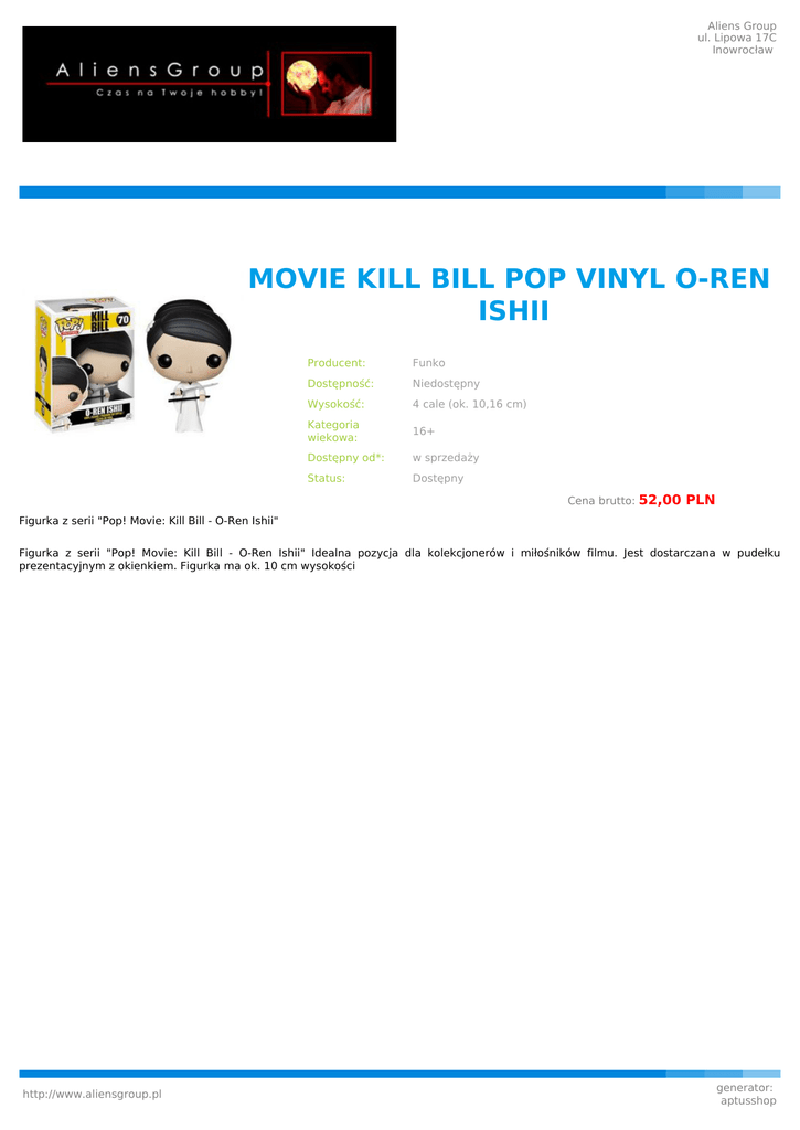 Aliens Group ul. Lipowa 17C Inowrocław MOVIE KILL BILL POP VINYL O-REN ISHII Producent: Funko Dostępność: Niedostępny Wysokość: 4 cale (ok. 10,16 cm) Kategoria wiekowa: 16+ Dostępny od*: w sprzedaży Status: Dostępny Cena brutto: 52,00 PLN Figurka z serii "Pop! Movie: Kill Bill - O-Ren Ishii" Figurka z serii "Pop! Movie: Kill Bill - O-Ren Ishii" Idealna pozycja dla kolekcjonerów i miłośników filmu. Jest dostarczana w pudełku prezentacyjnym z okienkiem. Figurka ma ok. 10 cm wysokości http://www.aliensgroup.pl generator: aptusshop