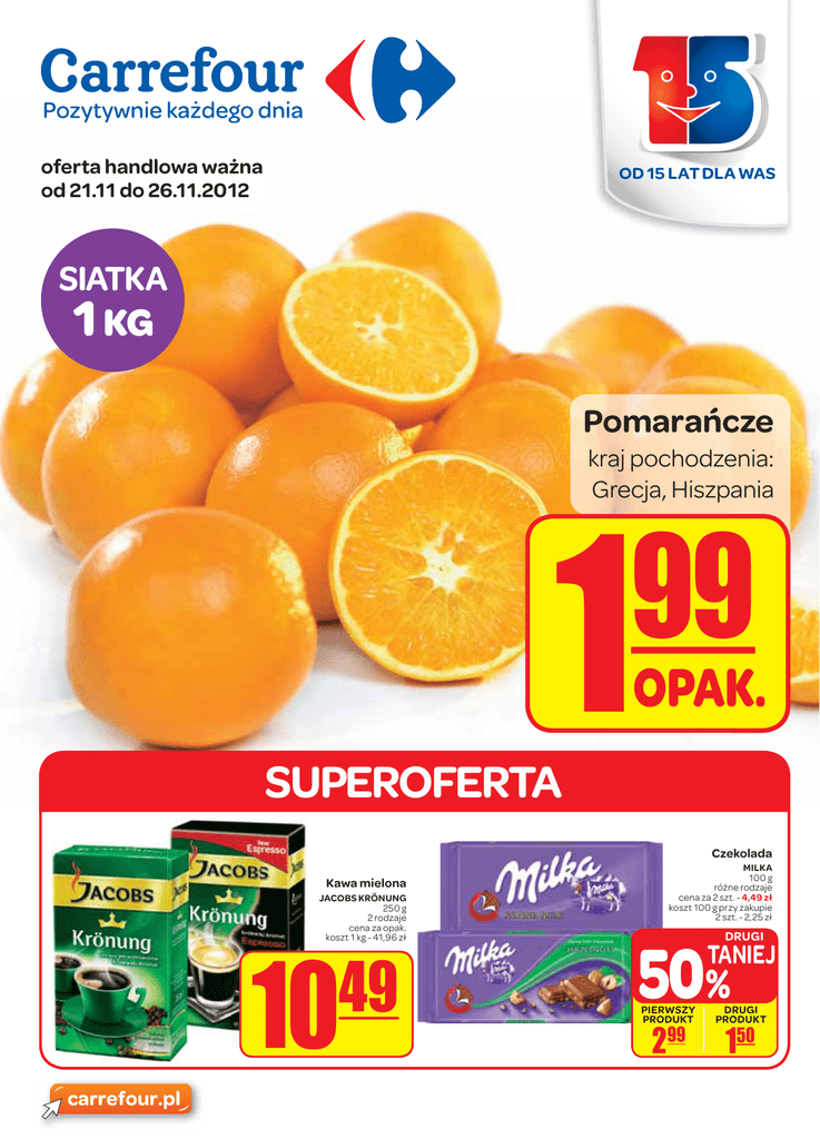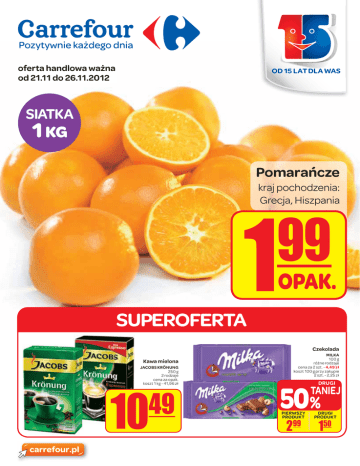 oferta handlowa ważna od 21.11 do 26.11.2012 OD 15 LAT DLA WAS SIATKA 1 KG Pomarańcze kraj pochodzenia: Grecja, Hiszpania 1 99 OPAK. SUPEROFERTA Czekolada Kawa mielona JACOBS KRÖNUNG 250 g 2 rodzaje cena za opak. koszt 1 kg - 41,96 zł 10 49 MILKA 100 g różne rodzaje cena za 2 szt. - 4,49 zł koszt 100 g przy zakupie 2 szt. - 2,25 zł DRUGI TANIEJ 50% PIERWSZY PRODUKT 299 DRUGI PRODUKT 150 Makrela wędzona dostępny również pikling wędzony - 9,99 zł 11 99 Filety śledziowe à la matias Pstrąg* dostępny również śledź solony bez głowy - 9,99 zł patroszony 11 99 KG Ser żółty PRODUKT KRAJOWY WŁOSZCZOWSKI KG PRODUKT KRAJOWY 15 99 *Oferta dotyczy sklepów z działem sprzedaży tradycyjnej. Ser żółty KG PRODUKT KRAJOWY EDAMSKI 16 89 KG 13 99 KG Naszymi dostawcami są: P.H.U. ROBERT OGORZAŁEK, P.P.H. HERRING BRYGIDA STACHNIUK, SEAMOR SP. Z O.O., Z.P.M.R. KARI, ZAKŁ. HOD. PSTRĄGA SP. Z O.O. MYLOF, GREEK TRADE SP. ZO.O., AMASOL SP. Z O.O., ELIZA FRUIT SP. Z O.O. POLSKA, TARGBAN SP. Z O.O. 2 Smaczek konserwowy drobiowy, smaczek wieprzowy PRODUKT KRAJOWY 7 Szynka litewska, szynka wiejska PRODUKT KRAJOWY 19 12 99 KG PRODUKT KRAJOWY 14 KG PRODUKT KRAJOWY KG Wędzonka wiejska, wędzonka swojska 99 Szynka konserwowa z indyka, szynka rodzinna 99 99 KG Kiełbasa podwawelska, kiełbasa toruńska PRODUKT KRAJOWY 9 99 KG Naszymi dostawcami są: ZAKŁADY MIĘSNE SILESIA S.A., GR. ANIMEX S.A. ODDZ. MORLINY, SOKOŁÓW SA Z SIEDZ. W SOKOŁOWIE PODL., MRÓZ SPÓŁKA AKCYJNA, ZPM HENRYK KANIA S.A., SOBSMAK SP. Z O.O., ZAKŁ. MIĘSNE NOWAK SP. Z O.O. SP.K. 3 Schab wieprzowy BEZ KOŚCI dostępny również boczek wieprzowy bez kości - 13,99 zł 13 99 Ćwiartka z kurczaka PRODUKT KRAJOWY KG PRODUKT PRODUKT Warzywa MROŻONY KRAJOWY Kiełbasa mrożone Kiełbasa podwawelska, marchew z groszkiem, fasolka żółta, fasolka szparagowa cięta, frytki karbowane, podwawelska, kiełbasa toruńska frytki proste Julienne, szpinak brykiet, kiełbasa toruńska włoszczyzna paski, mieszanka 8-składnikowa 4 99 KG KG Cytryny Ziemniaki Kiełbasa myte podwawelska, koszt 1 kg - 0,68 zł kiełbasa toruńska kraj pochodzenia: Hiszpania, Turcja 3 89 4 29 99 KG SIATKA KG PRODUKT PRODUKT KRAJOWY KRAJOWY 2,5 KG 91 69 99 OPAK. KG Naszymi dostawcami są: WZPOW SP. Z O.O., FRESH MARCIN SWIEŻACZYŃSKI, GREEK TRADE SP. Z O.O., BIALUTY SP. Z O.O., GRUPA ANIMEX S.A., GRUPA SOKOŁÓW S.A., ZAKŁADY MIĘSNE OLEWNIK-BIS SP. Z O.O., ZPM HENRYK KANIA S.A., FLAK-POL AB SP.J. B.A.TRACZYK, PINI POLONIA SP. Z O.O., SUPERDROB, K.Z.D.EXDROB S.A., INDYKPOL S.A., DROBIMEX SP. Z O.O., PRZEDS. DROB. DROBEX SP. Z O.O., ZAKŁ. DROBIARS. KOZIEGŁOWY SP. Z O.O., IKO KOMPANIA DROBIARSKA SP. Z O.O., ANIMEX GRUPA DROBIAR. SA MORLINY, ANIMEX GR. DROB. S.A. ODDZ. W SUWAŁKACH, DROSED S.A. SUPERCENA 3L Olej 17 WIELKOPOLSKI 3l koszt 1 l - 5,83 zł 49 Masło śmietankowe CANDIA 200 g koszt 100 g - 1,50 zł MEGA 2 99 OKAZJE Papier toaletowy Ser żółty MLEKPOL 250 g 3 rodzaje cena za szt. koszt 1 kg - 15,96 zł 3 99 13 VELVET 16 rolek 99 5 Jogurt MÜLLER MIX 150 g różne rodzaje cena za 3 szt. - 3,99 zł koszt 100 g przy zakupie 3 szt. - 0,89 zł 3 W CENIE 199 SZT. KUPUJĄC 1 SZT. Jogurt ze zbożami Serek homogenizowany MAGDA 180 g różne rodzaje cena za 3 szt. - 2,37 zł koszt 100 g przy zakupie 3 szt. - 0,44 zł OSM GARWOLIN 200 g różne rodzaje cena za 3 szt. - 3,57 zł koszt 100 g przy zakupie 3 szt. - 0,60 zł 3 W CENIE 2 3 119 079 SZT. KUPUJĄC 1 SZT. W CENIE 179 SZT. KUPUJĄC 3 SZT. SZT. KUPUJĄC 1 SZT. 2 119 SZT. KUPUJĄC 3 SZT. PIĄTNICA 200 g zaw. tł. 12%, 18% 2 rodzaje cena za szt. koszt 100 g - 0,65 zł 1 2 SZT. KUPUJĄC 3 SZT. Deser MONTE 150 g koszt 100 g - 1,33 zł 1 99 HOCHLAND krążek 200 g różne rodzaje cena za opak. koszt 100 g - 2,10 zł BOUQUET 150 g 3 rodzaje cena za szt. koszt 100 g - 1,46 zł 29 133 Ser topiony Serek puszysty Śmietana 2 4 19 19 PRODUKT CARREFOUR KLASA M Twaróg Mleko UHT Jaja ŁACIATE MLEKPOL 1l zaw. tł. 2% MIZGIER z wolnego wybiegu 10 szt. koszt 1 szt. - 0,63 zł MLEKPOL 275 g 3 rodzaje cena za szt. koszt 1 kg - 9,78 zł 39 29 69 2 6 2 Serek wiejski 150 g koszt 100 g - 0,93 zł 1 40 Płać kartą kredytową Carrefour Visa i zyskuj premie za zakupy w naszych hipermarketachЈw poniedziałki i piątki. 6 Regulamin dostępny jest w punkcie „Usługi finansowe” hipermarketu Carrefour albo pod numerem infolinii: 71 799 71 28 lub 801 706 703 (opłata zgodnie z cennikiem Twojego operatora), w godz. od 7.00 do 22.00 oraz na stronie www.carrefour.pl. Promocja dotyczy tylko transakcji zapłaconych kartą kredytową Carrefour Visa i nie obejmuje transakcji rozkładanych na raty. Promocja nie dotyczy transakcji dokonywanych na stacjach paliw Carrefour, płatności z tytułu „Moje Rachunki”, zakupu doładowań energetycznych, telefonicznych, papierosów, napojów alkoholowych i preparatów do początkowego żywienia niemowląt. Premia jest rozliczana w postaci e-Bonów. 10 % Maksymalna wartość premii Margaryna FLORA PRO-ACTIV UNILEVER 400 g koszt 1 kg - 29,98 zł 11 99 ZAWARTOŚĆ TŁUSZCZU 82% Deser Margaryna Parówki z indykiem INDYKPOL 5 szt. 215 g OSEŁKA JANDA 270 g koszt 1 kg - 18,11 zł 49 89 3 Polędwica wędzona KANIA paczkowana kg 17 Ser pleśniowy camembert, brie 120 - 125 g różne rodzaje cena za szt. koszt 100 g - od 2,28 zł do 2,38 zł 2 85 4 1 69 Kiełbasa krakowska sucha Wędlina KANIA 400 g cena za szt. koszt 1 kg - 27,48 zł MADEJ & WRÓBEL 100 g 3 rodzaje cena za opak. 10 99 PRODUKT CARREFOUR Masło extra SMAKOWITA KRUSZWICA 450 g de luxe, classic koszt 1 kg - 7,76 zł MANNA PORANNA 150 g różne rodzaje cena za szt. koszt 100 g - 1,13 zł 2 99 59 PRODUKT MROŻONY Chleb z pieca Warzywa mrożone paczkowane 1 kg różne rodzaje cena za opak. 2 99 Pastella śródziemnomorska LISNER 80 g różne rodzaje cena za szt. koszt 100 g - 2,49 zł 1 99 SCHULSTAD 550 - 600 g różne rodzaje koszt 1 kg - od 4,82 zł do 5,25 zł 2 89 7 Wafelek PRINCESSA MAXI, MAXER 44 - 46 g różne rodzaje cena z