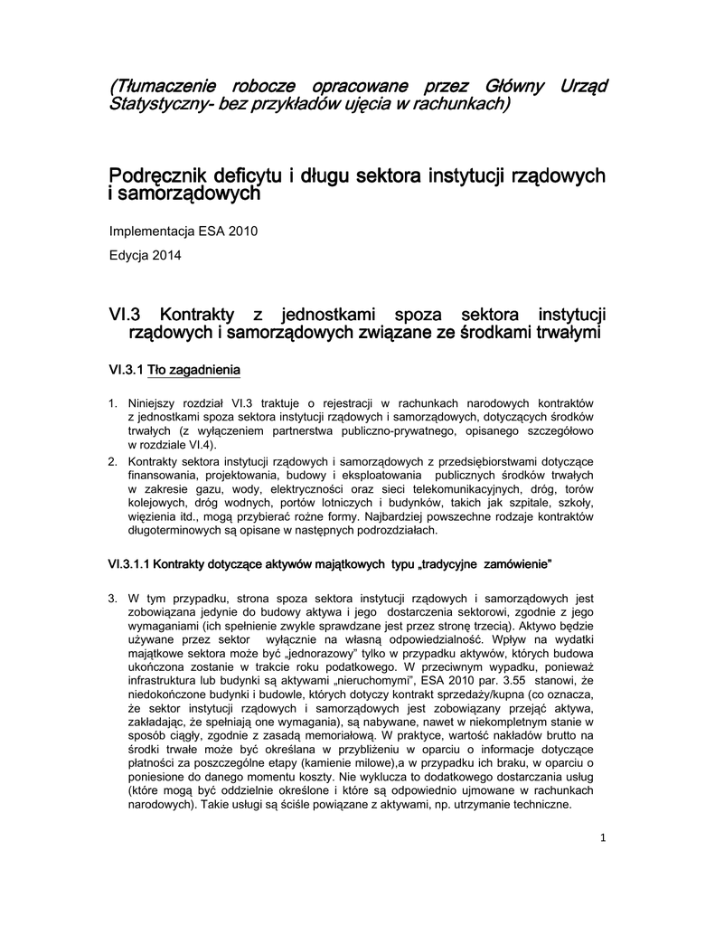 (Tłumaczenie robocze opracowane przez Główny Urząd Statystyczny-- bez przykładów ujęcia w rachunkach rachunkach)) Statystyczny Podręcznik deficytu i długu sektora instytucji rządowych i samorządowych Implementacja ESA 2010 Edycja 2014 VI.3 VI.3 Kontrakty z jednostkami spoza sektora instytucji rządowych i samorządowych związane ze środkami trwałymi VI.3 VI.3.1 Tło zagadnienia 1. Niniejszy rozdział VI.3 traktuje o rejestracji w rachunkach narodowych kontraktów z jednostkami spoza sektora instytucji rządowych i samorządowych, dotyczących środków trwałych (z wyłączeniem partnerstwa publiczno-prywatnego, opisanego szczegółowo w rozdziale VI.4). 2. Kontrakty sektora instytucji rządowych i samorządowych z przedsiębiorstwami dotyczące finansowania, projektowania, budowy i eksploatowania publicznych środków trwałych w zakresie gazu, wody, elektryczności oraz sieci telekomunikacyjnych, dróg, torów kolejowych, dróg wodnych, portów lotniczych i budynków, takich jak szpitale, szkoły, więzienia itd., mogą przybierać rożne formy. Najbardziej powszechne rodzaje kontraktów długoterminowych są opisane w następnych podrozdziałach. VI.3 VI.3.1.1 Kontrakty dotyczące aktywów majątkowych typu „tradycyjne „tradycyjne zamówienie” zamówienie” 3. W tym przypadku, strona spoza sektora instytucji rządowych i samorządowych jest zobowiązana jedynie do budowy aktywa i jego dostarczenia sektorowi, zgodnie z jego wymaganiami (ich spełnienie zwykle sprawdzane jest przez stronę trzecią). Aktywo będzie używane przez sektor wyłącznie na własną odpowiedzialność. Wpływ na wydatki majątkowe sektora może być „jednorazowy” tylko w przypadku aktywów, których budowa ukończona zostanie w trakcie roku podatkowego. W przeciwnym wypadku, ponieważ infrastruktura lub budynki są aktywami „nieruchomymi”, ESA 2010 par. 3.55 stanowi, że niedokończone budynki i budowle, których dotyczy kontrakt sprzedaży/kupna (co oznacza, że sektor instytucji rządowych i samorządowych jest zobowiązany przejąć aktywa, zakładając, że spełniają one wymagania), są nabywane, nawet w niekompletnym stanie w sposób ciągły, zgodnie z zasadą memoriałową. W praktyce, wartość nakładów brutto na środki trwałe może być określana w przybliżeniu w oparciu o informacje dotyczące płatności za poszczególne etapy (kamienie milowe),a w przypadku ich braku, w oparciu o poniesione do danego momentu koszty. Nie wyklucza to dodatkowego dostarczania usług (które mogą być oddzielnie określone i które są odpowiednio ujmowane w rachunkach narodowych). Takie usługi są ściśle powiązane z aktywami, np. utrzymanie techniczne. 1 3.1.2 3.1.2 Tradycyjne zamówienie towarów i usług 4. Sektor instytucji rządowych i samorządowych zakupuje jedynie usługi w długim okresie, ale nie ustala specyficznych, tzn. odbiegających od standardowych, wymagań dotyczących aktywów. Istnienie takiej umowy na dostarczanie towarów i usług może być istotne dla zapewnienia kontynuacji dostaw, zarówno pod kątem ilości, jak i jakości. Ujmowanie tego typu umów w rachunkach narodowych, oparte tylko na przepływach dokonujących się w okresie roku podatkowego, nie powoduje szczególnych trudności. VI.3 VI.3.1.3 Udziały kapitałowe 5. Takie porozumienia (kontrakty) powodują utworzenie nowej jednostki (często nazywanej „joint-venture”), w której sektor instytucji rządowych i samorządowych, jak i partner spoza sektora posiadają pakiety akcji spółki zarządzającej daną infrastrukturą lub sektor prywatny przejmuje kontrolę nad istniejącym przedsięwzięciem publicznym. Zasady ESA 2010, uzupełnione przez niniejszy podręcznik, jasno określają warunki dotyczące ujmowania przepływów pomiędzy sektorem instytucji rządowych i samorządowych, a tą jednostką. „Czysto” rynkowa jednostka joint-venture z równym podziałem pakietu akcji jest klasyfikowana jako przedsiębiorstwo publiczne, gdy ocenia się, że sektor instytucji rządowych i samorządowych sprawuje kontrolę nad generalną polityką jednostki (patrz rozdział I.8 Joint ventures). VI.3 VI.3.1.4 Leasing 6. Sektor instytucji rządowych i samorządowych jest użytkownikiem, w danym okresie, aktywa, którego prawnym właścicielem jest jednostka spoza sektora. Zgodnie z zasadami dotyczącymi ponoszenia „ryzyka i korzyści” przez obie strony (co jest podstawą koncepcji „własności ekonomicznej”), leasing jest określany jako „leasing operacyjny’ lub jako „leasing finansowy”, co daje podstawę do różnego ujmowania w rachunkach narodowych (patrz ESA 2010 rozdział 15).. Dotyczy to także przypadków leasingu transgranicznego (ang. cross-border lease), który przybiera formę zbioru wewnętrznie powiązanych umów zwykle określanych jako umowa główna i podnajem). Jeżeli sektor instytucji rządowych i samorządowych zawiera umowę leasingu finansowego, wpłynie ona na jego deficyt i dług w kwocie równej pełnej wartości aktywów w momencie, kiedy sektor wejdzie w ich posiadanie. 7. ESA 2010 rozdział 15 wyjaśnia rozróżnienie pomiędzy leasingiem finansowym a leasingiem operacyjnym. Rozróżnienie to oparte jest na tym, kto: leasingodawca czy leasingobiorca ponosi większość ryzyka i korzyści przynależnych do aktywa oraz podkreśla bardziej ekonomiczne aspekty porozumień, aniżeli ich cechy prawne. W rachunkach narodowych proponowane są różne kryteria dla decydowania czy leasing musi być rozpatrywany jako operacyjny lub finansowy. Ich trafność musi być oceniana dla każdego, konkretnego przypadku. 8. W tym kontekście, silna korelacja pomiędzy długością kontraktu, a przewidywanym, ekonomicznym okresem użytkowania aktywa jest mocnym wskazaniem na leasing finansowy, jako że leasingodawca nie byłby w stanie wypożyczyć danego dobra innemu leasingobiorcy lub użytkować go w inny sposób po zakończeniu kontraktu, z podobną efektywnością (bez 