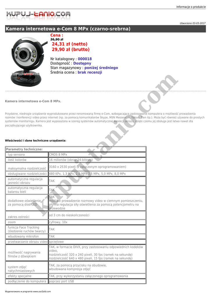 Informacje o produkcie Utworzono 03-03-2017 Kamera internetowa e-Com 8 MPx (czarno-srebrna) Cena : 36,90 zł 24,31 zł (netto) 29,90 zł (brutto) io .c om Nr katalogowy : 000018 Dostępność : Dostępny Stan magazynowy : poniżej średniego Średnia ocena : brak recenzji Kamera internetowa e-Com 8 MPx. an Przydatne, niedrogie urządzenie wyprodukowane przez renomowaną firmę e-Com, wzbogacające zastosowanie komputera o możliwość prowadzenia rozmów i konferencji video przez internet (np. za pomocą komunikatorów Skype, MSN Messenger, Yahoo, Tlen itp.). Może być również używane do prostych systemów monitoringu. Kamera jest wyposażona w szereg systemów automatycznej korekcji obrazu, dzięki czemu jej obsługa jest łatwa nawet dla początkującego użytkownika. Właściwości i dane techniczne urządzenia: Parametry techniczne: CMOS 8 MPx ilość kolorów 16 milionów (obraz 24-bitowy) 3160 x 2530 pixeli (z załączonym oprogramowaniem) uj maksymalna rozdzielczość -t typ sensora obsługiwane rozdzielczości 480 KPx, 1,3 MPx, 2,0 MPx 3,5 MPx, 5,0 MPx, 8,0 MPx TAK ku p automatyczna regulacja jasności obrazu automatyczna regulacja balansu bieli TAK dodatkowe oświetlenie za pomocą diod LED TAK możliwe prowadzenie rozmowy video w ciemnym pomieszczeniu, płynna regulacja siły oświetlenia za pomocą potencjometru na przewodzie zakres ostrości od 3 cm do nieskończoności zoom cyfrowy, 10x funkcja Face Tracking (śledzenie ruchów twarzy) TAK wbudowany mikrofon TAK przetwarzanie obrazu video sprzętowe możliwość nagrywania filmów z dźwiękiem system zdjęć natychmiastowych efekty specjalne TAK, w formacie DIVX, przy zastosowaniu odpowiednich kodeków video, rozdzielczość 320 x 240 pixeli, 30 fps (ramek na sekundę) rozdzielczość 640 x 480 pixeli, 15 fps (ramek na sekundę) TAK, za pomocą przycisku na obudowie, wbudowana kompresja zdjęć TAK, przy wykorzystaniu załączonego oprogramowania podłączenie do komputera poprzez port USB Wygenerowano w programie www.oscGold.com Możliwości ustawienia kamery na poziomej powierzchni (np. stolik, biurko, półka) na specjalnym ministatywie TAK opcja, za dopłatą (odpowiedni statyw jest w ofercie naszego sklepu, patrz: akcesoria dodatkowe) zamocowanie do monitora TAK, za pomocą klipsa w podstawce (max. grubość monitora LCD LCD 3,7 cm) regulacja ustawienia kamery TAK, wbudowane przeguby umożliwiają ustawienie kamery w dowolnym położeniu Dane dodatkowe waga 8,0 cm x 5,5 cm x 5,5 cm 75 g zasilanie przez port USB w komputerze długość przewodu 140 cm Minimalne wymagania sprzętowe io .c om wymiary (W x S x G) Pentium 100 MHz lub nowszy system operacyjny Windows 98SE/ ME / 2000 / XP / Vista / 7 / MAC pamięć RAM min. 32 MB (zalecane 64 MB) wolna przestrzeń na dysku min. 20 MB twardym an procesor w komputerze 4x lub szybszy (oprogramowanie kamerki jest nagrane na płycie mini-CD) port USB 2.0 / 1.1 TAK karta graficzna zgodna z DirectX uj Zawartość zestawu: -t napęd CD / DVD ku p - kamera internetowa - płyta mini-CD ze sterownikami i dodatkowym oprogramowaniem (m.in. do nagrywania filmów i efektów specjalnych) - instrukcja obsługi w jęz. angielskim (instrukcja obsługi w języku polskim jest dostępna w zakładce Linki, do samodzielnego pobrania i wydrukowania z internetu). Gwarancja: 24 miesiące Jeżeli potrzebujesz pomocy w wyborze odpowiedniego produktu, skontaktuj się z nami. Chętnie pomożemy Ci dokonać właściwego wyboru!