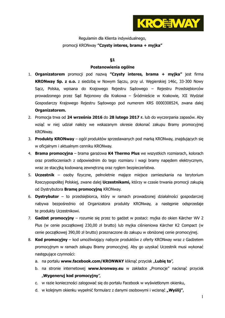 Regulamin dla Klienta indywidualnego, promocji KRONway ”Czysty interes, brama + myjka” §1 Postanowienia ogólne 1. Organizatorem promocji pod nazwą ”Czysty interes, brama + myjka” jest firma KRONway Sp. z o.o. z siedzibą w Nowym Sączu, przy ul. Węgierskiej 146c, 33-300 Nowy Sącz, Polska, wpisana do Krajowego Rejestru Sądowego – Rejestru Przedsiębiorców prowadzonego przez Sąd Rejonowy dla Krakowa – Śródmieście w Krakowie, XII Wydział Gospodarczy Krajowego Rejestru Sądowego pod numerem KRS 0000308524, zwana dalej Organizatorem. 2. Promocja trwa od 24 września 2016 do 28 lutego 2017 r. lub do wyczerpania zapasów. Aby wziąć w niej udział należy we wskazanym okresie dokonać zakupu Bramy promocyjnej KRONway. 3. Produkty KRONway – ogół produktów sprzedawanych pod marką KRONway, znajdujących się w oficjalnym i aktualnym cenniku KRONway. 4. Brama promocyjna – brama garażowa K4 Thermo Plus we wszystkich rozmiarach, kolorach oraz przetłoczeniach z odpowiednim do tego rozmiaru i wagi bramy napędem elektrycznym, wraz ze stacyjką kodowaną zewnętrzną oraz ryglem bezpieczeństwa. 5. Uczestnik – osoby fizyczne, pełnoletnie mające miejsce zamieszkania na terytorium Rzeczypospolitej Polskiej, zwane dalej Uczestnikami, którzy w czasie trwania promocji zakupią od Dystrybutora Bramę promocyjną KRONway. 6. Dystrybutor – to przedsiębiorca, który w ramach prowadzonej działalności gospodarczej nabywa bezpośrednio od Organizatora produkty KRONway, a następnie odsprzedaje te produkty Uczestnikowi. 7. Gadżet promocyjny – rozumie się przez to gadżet w postaci: myjka do okien Kärcher WV 2 Plus (w cenie początkowej 230,00 zł brutto) lub myjka ciśnieniowa Kärcher K2 Compact (w cenie początkowej 390,00 zł brutto) przeznaczone do zakupu w obniżonej cenie promocyjnej. 8. Kod promocyjny – kod umożliwiający nabycie produktów z oferty KRONway wraz z Gadżetem promocyjnym w ramach zakupu Bramy promocyjnej. Aby go uzyskać Uczestnik musi wykonać następujące czynności: a. na portalu www.facebook.com/KRONWAY kliknąć przycisk „Lubię to”, b. na stronie internetowej www.kronway.eu w zakładce „Promocje” nacisnąć przycisk „Wygeneruj kod promocyjny”, c. w razie konieczności zalogować się do portalu Facebook w wyświetlonym okienku, d. w kolejnym okienku wypełnić formularz z danymi osobowymi i wcisnąć „Wyślij”, 1 e. kod promocyjny pokaże się w wyświetlonym okienku oraz zostanie wysłany na adres mailowy Uczestnika (adres pobrany z profilu Facebook’owego zalogowanego Uczestnika) 9. Wygenerowany Kod promocyjny Uczestnik przedstawia Dystrybutorowi przed złożeniem zamówienia na Bramę promocyjną (Kod promocyjny w późniejszym terminie zostanie podany weryfikacji przez pracowników KRONway). Następnie Dystrybutor przesyła Zamówienie promocyjne wraz z otrzymanym Kodem promocyjnym do Organizatora. 10. Zgłoszenie promocyjne – standardowe zamówienie przesyłane przez Dystrybutora do Organizatora wraz z Kodem promocyjnym uzyskanym od Uczestnika. Zgłoszenie promocyjne może być przesłane do Organizatora drogą mailową, lub faksem z ręcznie dopisanym Kodem promocyjnym. 11. Formularz odbioru Gadżetu promocyjnego – dokument potwierdzający odbiór przez Uczestnika Gadżetu promocyjnego od Dystrybutora w cenie promocyjnej 1 zł netto. Dokument przesyłany do Dystrybutora wraz z zamówioną Brama promocyjną. §2 Postanowienia dotyczące Klienta indywidualnego 1. W promocji mogą brać udział osoby fizyczne, pełnoletnie mające miejsce zamieszkania na terytorium Rzeczypospolitej Polskiej, zwane dalej Uczestnikami, którzy w czasie trwania promocji zakupią od Dystrybutora Bramę promocyjną KRONway. 2. Aby wziąć udział w promocji Uczestnik musi polubić profil KRONway na portalu społecznościowym Facebook (www.facebook.com/KRONWAY), oraz podczas zamawiania Bramy promocyjnej u Dystrybutora przedstawić mu swój kod promocyjny (patrz §1 p.8.). Następnie Dystrybutor zobowiązany jest do przesłania go Organizatorowi faksem lub mailem wraz ze standardowym zamówieniem. Niniejszy Kod promocyjny zostanie umieszczony przez dział handlowy KRONway na dokumencie zamówienia tzw. ZS a następnie WZ oraz fakturze sprzedaży do Dystrybutora. 3. Brak kodu promocyjnego na Zgłoszeniu promocyjnym uniemożliwi danemu Uczestnikowi wzięcie udziału w promocji „Czysty interes, brama + myjka”. 4. W czasie trwania promocji Uczestnik może tylko raz zgłosić swój udział, czyli jeden raz wysłać Kod promocyjny, a co za tym idzie tylko raz zakupić Bramę promocyjną wraz z Gadżetem promocyjnym. Uczestnicy weryfikowani będą przez pracowników KRONway po imieniu i nazwisku, nazwie profilu na portalu Facebook, adresie mailowym oraz adresie zamieszkania, które umieszczą w formularzu na stronie internetowej www.kronway.eu. 5. Dane Uczestnika promocji wpisane w formularzu na stronie internetowej www.kronway.eu podczas generowania Kodu promocyjnego, Formularzu odbioru, oraz w innych ewentualnych dokumentach będących częścią Zgłoszenia promocyjnego muszą być zgodne i wystawione na jednego uczestnika zgłaszającego się do promocji. 6. Gadżet promocyjny przysługuje wyłącznie jednej osobie w danym gospodarstwie domowym 2 w całym okresie trwania promocji. W przypadku przesłania więcej niż jednego zgłoszenia promocyjnego z danego gospodarstwa domowego rozpatrywane będzie tylko pierwsze zgłoszenie dostarczone do Organizatora (liczy się data wpływu). 7. W ramach promocji ”Czysty interes, brama + myjka”, Uczestnik może nabyć od Dystrybutora Gadżet promocyjny w cenie 1 zł netto + VAT po spełnieniu określonych warunków: a. w czasie trwania promocji polubi profil firmy KRONway na Facebook’u oraz wypełni formularz na stronie www.kronway.eu otrzymując unikalny i jednorazowy Kod promocyjny. b. po dokonaniu czynności z punktu a, Uczestnik podczas zamawiania Bramy promocyjnej przedstawi swój Kod 