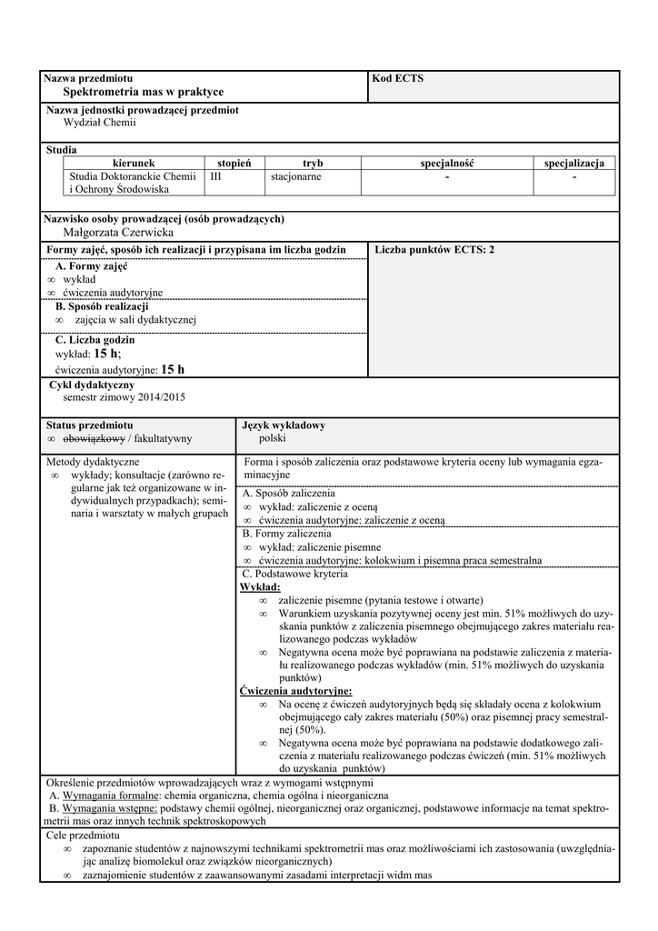 Nazwa przedmiotu Kod ECTS Spektrometria mas w praktyce Nazwa jednostki prowadzącej przedmiot Wydział Chemii Studia kierunek Studia Doktoranckie Chemii i Ochrony Środowiska stopień III tryb stacjonarne specjalność - specjalizacja - Nazwisko osoby prowadzącej (osób prowadzących) Małgorzata Czerwicka Formy zajęć, sposób ich realizacji i przypisana im liczba godzin Liczba punktów ECTS: 2 A. Formy zajęć • wykład • ćwiczenia audytoryjne B. Sposób realizacji • zajęcia w sali dydaktycznej C. Liczba godzin wykład: 15 h; ćwiczenia audytoryjne: 15 h Cykl dydaktyczny semestr zimowy 2014/2015 Status przedmiotu • obowiązkowy / fakultatywny Język wykładowy polski Metody dydaktyczne • wykłady; konsultacje (zarówno regularne jak też organizowane w indywidualnych przypadkach); seminaria i warsztaty w małych grupach Forma i sposób zaliczenia oraz podstawowe kryteria oceny lub wymagania egzaminacyjne A. Sposób zaliczenia • wykład: zaliczenie z oceną • ćwiczenia audytoryjne: zaliczenie z oceną B. Formy zaliczenia • wykład: zaliczenie pisemne • ćwiczenia audytoryjne: kolokwium i pisemna praca semestralna C. Podstawowe kryteria Wykład: • zaliczenie pisemne (pytania testowe i otwarte) • Warunkiem uzyskania pozytywnej oceny jest min. 51% możliwych do uzyskania punktów z zaliczenia pisemnego obejmującego zakres materiału realizowanego podczas wykładów • Negatywna ocena może być poprawiana na podstawie zaliczenia z materiału realizowanego podczas wykładów (min. 51% możliwych do uzyskania punktów) Ćwiczenia audytoryjne: • Na ocenę z ćwiczeń audytoryjnych będą się składały ocena z kolokwium obejmującego cały zakres materiału (50%) oraz pisemnej pracy semestralnej (50%). • Negatywna ocena może być poprawiana na podstawie dodatkowego zaliczenia z materiału realizowanego podczas ćwiczeń (min. 51% możliwych do uzyskania punktów) Określenie przedmiotów wprowadzających wraz z wymogami wstępnymi A. Wymagania formalne: chemia organiczna, chemia ogólna i nieorganiczna B. Wymagania wstępne: podstawy chemii ogólnej, nieorganicznej oraz organicznej, podstawowe informacje na temat spektrometrii mas oraz innych technik spektroskopowych Cele przedmiotu • zapoznanie studentów z najnowszymi technikami spektrometrii mas oraz możliwościami ich zastosowania (uwzględniając analizę biomolekuł oraz związków nieorganicznych) • zaznajomienie studentów z zaawansowanymi zasadami interpretacji widm mas Treści programowe A. Problematyka wykładu: Najnowsze techniki spektrometrii mas (budowa i zasadzie działania). Teoria procesu fragmentacji. Zasady interpretacji widm MS, MS/MS, MS3. Szczegółowe omówienie metody MRM (monitorowanie wybranych reakcji fragmentacji). Przykłady analizy biomolekuł i wybranych związków nieorganicznych z wykorzystaniem MS. Praktyczne zastosowanie spektrometrii mas w chemii, ochronie środowiska, biochemii, biotechnologii, medycynie i farmacji. B. Problematyka ćwiczeń audytoryjnych: Praktyczna interpretacja różnych rodzajów widm mas (MS, MS/MS, MS3) i ich zastosowanie do określenia struktury związków organicznych. Wykorzystanie spektrometrii mas do analizy wybranych związków nieorganicznych Wykaz literatury A. Literatura podstawowa 1. R. A. W. Johnstone, M. E. Rose, Spektrometria mas, PWN, Warszawa 2001 2. R. M. Silverstein, F. X. Webster, D. J. Kiemle, Spektroskopowe metody identyfikacji związków organicznych, PWN, Warszawa 2007 3. J. Charette, E. De Hoffmann , V. Stroobant, Spektrometria mas, WNT, 1998 4. http://masspec.scripps.edu/index.php B. Literatura uzupełniająca 1. J. R. Chapman, Practical Organic Mass Spectrometry: A Guide for Chemical and Biochemical Analysis, Chichester: John Wiley & Sons, 1995 2. K. Downard, Mass Spectrometry: A Foundation Course, The Royal Society of Chemistry, Cambridge, 2004 3. J. Barker , Mass Spectrometry: Analytical Chemistry by Open Learning, Chichester: John Wiley & Sons, 1998 4. J. Kapała, Metody interpretacji widm mas związków nieorganicznych i ich zastosowania w wybranych badaniach, Oficyna Wyd.Politechniki Wrocławskiej, Wrocław, 2010 Efekty uczenia się: Wiedza: SD_W01: wykazuje zaawansowaną i aktualną interdyscy1. Zna zaawansowane techniki spektrometrii mas plinarną wiedzę z zakresu dziedzin nauki i dyscyplin nau- 2. Zna teorię procesu fragmentacji oraz zasady interpretacji widm mas uzyskanych przy użyciu różnych technik jonizacji; kowych obejmujących prowadzone badania naukowe 3. Zna przykłady stosowania zaawansowanych technik spektromeSD_W02: wykazuje zaawansowaną wiedzę z zakresu metodologii prowadzenia badań naukowych, zasad planowania trii mas w badaniach naukowych z zakresu chemii, ochrony środowiska, biochemii, biotechnologii, medycyny i farmacji. badań i ich realizacji z wykorzystaniem interdyscyplinarnych technik i narzędzi badawczych Sposób weryfikacji przyswojenia wiedzy: SD_W05: opisuje i stosuje zasady bezpieczeństwa i higieny Student poprawnie odpowiada na pytania związane z zagadnieniami poruszanymi podczas zajęć (SD_W01, SD_W02, SD_W05) podczas organizacji pracy w pracowni naukowej oraz dydaktycznej SD_U01: samodzielnie planuje i wykonuje zadania badaw- Umiejętności: cze lub ekspertyzy stosując zaawansowane techniki i narzę- 1. W oparciu o charakterystykę analizowanych substancji chedzia badawcze; dokumentuje i interpretuje uzyskane wyniki micznych potrafi samodzielnie dokonać doboru odpowiedniej SD_U02: biegle wykorzystuje literaturę naukową i infortechniki spektrometrii mas (wybór źródła jonów, analizatora itp.); macje zgromadzone w bazach danych, w tym o charakterze 2. Analizuje i interpretuje widma mas uzyskane przy użyciu różinterdyscyplinarnym, związane z działalnością naukową i nych technik spektrometrii mas; dydaktyczną 3. Biegle wykorzystuje literaturę z zakresu spektrometrii mas.oraz SD_U04: w planowaniu i prowadzeniu badań wykorzystuje dostępne bazy widm mas. osi