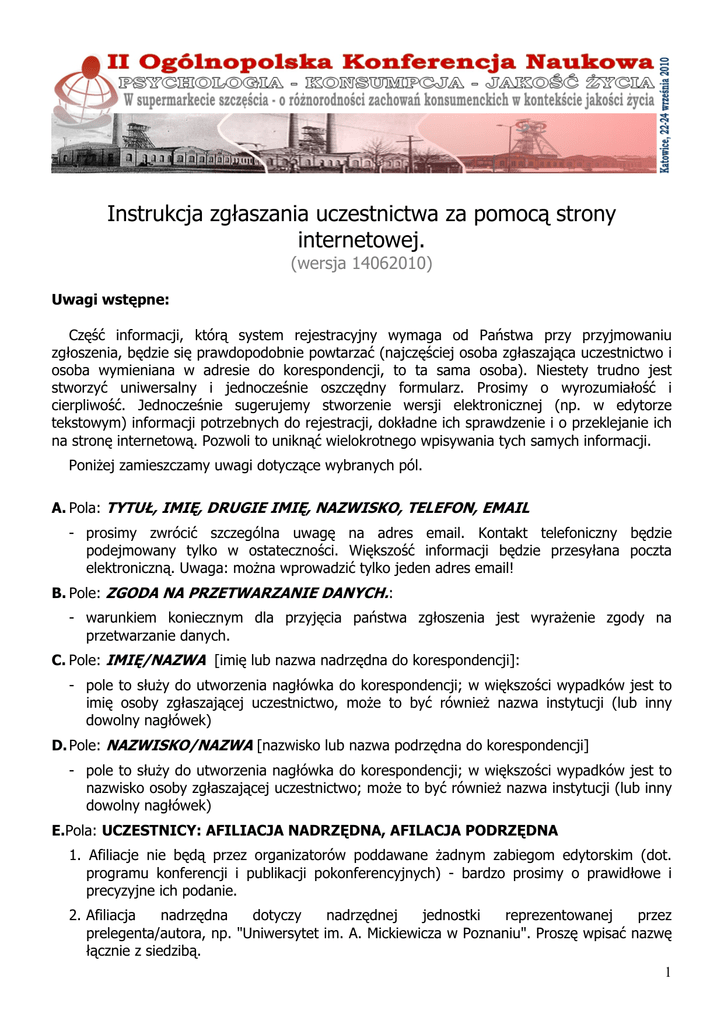 Instrukcja zgłaszania uczestnictwa za pomocą strony internetowej. (wersja 14062010) Uwagi wstępne: Część informacji, którą system rejestracyjny wymaga od Państwa przy przyjmowaniu zgłoszenia, będzie się prawdopodobnie powtarzać (najczęściej osoba zgłaszająca uczestnictwo i osoba wymieniana w adresie do korespondencji, to ta sama osoba). Niestety trudno jest stworzyć uniwersalny i jednocześnie oszczędny formularz. Prosimy o wyrozumiałość i cierpliwość. Jednocześnie sugerujemy stworzenie wersji elektronicznej (np. w edytorze tekstowym) informacji potrzebnych do rejestracji, dokładne ich sprawdzenie i o przeklejanie ich na stronę internetową. Pozwoli to uniknąć wielokrotnego wpisywania tych samych informacji. Poniżej zamieszczamy uwagi dotyczące wybranych pól. A. Pola: TYTUŁ, IMIĘ, DRUGIE IMIĘ, NAZWISKO, TELEFON, EMAIL - prosimy zwrócić szczególna uwagę na adres email. Kontakt telefoniczny będzie podejmowany tylko w ostateczności. Większość informacji będzie przesyłana poczta elektroniczną. Uwaga: można wprowadzić tylko jeden adres email! B. Pole: ZGODA NA PRZETWARZANIE DANYCH.: - warunkiem koniecznym dla przyjęcia państwa zgłoszenia jest wyrażenie zgody na przetwarzanie danych. C. Pole: IMIĘ/NAZWA [imię lub nazwa nadrzędna do korespondencji]: - pole to służy do utworzenia nagłówka do korespondencji; w większości wypadków jest to imię osoby zgłaszającej uczestnictwo, może to być również nazwa instytucji (lub inny dowolny nagłówek) D. Pole: NAZWISKO/NAZWA [nazwisko lub nazwa podrzędna do korespondencji] - pole to służy do utworzenia nagłówka do korespondencji; w większości wypadków jest to nazwisko osoby zgłaszającej uczestnictwo; może to być również nazwa instytucji (lub inny dowolny nagłówek) E.Pola: UCZESTNICY: AFILIACJA NADRZĘDNA, AFILACJA PODRZĘDNA 1. Afiliacje nie będą przez organizatorów poddawane żadnym zabiegom edytorskim (dot. programu konferencji i publikacji pokonferencyjnych) - bardzo prosimy o prawidłowe i precyzyjne ich podanie. 2. Afiliacja nadrzędna dotyczy nadrzędnej jednostki reprezentowanej przez prelegenta/autora, np. "Uniwersytet im. A. Mickiewicza w Poznaniu". Proszę wpisać nazwę łącznie z siedzibą. 1 3. Afiliacja podrzędna dotyczy jednostki organizacyjnej funkcjonującej w ramach pewnej instytucji (jednostki nadrzędnej), np. "Instytut Psychologii". Uwagi końcowe. Przed zapisaniem informacji prosimy o sprawdzenie czy są one poprawne. Po zapisaniu informacji system prześle na Państwa konto mailowe (podane przy rejestracji) potwierdzenie rejestracji uczestnictwa. Uwaga: niektóre serwery mają zabezpieczenia antyspamowe, które blokują generowane automatycznie potwierdzenia rejestracji. Problem ten może być rozwiązany jedynie przez administratorów serwera. Niniejsza instrukcja może ulec zmianie - niektóre funkcje strony rejestracyjnej mogą zostać rozszerzone lub zmienione. 2