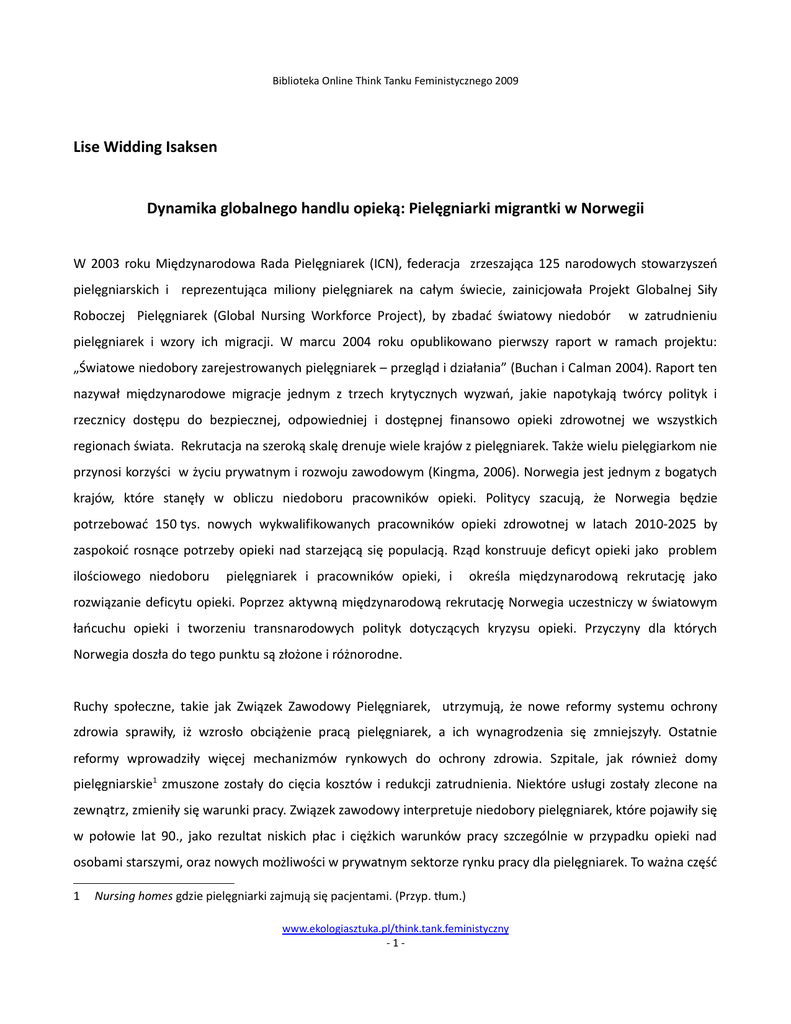 Biblioteka Online Think Tanku Feministycznego 2009 Lise Widding Isaksen Dynamika globalnego handlu opieką: Pielęgniarki migrantki w Norwegii W 2003 roku Międzynarodowa Rada Pielęgniarek (ICN), federacja zrzeszająca 125 narodowych stowarzyszeń pielęgniarskich i reprezentująca miliony pielęgniarek na całym świecie, zainicjowała Projekt Globalnej Siły Roboczej Pielęgniarek (Global Nursing Workforce Project), by zbadać światowy niedobór w zatrudnieniu pielęgniarek i wzory ich migracji. W marcu 2004 roku opublikowano pierwszy raport w ramach projektu: „Światowe niedobory zarejestrowanych pielęgniarek – przegląd i działania” (Buchan i Calman 2004). Raport ten nazywał międzynarodowe migracje jednym z trzech krytycznych wyzwań, jakie napotykają twórcy polityk i rzecznicy dostępu do bezpiecznej, odpowiedniej i dostępnej finansowo opieki zdrowotnej we wszystkich regionach świata. Rekrutacja na szeroką skalę drenuje wiele krajów z pielęgniarek. Także wielu pielęgiarkom nie przynosi korzyści w życiu prywatnym i rozwoju zawodowym (Kingma, 2006). Norwegia jest jednym z bogatych krajów, które stanęły w obliczu niedoboru pracowników opieki. Politycy szacują, że Norwegia będzie potrzebować 150 tys. nowych wykwalifikowanych pracowników opieki zdrowotnej w latach 2010-2025 by zaspokoić rosnące potrzeby opieki nad starzejącą się populacją. Rząd konstruuje deficyt opieki jako problem ilościowego niedoboru pielęgniarek i pracowników opieki, i określa międzynarodową rekrutację jako rozwiązanie deficytu opieki. Poprzez aktywną międzynarodową rekrutację Norwegia uczestniczy w światowym łańcuchu opieki i tworzeniu transnarodowych polityk dotyczących kryzysu opieki. Przyczyny dla których Norwegia doszła do tego punktu są złożone i różnorodne. Ruchy społeczne, takie jak Związek Zawodowy Pielęgniarek, utrzymują, że nowe reformy systemu ochrony zdrowia sprawiły, iż wzrosło obciążenie pracą pielęgniarek, a ich wynagrodzenia się zmniejszyły. Ostatnie reformy wprowadziły więcej mechanizmów rynkowych do ochrony zdrowia. Szpitale, jak również domy pielęgniarskie1 zmuszone zostały do cięcia kosztów i redukcji zatrudnienia. Niektóre usługi zostały zlecone na zewnątrz, zmieniły się warunki pracy. Związek zawodowy interpretuje niedobory pielęgniarek, które pojawiły się w połowie lat 90., jako rezultat niskich płac i ciężkich warunków pracy szczególnie w przypadku opieki nad osobami starszymi, oraz nowych możliwości w prywatnym sektorze rynku pracy dla pielęgniarek. To ważna część 1 Nursing homes gdzie pielęgniarki zajmują się pacjentami. (Przyp. tłum.) www.ekologiasztuka.pl/think.tank.feministyczny -1- Biblioteka Online Think Tanku Feministycznego 2009 obrazu sytuacji pielęgniarek, wrócę zatem powiązania między reformami a niedoborem pielęgniarek w podsumowaniu tekstu. Moim celem jest zaprezentowanie feministycznej analizy przyczyn kryzysu opieki i co się nań składa, oraz przeanalizowanie instytucjonalnych odpowiedzi na deficyt opieki. Toteż przyjrzę się jak reżimy migracyjne organizują międzynarodową rekrutację pielęgniarek, jak lokalne rynki pracy reagują na przybycie imigrantek i jakie są osobiste doświadczenia samych imigrantek. Relacje płci a lokalne deficyty opieki Tradycyjny podział płci w rodzinie W Norwegii do tej pory nie udało się rozwiązać problemu równości płci na poziomie podziału pracy w obrębie rodzin. Nawet jeśli młodzi ojcowie uczestniczą w społecznej i emocjonalnej opiece nad dziećmi, to na kobietach wciąż spoczywa główna odpowiedzialność za prace domowe i pracę opiekuńczą, także wtedy gdy pracują na pełen etat ( Lorentzen and Lappegård, 2009). „Nieobecni ojcowie” cały czas stanowią problem w życiu codziennym rodzin z małymi dziećmi. W przypadku rodzinnej opieki nad potrzebującymi pomocy matkami i ojcami w podeszłym wieku, można mówić o „nieobecnych synach”. We współczesnej norweskiej kulturze opieki tylko 13% rodzin deklaruje, że zajmą się starszą matką czy ojcem we własnym domu. Badania pokazują, że norwescy mężczyźni znacznie częściej niż kobiety odpowiadają, że podejmą się opieki nad osobą starszą jeśli zajdzie taka potrzeba. Jednakże praktyka życia codziennego pokazuje, że to kobiety zajmują się opieką i odpowiadają bardziej niechętnie niż mężczyźni na pytanie czy chciałyby opiekować się starszymi rodzicami w swoim własnym domu (Slagsvold, B., et. al. 2009). Na poziomie kulturowym relacje między męskością a opieką uwidacznia następujące zjawisko: podczas gdy współcześni młodzi ojcowie z dumą opowiadają publicznie o zmienianiu pieluszek i kąpaniu dzieci, nadal nie mamy do czynienia z sytuacją, kiedy mężczyźni w wieku 40 czy 50 lat dzielą się doświadczeniami zmieniania pieluch swoim matkom czy ojcom cierpiącym na nietrzymanie moczu lub też pomagania im w kąpieli. Zarówno publicznie jak i prywatnie opieka nad starszymi stała się zjawiskiem o niskim statusie i prestiżu, w dużej mierze związanym z uwiądem ciała i nieprzyjemną intymną opieką. www.ekologiasztuka.pl/think.tank.feministyczny -2- Biblioteka Online Think Tanku Feministycznego 2009 Demograficzne zmiany i integracja kobiet na rynku pracy Norweski deficyt opieki związany jest również z faktem, iż jesteśmy świadkami demograficznej zmiany w kompozycji populacji. Poprawa jakości warunków życia i wzrost długości życia doprowadziły do sytuacji, gdzie coraz więcej dzieci ma przyjemność dorastania zarówno z dziadkami jak i pradziadkami. Liczba osób powyżej 80 roku życia wzrasta, natomiast grupa powyżej 85 roku życia wzrasta najszybciej. Z drugiej strony, wskaźniki płodności wzrosły i zmieniły się wzorce prokreacyjne. Współczesne młode kobiety więcej lat poświęcają edukacji niż wcześniej, odkładając urodzenie pierwszego dziecka na później. Śre