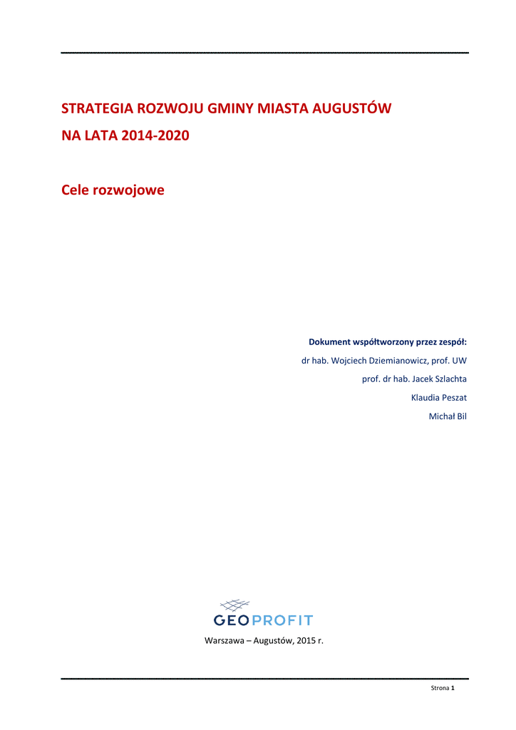 STRATEGIA ROZWOJU GMINY MIASTA AUGUSTÓW NA LATA 2014-2020 Cele rozwojowe Dokument współtworzony przez zespół: dr hab. Wojciech Dziemianowicz, prof. UW prof. dr hab. Jacek Szlachta Klaudia Peszat Michał Bil Warszawa – Augustów, 2015 r. Strona 1 CELE ROZWOJOWE Celem głównym Strategii rozwoju Augustowa jest wzrost zamożności mieszkańców. Zakłada on w perspektywie roku 2020 utworzenie atrakcyjnych warunków życia i prowadzenia działalności gospodarczej przyczyniających się do wzrostu dobrobytu mieszkańców Augustowa. Cel główny realizowany będzie poprzez dwa cele strategiczne: 1. Budowa nowoczesnej gospodarki z atrakcyjnymi miejscami pracy 2. Wysoka jakość życia Cele te są bardzo mocno umocowane w środowisku przyrodniczym. Realizacja każdego z nich jest ściśle związana z uwarunkowaniami środowiskowymi, ale jednocześnie zakłada dbałość o jego stan. CEL GŁÓWNY: WZROST ZAMOŻNOŚCI Cele strategiczne realizowane będą poprzez cele operacyjne. Dla każdego celu strategicznego przypisano pięć celów operacyjnych. Cele strategiczne zazębiają się, dlatego realizacja niektórych celów operacyjnych będzie oddziaływać zarówno na cel związany z gospodarką, jak i cel dotyczący jakości życia. Cele operacyjne realizowane będą dalej poprzez kierunki działań. Strona 2 CEL STRATEGICZNY 1. BUDOWA NOWOCZESNEJ GOSPODARKI Z ATRAKCYJNYMI MIEJSCAMI PRACY CEL OPERACYJNY 1.1. DYNAMICZNY ROZWÓJ NOWOCZESNYCH I PRZYJAZNYCH ŚRODOWISKU FUNKCJI PRZEMYSŁOWO-USŁUGOWYCH W ramach tego celu operacyjnego przewidywane są następujące kierunki działań: Przygotowanie terenów pod działalność gospodarczą Władze miasta będą dążyły do organizowania stref aktywności gospodarczej (np. podstrefy specjalnej strefy ekonomicznej). W tym kierunku działań ważna będzie również współpraca Augustowa z gminami ościennymi, w szczególności gminą wiejską Augustów, w celu wspólnego przygotowania atrakcyjnych, położonych w pobliżu obwodnicy Augustowa uzbrojonych w media gruntów dla inwestorów. Wprowadzenie systemu ulg i zwolnień z podatku od nieruchomości dla przedsiębiorców Wdrożony zostanie system zachęt podatkowych skierowanych do mikro, małych i średnich przedsiębiorców prowadzących działalność gospodarczą „wpisującą się” w inteligentne specjalizacje województwa podlaskiego, a w szczególności sektory kluczowe dla Augustowa. Tym kierunkiem działań powinny zostać objęte również osoby rozpoczynające pracę na własny rachunek, w tym również w sektorze ekonomii społecznej. Wspieranie konkurencyjności lokalnych przedsiębiorstw Wsparcie funkcjonowania i rozwoju przedsiębiorstw z terenu Augustowa, w szczególności prowadzących działalność związaną z inteligentnymi specjalizacjami województwa podlaskiego przyczyni się do podniesienia ich konkurencyjności nie tylko na arenie krajowej, ale i międzynarodowej. W ramach tego kierunku prowadzone będą działania wzmacniające m.in. potencjał produkcyjny, usługowy, eksportowy, ale i badawczy lokalnych przedsiębiorstw. Nawiązanie współpracy z Parkiem Naukowo-Technologicznym Polska-Wschód w Suwałkach Miasto Augustów nawiąże ścisłą współpracę z Parkiem Naukowo-Technologicznym w Suwałkach, której celem będzie profesjonalne wsparcie przedsiębiorstw w zakresie doradztwa, transferu wiedzy oraz wspólnej promocji. Utworzenie i rozwój samorządu gospodarczego Budowa silnej organizacji reprezentującej przedsiębiorców, która będzie partnerem do rozmów zarówno z władzami lokalnymi, jak i innymi instytucjami publicznymi. Dzięki wspólnej reprezentacji głos przedsiębiorców z Augustowa będzie lepiej słyszalny w regionie, a także na szczeblu centralnym, np. przy okazji dyskusji o zmianie ustawy o uzdrowiskach, zwiększającej możliwości prowadzenia działalności gospodarczej w miejscowościach o takim statusie. Rewitalizacja i zagospodarowanie przestrzeni miejskiej Celem tego kierunku działań jest przywrócenie budynków i zaniedbanych terenów miejskich Miastu. Kompleksowa modernizacja, rewitalizacja i rehabilitacja tych obszarów pozwoli wprowadzić tam nowe, przyjazne dla miasta funkcje, w tym usługowo-handlowe. Rewitalizacja ma charakter najczęściej wieloaspektowy, dlatego jej przeprowadzenie będzie również ważne dla realizacji celów 1.4 i 2.2. Strona 3 CEL OPERACYJNY 1.2. ROZWÓJ POSTAW PRZEDSIĘBIORCZYCH W ramach tego celu operacyjnego przewidywane są następujące kierunki działań: Wdrożenie programów rozwoju przedsiębiorczości i kreatywności w szkołach podstawowych i gimnazjach oraz rozszerzenie oferty w szkołach ponadgimnazjalnych Programy realizowane będą na wszystkich szczeblach edukacji przedszkolnej i szkolnej. W ich ramach prowadzone będą cykliczne zajęcia i warsztaty nastawione na wspieranie i kształtowanie postaw przedsiębiorczych, w szczególności rozwijające umiejętność samodzielnego, kreatywnego myślenia, umiejętności autoprezentacji i budowania ścieżki rozwoju zawodowego, a także pracy w zespole. Utworzenie inkubatora przedsiębiorczości Rozwój biznesu wymaga dostępności odpowiedniego miejsca pod prowadzenie działalności gospodarczej, a także wsparcia instytucji otoczenia biznesu. Podjęte zostaną działania w zakresie utworzenia inkubatora przedsiębiorczości, w którym szczególnie nowe firmy będą mogły uzyskać na preferencyjnych warunkach przestrzeń do pracy, a także skorzystać z usług okołobiznesowych. CEL OPERACYJNY 1.3. BUDOWA NOWOCZESNEGO, CHĘTNIE ODWIEDZANEGO PRZEZ KURACJUSZY I TURYSTÓW UZDROWISKA Biorąc pod uwagę trendy związane ze zmianą profilu typowego kuracjusza uzdrowisk w ostatnich latach, należy dążyć do przyciągania do Augustowa osób młodych, aktywnych, chcących korzystać z bogatej i różnorodnej oferty usług medycznych, relaksacyjnych i kosmetycznych. Należy zauważyć również, że grupa ta, w przeciwieństwie do kuracjuszy kier