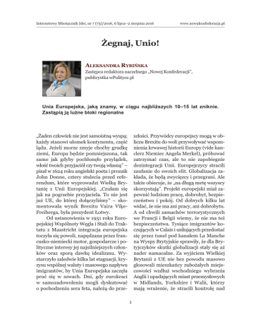 Internetowy Miesięcznik Idei, nr 7 (73)/2016, 6 lipca–2 sierpnia 2016 www.nowakonfederacja.pl Żegnaj, Unio! AleksAndrA rybińskA Zastępca redaktora naczelnego „Nowej Konfederacji”, publicystka wPolityce.pl Unia Europejska, jaką znamy, w ciągu najbliższych 10–15 lat zniknie. Zastąpią ją luźne bloki regionalne „Żaden człowiek nie jest samoistną wyspą; każdy stanowi ułomek kontynentu, część lądu. Jeżeli morze zmyje choćby grudkę ziemi, Europa będzie pomniejszona, tak samo jak gdyby pochłonęło przylądek, włość twoich przyjaciół czy twoją własną” – pisał w 1624 roku angielski poeta i prozaik John Donne, cztery stulecia przed referendum, które wyprowadzi Wielką Brytanię z Unii Europejskiej. „Czułam się jak na pogrzebie przyjaciela. To nie jest już UE, do której dołączyliśmy” – skomentowała wynik Brexitu Vaira VīķeFreiberga, była prezydent Łotwy. Od ustanowienia w 1951 roku Europejskiej Wspólnoty Węgla i Stali do Traktatu z Maastricht integracja europejska toczyła się powoli, napędzana przez francusko-niemiecki motor, gospodarcze i polityczne interesy jej najsilniejszych członków oraz sporą dawkę idealizmu. Wystarczyło zaledwie kilka lat stagnacji, kryzysu wspólnej waluty i masowego napływu imigrantów, by Unia Europejska zaczęła pruć się w szwach. Dni, gdy eurokraci w samozadowoleniu mogli dyskutować o pochodzeniu sera feta, należą do prze- szłości. Przywódcy europejscy mogą w obliczu Brexitu do woli przywoływać wspomnienia krwawej historii Europy (vide kanclerz Niemiec Angela Merkel), próbować zatrzymać czas, ale to nie zapobiegnie dezintegracji Unii. Europejczycy stracili zaufanie do swoich elit. Globalizacja zakłada, że będą zwycięzcy i przegrani. Ale także obiecuje, że „na długą metę wszyscy skorzystają”. Projekt europejski miał zapewnić ludziom pracę, dobrobyt, bezpieczeństwo i pokój. Od dobrych kilku lat widać, że nie ma ani pracy, ani dobrobytu. A od chwili zamachów terrorystycznych we Francji i Belgii wiemy, że nie ma też bezpieczeństwa. Tysiące imigrantów koczujących w Calais i usiłujących przedostać się przez tunel pod kanałem La Manche na Wyspy Brytyjskie sprawiły, że dla Brytyjczyków skutki globalizacji stały się aż nader namacalne. Za wyjściem Wielkiej Brytanii z UE nie bez powodu masowo głosowali mieszkańcy zubożałych miejscowości wzdłuż wschodniego wybrzeża Anglii i upadających miast przemysłowych w Midlands, Yorkshire i Walii, którzy mają wrażenie, że stracili kontrolę nad 1 Internetowy Miesięcznik Idei, nr 7 (73)/2016, 6 lipca–2 sierpnia 2016 własnym losem. Jak powiedział niegdyś ekonomista John Maynard Keynes – „w polityce nie ma co liczyć na cierpliwość ludzi, bo na dłuższą metę wszyscy będziemy martwi”. www.nowakonfederacja.pl wyprzedaży majątku narodowego, nadzoru i tłamszenia, a Ateny są wciąż w tym samym miejscu, w którym były w 2010 roku. Unia Europejska to nieudany projekt elit. Referendum w Wielkiej Brytanii to element przetworzenia go w projekt obywateli, dający nadzieję na przełamanie zastoju i zwiększenia demokratycznej legitymizacji UE. Europejskie elity powinny więc zareagować na Brexit obszernym mea culpa, bić się w pierś, przyznać, że Integracja w ślepym zaułku 20 lat temu, kiedy z EWG rodziła się UE, zderzyły się ze sobą dwie przeciwstawne koncepcje: luźnej konfederacji niepodległych państw, które wspólnie ustalają ze sobą ramy i zasady paneuropejskiej współpracy (koncepcja anglosaska), oraz federacji, w której państwa narodowe będą stopniowo zrzekać się swojej niepodległości, na rzecz paneuropejskiego centrum (koncepcja francusko-niemiecka). Zwyciężyła ta druga. Brytyjczycy nigdy się z tym nie pogodzili – nie zamierzali rezygnować z funta, nie weszli do strefy Schengen, ograniczali jak tylko mogli działanie wielu unijnych norm. I im bardziej Europa zmierzała w kierunku federacji, tym bardziej aktualne stawało się pytanie: „kiedy?”, bo tych dwóch wizji Europy nie dało się ze sobą pogodzić. Unię Europejską opuszcza kraj najmniej z nią związany. Za nim podążą kolejne. Tym bardziej, iż integracja europejska, rozumiana jako proces tworzenia ponadnarodowego państwa, już dawno utknęła w miejscu. Próba ustanowienia politycznej Unii poprzez Traktat Konstytucyjny się nie powiodła i dała nam – w mękach – Traktat Lizboński. Euro – jak zakładał jego pomysłodawca Jacques Delors – także nie doprowadziło do zrośnięcia się Europy. Wręcz przeciwnie. Podzieliło ją na centrum i peryferie, na dłużników i wierzycieli. Grecja to wręcz wzorcowy przykład porażki europejskiego projektu i tak często przywoływanej europejskiej solidarności: sześć lat zaciskania pasa, im bardziej europa zmierzała w kierunku federacji, tym bardziej aktualne stawało się pytanie, kiedy Wielka brytania wystąpi z Ue euro to pomyłka, a federacja – jeśli do dziś nie udało się jej utworzyć – już nie powstanie. Powinny podjąć reformę wspólnoty, o której w swoim tekście pisze mój kolega Michał Kuź. Zamiast tego wolą jednak pogrążać się dalej w kłamstwie. Czym innym są propozycje szefów MSZ Francji i Niemiec, Franka-Waltera Steinmeiera i Jeana-Marca Ayraulta, pogłębienia integracji, uwspólnotowienia szeregu polityk unijnych, w tym azylowej i bezpieczeństwa. Lub plan reform, jaki przedstawił minister finansów Niemiec Wolfgang Schäuble, zakładający zwiększenie nadzoru nad gospodarkami i budżetami krajów eurostrefy przez nowo utworzone w tym celu ciała regulacyjne, znajdujące się już nie tylko poza kontrolą tych państw, ale także Komisji Europejskiej. Reformy, która stanowiłaby „krok 2 Internetowy Miesięcznik Idei, nr 7 (73)/2016, 6 lipca–2 sierpnia 2016 do tyłu”, o co apeluje m.in. były kanclerz Niemiec Helmut Kohl, nie będzie, bo nikomu, z wyjątkiem coraz bardziej sfrustr