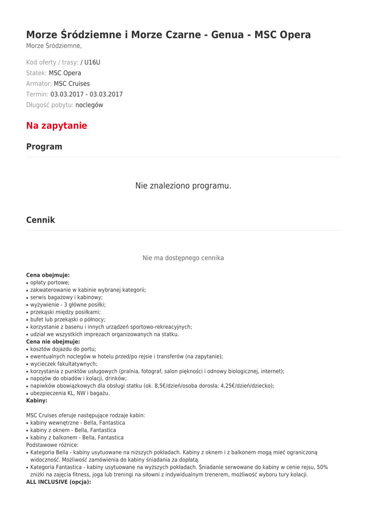 Morze Śródziemne i Morze Czarne - Genua - MSC Opera Morze Śródziemne, Kod oferty / trasy: / U16U Statek: MSC Opera Armator: MSC Cruises Termin: 03.03.2017 - 03.03.2017 Długość pobytu: noclegów Na zapytanie Program Nie znaleziono programu. Cennik Nie ma dostępnego cennika Cena obejmuje: opłaty portowe; zakwaterowanie w kabinie wybranej kategorii; serwis bagażowy i kabinowy; wyżywienie - 3 główne posiłki; przekąski między posiłkami; bufet lub przekąski o północy; korzystanie z basenu i innych urządzeń sportowo-rekreacyjnych; udział we wszystkich imprezach organizowanych na statku. Cena nie obejmuje: kosztów dojazdu do portu; ewentualnych noclegów w hotelu przed/po rejsie i transferów (na zapytanie); wycieczek fakultatywnych; korzystania z punktów usługowych (pralnia, fotograf, salon piękności i odnowy biologicznej, internet); napojów do obiadów i kolacji, drinków; napiwków obowiązkowych dla obsługi statku (ok. 8,5€/dzień/osoba dorosła; 4,25€/dzień/dziecko); ubezpieczenia KL, NW i bagażu. Kabiny: ● ● ● ● ● ● ● ● ● ● ● ● ● ● ● MSC Cruises oferuje następujące rodzaje kabin: kabiny wewnętrzne - Bella, Fantastica kabiny z oknem - Bella, Fantastica kabiny z balkonem - Bella, Fantastica Podstawowe różnice: Kategoria Bella - kabiny usytuowane na niższych pokładach. Kabiny z oknem i z balkonem mogą mieć ograniczoną widoczność. Możliwość zamówienia do kabiny śniadania za dopłatą. Kategoria Fantastica - kabiny usytuowane na wyższych pokładach. Śniadanie serwowane do kabiny w cenie rejsu, 50% zniżki na zajęcia fitness, joga lub treningi na siłowni z indywidualnym trenerem, możliwość wyboru tury kolacji. ALL INCLUSIVE (opcja): ● ● ● ● ● Istnieje możliwość wykupienia pakietu ALL INCLUSIVE obejmującego wybrane napoje alkoholowe i bezalkoholowe dostępne bez ograniczeń we wszystkich barach. Cena pakietu: 26€/dzień/osoba dorosła; 12€/dzień/dziecko. Dla rejsów po Ameryce Południowej oraz rozpoczynających się z portu Miami obowiązuje pakiet all incusive "More for Less" ● ● Cena pakietu: More for Less Classic 37,55€/dzień/osoba dorosła; 19€/dzień/dziecko. More for Less Premium 51€/dzień/osoba dorosła; 26€/dzień/dziecko. Szczegóły ● ● ● ● Warunkiem skorzystania z pakietu all inclusive jest wykupienie pakietu przez wszystkich pasażerów podróżujących w jednej kabinie na czas całego rejsu. Uwagi: Kabiny 3/4 osobowe nie są dostępne we wszystkich kategoriach, a ich liczba jest ograniczona - sprzedaż tylko po potwierdzeniu; ceny wycieczek fakultatywnych, propozycje dojazdu do portu, hoteli przed/po rejsie na zapytanie. Na pokładzie statku obowiązuje bezgotówkowy system opłat. Należność reguluje się ostatniego dnia rejsu gotówką (wpłata depozytu ok. 250€/kabina pierwszego dnia rejsu) lub kartą kredytową (VISA, Mastercard, American Express) na podstawie zbiorczego rachunku. Karty kredytowe należy zarejestrować zaraz po zaokrętowaniu. Opublikowane informacje nie stanowią oferty handlowej w rozumieniu kodeksu cywilnego