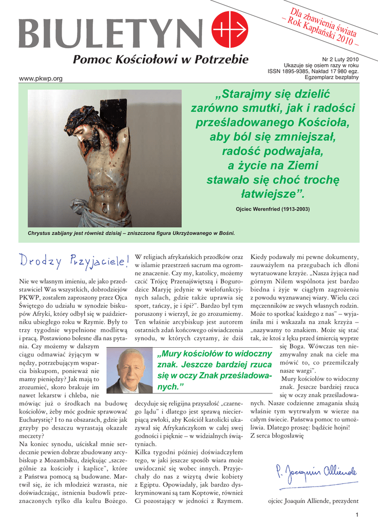 D – Rola zbawie k Ka nia ś płań wiat ski 2 a 010 – Pomoc KoÊcio∏owi w Potrzebie www.pkwp.org Nr 2 Luty 2010 Ukazuje si´ osiem razy w roku ISSN 1895-9385, Nak∏ad 17 980 egz. Egzemplarz bezp∏atny „Starajmy się dzielić zarówno smutki, jak i radości prześladowanego Kościoła, aby ból się zmniejszał, radość podwajała, a życie na Ziemi stawało się choć trochę łatwiejsze”. Ojciec Werenfried (1913-2003) Chrystus zabijany jest również dzisiaj – zniszczona figura Ukrzyżowanego w Bośni. Nie we własnym imieniu, ale jako przedstawiciel Was wszystkich, dobrodziejów PKWP, zostałem zaproszony przez Ojca Świętego do udziału w synodzie biskupów Afryki, który odbył się w październiku ubiegłego roku w Rzymie. Były to trzy tygodnie wypełnione modlitwą i pracą. Postawiono bolesne dla nas pytania. Czy możemy w dalszym ciągu odmawiać żyjącym w nędzy, potrzebującym wsparcia biskupom, ponieważ nie mamy pieniędzy? Jak mają to zrozumieć, skoro brakuje im nawet lekarstw i chleba, nie mówiąc już o środkach na budowę kościołów, żeby móc godnie sprawować Eucharystię? I to na obszarach, gdzie jak grzyby po deszczu wyrastają okazałe meczety? Na koniec synodu, uściskał mnie serdecznie pewien dobrze zbudowany arcybiskup z Mozambiku, dziękując „szczególnie za kościoły i kaplice”, które z Państwa pomocą są budowane. Martwił się, że ich młodzież wzrasta, nie doświadczając, istnienia budowli przeznaczonych tylko dla kultu Bożego. Kiedy podawały mi pewne dokumenty, zauważyłem na przegubach ich dłoni wytatuowane krzyże. „Nasza żyjąca nad górnym Nilem wspólnota jest bardzo biedna i żyje w ciągłym zagrożeniu z powodu wyznawanej wiary. Wielu czci męczenników ze swych własnych rodzin. Może to spotkać każdego z nas” – wyjaśniła mi i wskazała na znak krzyża – „nazywamy to znakiem. Może się stać tak, że ktoś z lęku przed śmiercią wyprze się Boga. Wówczas ten nie„Mury kościołów to widoczny zmywalny znak na ciele ma znak. Jeszcze bardziej rzuca mówić to, co przemilczały nasze wargi”. się w oczy Znak prześladowa- Mury kościołów to widoczny znak. Jeszcze bardziej rzuca nych.” się w oczy znak prześladowadecyduje się religijna przyszłość „czarne- nych. Nasze codzienne zmagania służą go lądu” i dlatego jest sprawą niecier- właśnie tym wytrwałym w wierze na piącą zwłoki, aby Kościół katolicki uka- całym świecie. Państwa pomoc to umożzywał się Afrykańczykom w całej swej liwia. Dlatego proszę: bądźcie hojni! godności i pięknie – w widzialnych świą- Z serca błogosławię tyniach. Kilka tygodni później doświadczyłem tego, w jaki jeszcze sposób wiara może uwidocznić się wobec innych. Przyjechały do nas z wizytą dwie kobiety z Egiptu. Opowiadały, jak bardzo dyskryminowani są tam Koptowie, również ojciec Joaquín Alliende, prezydent Ci pozostający w jedności z Rzymem. W religiach afrykańskich przodków oraz w islamie przestrzeń sacrum ma ogromne znaczenie. Czy my, katolicy, możemy czcić Trójcę Przenajświętszą i Bogurodzice Maryję jedynie w wielofunkcyjnych salach, gdzie także uprawia się sport, tańczy, je i śpi?”. Bardzo był tym poruszony i wierzył, że go zrozumiemy. Ten właśnie arcybiskup jest autorem ostatnich zdań końcowego oświadczenia synodu, w których czytamy, że dziś 1 Zabliźniają się także rany duszy wania o d a l ś e Prz Krajobraz po szale nienawiści – kościół w Kandhamal w Orisie. Prześladowania skończą się dopiero wtedy, gdy znów zwycięży miłość – lekcja przebaczania i zaufania w Indiach. „Zbawia nie przemoc, lecz miłość. Świat został zbawiony przez Ukrzyżowanego, a nie przez tych, którzy krzyżują. Świat jest zbawiany dzięki Bożej cierpliwości, a niszczony przez ludzką niecierpliwość”. Słowa te wypowiedział Ojciec Święty, gdy przed pięciu laty obejmował swój urząd. Jakże często od tego czasu znajdowały już one potwierdzenie! Wszędzie tam, gdzie trwają brutalne czy też bardziej subtelne prześladowania chrześcijan, ujawnia się siła tych, którzy krzyżują, ale objawia się i siła miłości. Państwa miłości. Z jaką cierpliwością kamień po kamieniu odbudowywane są kaplice. Ileż potrzeba cierpliwości, by uleczyć rany duszy! W Indiach, dzięki Wam, staje się możliwe i jedno, i drugie! W czasie pogromów w Orisie, latem 2008 roku, zabitych zostało około stu chrześcijan, dziesiątki tysięcy musiały uciekać, zniszczono kościoły i domy parafialne. Wciąż jeszcze tysiące osób mieszka w obozach dla uchodźców i boi się wrócić. Abp Raphael Cheenath jest przekonany, że „pokój może nastać znów tylko wówczas, gdy ci, którzy doznali przeżyli traumę, Kaplica w Guronys ma pomagać w „gojeniu się ran”. 2 Symbolem odnowy religijnej w Czechach są kolędnicy. Schronienie dla dzieci prześladowanych chrześcijan w Iraku. Oni nigdy nie przestali się modlić – chrześcijanie w Chinach proszą o pomoc dla kleryków i odbudowę zrujnowanych kościołów. otrzymają odpowiednią pomoc psychologiczną”. Wraz ze współpracownikami opracował program, mający na celu „przywrócenie godności i wewnętrznego pokoju” 5031 rodzinom z okręgu Kandhamal. Wspólnie z chrześcijańskimi specjalistami w dziedzinie rozwiązywania konfliktów, przeszkoleni zostaną – na początek na poziomie diecezjalnym – ochotnicy, którzy następnie udadzą się do rodzin w obozach i blisko 450 wioskach. Rozmowy indywidualne i grupowe, medytacje i grupy modlitewne mają stopniowo przywrócić ludziom nadzieję. Kościół naucza, że pokój i jedność to owoce sprawiedliwości. Zaczyna się to już od jednostek i ich godności. Zaprowadzanie pokoju, to ciężka praca i wiążą się z nią znaczne koszty. Na ten projekt pilotażowy obiecaliśmy w tym roku 80 000 zł. Prześladowania skończą się dopiero wtedy, gdy usunie si