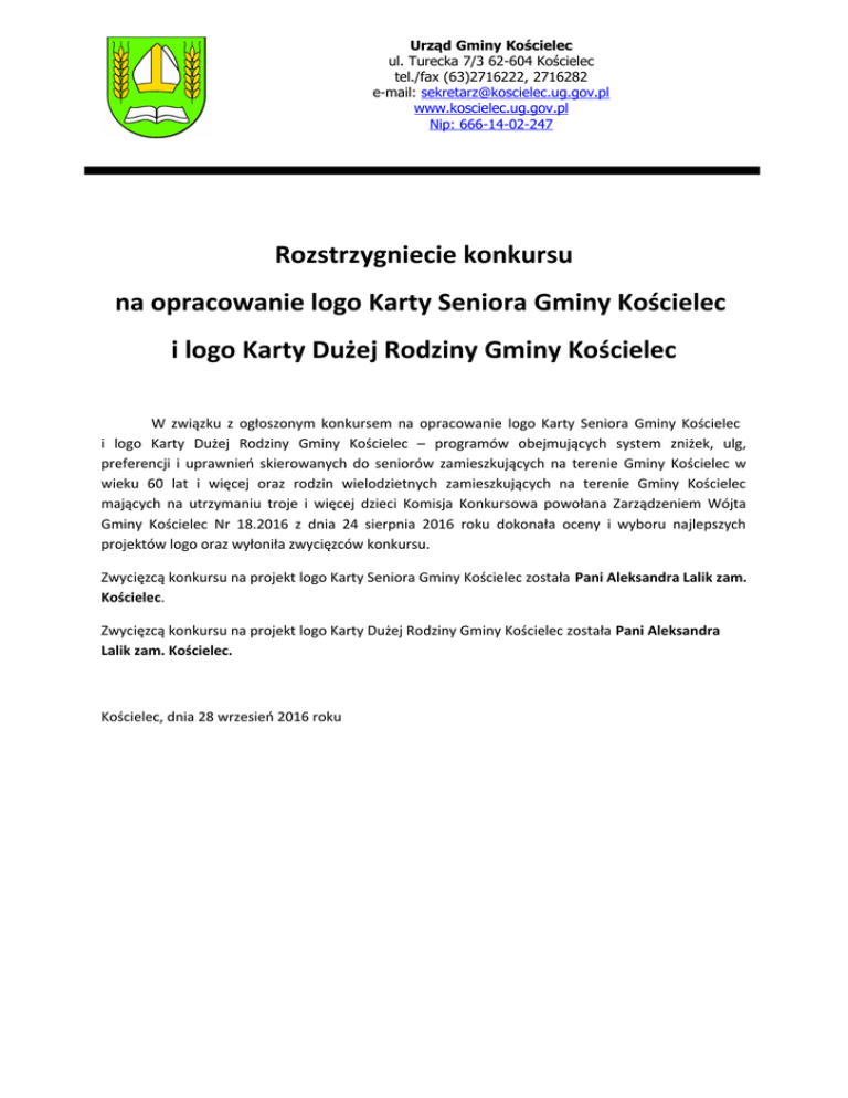 Urząd Gminy Kościelec ul. Turecka 7/3 62-604 Kościelec tel./fax (63)2716222, 2716282 e-mail: [email protected] www.koscielec.ug.gov.pl Nip: 666-14-02-247 Rozstrzygniecie konkursu na opracowanie logo Karty Seniora Gminy Kościelec i logo Karty Dużej Rodziny Gminy Kościelec W związku z ogłoszonym konkursem na opracowanie logo Karty Seniora Gminy Kościelec i logo Karty Dużej Rodziny Gminy Kościelec – programów obejmujących system zniżek, ulg, preferencji i uprawnień skierowanych do seniorów zamieszkujących na terenie Gminy Kościelec w wieku 60 lat i więcej oraz rodzin wielodzietnych zamieszkujących na terenie Gminy Kościelec mających na utrzymaniu troje i więcej dzieci Komisja Konkursowa powołana Zarządzeniem Wójta Gminy Kościelec Nr 18.2016 z dnia 24 sierpnia 2016 roku dokonała oceny i wyboru najlepszych projektów logo oraz wyłoniła zwycięzców konkursu. Zwycięzcą konkursu na projekt logo Karty Seniora Gminy Kościelec została Pani Aleksandra Lalik zam. Kościelec. Zwycięzcą konkursu na projekt logo Karty Dużej Rodziny Gminy Kościelec została Pani Aleksandra Lalik zam. Kościelec. Kościelec, dnia 28 wrzesień 2016 roku