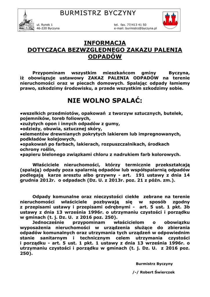 BURMISTRZ BYCZYNY ul. Rynek 1 46-220 Byczyna tel. fax. 77/413 41 50 e-mail: [email protected] INFORMACJA DOTYCZĄCA BEZWZGLĘDNEGO ZAKAZU PALENIA ODPADÓW Przypominam wszystkim mieszkańcom gminy Byczyna, iż obowiązuje ustawowy ZAKAZ PALENIA ODPADÓW na terenie nieruchomości oraz w piecach domowych. Spalając odpady łamiemy prawo, szkodzimy środowisku, a przede wszystkim szkodzimy sobie. NIE WOLNO SPALAĆ: ●wszelkich przedmiotów, opakowań z tworzyw sztucznych, butelek, pojemników, toreb foliowych, ●zużytych opon i innych odpadów z gumy, ●odzieży, obuwia, sztucznej skóry, ●elementów drewnianych pokrytych lakierem lub impregnowanych, podkładów kolejowych, ●opakowań po farbach, lakierach, rozpuszczalnikach, środkach ochrony roślin, ●papieru bielonego związkami chloru z nadrukiem farb kolorowych. Właściciele nieruchomości, którzy termicznie przekształcają (spalają) odpady poza spalarnią odpadów lub współspalarnią odpadów podlegają karze aresztu albo grzywny - art. 191 ustawy z dnia 14 grudnia 2012r. o odpadach (Dz. U. z 2013r. poz. 21 z późn. zm.). Odpady komunalne oraz nieczystości ciekłe zebrane na terenie nieruchomości właściciele pozbywają się w sposób zgodny z przepisami ustawy i przepisami odrębnymi - art. 5 ust. 1 pkt. 3b ustawy z dnia 13 września 1996r. o utrzymaniu czystości i porządku w gminach (t. j. Dz. U. z 2016 poz. 250). Jednocześnie przypominam właścicielom o obowiązku wyposażenia nieruchomości w urządzenia służące do zbierania odpadów komunalnych oraz utrzymania tych urządzeń w odpowiednim stanie sanitarnym i technicznym celem utrzymania czystości i porządku - art. 5 ust. 1 pkt. 1 ustawy z dnia 13 września 1996r. o utrzymaniu czystości i porządku w gminach (t. j. Dz. U. z 2016 poz. 250). Burmistrz Byczyny /-/ Robert Świerczek
