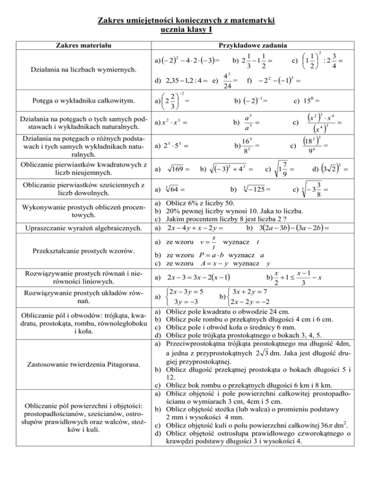 Zakres umiejętności koniecznych z matematyki ucznia klasy I Zakres materiału Przykładowe zadania a) 2 4 2 3 = 2 Działania na liczbach wymiernych. 42 d) 2,35 1,2 : 4 e) = 24 2 Potęga o wykładniku całkowitym. 1 1 b) 2 1 3 2 2 a) 2 = 3 f) 2 2 1 3 b) 2 = 1 Działania na potęgach o tych samych pod- a) x 2 x 3 stawach i wykładnikach naturalnych. a5 b) 3 a Działania na potęgach o różnych podstawach i tych samych wykładnikach naturalnych. Obliczanie pierwiastków kwadratowych z liczb nieujemnych. 16 5 b) 5 = 8 Obliczanie pierwiastków sześciennych z liczb dowolnych. Wykonywanie prostych obliczeń procentowych. Upraszczanie wyrażeń algebraicznych. a) 2 5 5 c) 4 4 3 2 3 c) c) 1 125 = 96 7 9 d) 3 2 3 2 3 8 Oblicz 6% z liczby 50. 20% pewnej liczby wynosi 10. Jaka to liczba. Jakim procentem liczby 8 jest liczba 2 ? b) 32a 3b 3a 2b 2x 4 y x 2 y s ze wzoru v wyznacz t t ze wzoru P a b wyznacz a ze wzoru A x y wyznacz y x x 1 b) 1 x 2 x 3 3x 2x 1 2 3 2 x 3 y 5 3x 2 y 7 b) 2 x 2 y 2 3 y 3 Oblicz pole kwadratu o obwodzie 24 cm. Oblicz pole rombu o przekątnych długości 4 cm i 6 cm. Oblicz pole i obwód koła o średnicy 6 mm. Oblicz pole trójkąta prostokątnego o bokach 3, 4, 5. Przeciwprostokątna trójkąta prostokątnego ma długość 4dm, a jedna z przyprostokątnych 2 3 dm. Jaka jest długość drugiej przyprostokątnej. Oblicz długość przekątnej prostokąta o bokach długości 5 i 12. Oblicz bok rombu o przekątnych długości 6 km i 8 km. Oblicz objętość i pole powierzchni całkowitej prostopadłościanu o wymiarach 3 cm, 4cm i 5 cm. Oblicz objętość stożka (lub walca) o promieniu podstawy 2 mm i wysokości 4 mm. Oblicz objętość kuli o polu powierzchni całkowitej 36 dm2. Oblicz objętość ostrosłupa prawidłowego czworokątnego o krawędzi podstawy długości 3 i wysokości 4. b) c) a) a) b) c) d) a) b) c) a) b) c) d) b) 3 2 3 a) b) c) a) Rozwiązywanie prostych układów równań. Obliczanie pól powierzchni i objętości: prostopadłościanów, sześcianów, ostrosłupów prawidłowych oraz walców, stożków i kuli. 32 4 2 x x x 18 = 3 a) Zastosowanie twierdzenia Pitagorasa. 64 b) c) 150 = a) Rozwiązywanie prostych równań i nierówności liniowych. Obliczanie pól i obwodów: trójkąta, kwadratu, prostokąta, rombu, równoległoboku i koła. 169 a) a) Przekształcanie prostych wzorów. 5 2 3 1 c) 1 : 2 4 2 c) 3