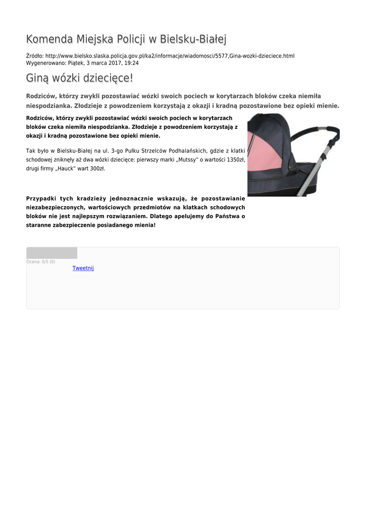 Komenda Miejska Policji w Bielsku-Białej Źródło: http://www.bielsko.slaska.policja.gov.pl/ka2/informacje/wiadomosci/5577,Gina-wozki-dzieciece.html Wygenerowano: Piątek, 3 marca 2017, 19:24 Giną wózki dziecięce! Rodziców, którzy zwykli pozostawiać wózki swoich pociech w korytarzach bloków czeka niemiła niespodzianka. Złodzieje z powodzeniem korzystają z okazji i kradną pozostawione bez opieki mienie. Rodziców, którzy zwykli pozostawiać wózki swoich pociech w korytarzach bloków czeka niemiła niespodzianka. Złodzieje z powodzeniem korzystają z okazji i kradną pozostawione bez opieki mienie. Tak było w Bielsku-Białej na ul. 3-go Pułku Strzelców Podhalańskich, gdzie z klatki schodowej zniknęły aż dwa wózki dziecięce: pierwszy marki „Mutssy” o wartości 1350zł, drugi firmy „Hauck” wart 300zł. Przypadki tych kradzieży jednoznacznie wskazują, że pozostawianie niezabezpieczonych, wartościowych przedmiotów na klatkach schodowych bloków nie jest najlepszym rozwiązaniem. Dlatego apelujemy do Państwa o staranne zabezpieczenie posiadanego mienia! Ocena: 0/5 (0) Tweetnij
