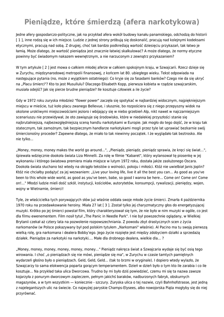 Pieniądze, które śmierdzą (afera narkotykowa) Jedne afery gospodarczo-polityczne, jak na przykład afera wokół budowy kanału panamskiego, odchodzą do historii [ 1 ], inne rodzą się w ich miejsce. Ludzie z jednej strony próbują się doskonalić, pracują nad kolejnymi kodeksami etycznymi, pracują nad sobą. Z drugiej, choć tak bardzo podkreślają wartość dziesięciu przykazań, tak łatwo je łamią. Może dlatego, że wartość pieniądza jest znacznie łatwiej skalkulować? A może dlatego, że normy etyczne powinny być świadomym nakazem wewnętrznym, a nie narzuconym z zewnątrz przykazaniem? W tym artykule [ 2 ] jest mowa o całkiem młodej aferze w całkiem spokojnym kraju, w Szwajcarii. Rzecz dzieje się w Zurychu, międzynarodowej metropolii finansowej, z końcem lat 80. ubiegłego wieku. Tekst odpowiada na następujące pytania (no, może z wyjątkiem ostatniego): Co kryje się za fasadami banków? Czego nie da się ukryć na „Placu śmierci"? Kto to jest Musullulu? Dlaczego Elisabeth Kopp, pierwsza kobieta w rządzie szwajcarskim, musiała odejść? Jak się pierze brudne pieniądze? Ile kosztuje człowiek a ile życie? Gdy w 1972 roku zuryska młodzież "flower power" zaczęła się spotykać w najbardziej widocznym, najpiękniejszym miejscu w mieście, tuż koło placu zwanego Bellevue, i słusznie, bo rozpościera się z niego przepyszny widok na okolone urokliwymi miejscowościami jezioro i wbijający się w niebo grzebień Alp, nikt nawet w najczarniejszym scenariuszu nie przewidywał, że oto zawiązuje się środowisko, które w niedalekiej przyszłości stanie się najbrutalniejszą, najbezwzględniejszą sceną handlu narkotykami w Europie. Jak mogło do tego dojść, że w kraju tak statecznym, tak zamożnym, tak bezpiecznym handlarze narkotykami mogli przez tyle lat uprawiać bezkarnie swój śmiercionośny proceder? Zapewne dlatego, że miało to tak niewinny początek. I że wyglądało tak beztrosko. Ale nie tylko... „Money, money, money makes the world go around…", „Pieniądz, pieniądz, pieniądz sprawia, że kręci się świat…", śpiewała wdzięcznie dookoła świata Liza Minnelli. Za rolę w filmie "Kabaret", który wylansował tę piosenkę w jej wykonaniu i którego światowa premiera miała miejsce w lutym 1972 roku, dostała jakże zasłużonego Oscara. Dookoła świata słuchano też wtedy na okrągło tekstów o wolności, pokoju i miłości. Któż nie uwielbiał Janis Joplin? Któż nie chciałby podążyć za jej wezwaniem: „Live your loving life, live it all the best you can… As good as you've been to this whole wide world, as good as you've been, babe, so good I wanna be here… Come on! Come on! Come on!…" Młodzi ludzie mieli dość szkół, instytucji, kościołów, autorytetów, konsumpcji, rywalizacji, pieniędzy, wojen, wojny w Wietnamie, śmierci! Tyle, że właścicielka tych porywających słów już właśnie oddała swoje młode życie śmierci. Zmarła 4 października 1970 roku na przedawkowanie heroiny. Miała 27 lat [ 3 ]. Został tylko jej charyzmatyczny głos do energetyzującej muzyki. Krótko po jej śmierci powstał film, który charakteryzował się tym, że nie było w nim muzyki w ogóle, co jest dla filmu ewenementem. Film nosił tytuł „The Panic in Needle Park". I nie był powszechnie oglądany, w Wielkiej Brytanii czekał aż cztery lata na pozwolenie rozpowszechniania. Z powodu zbyt drastycznych scen z życia narkomanów (w Polsce pokazywany był pod polskim tytułem „Narkomani" właśnie). Al Pacino ma tu swoją pierwszą wielką rolę, gra narkomana i dealera Bobby’ego. Jego życie rozpięte jest między zdobyciem działki a sprzedażą działek. Pieniądze za narkotyki na narkotyki.… Małe dla drobnego dealera, wielkie dla… ? „Money, money, money, money, money, money…" Pieniądz nakręca świat a Szwajcaria wydaje się być osią tego wirowania. I choć „o pieniądzach się nie mówi, pieniądze się ma", w Zurychu w czasie tamtych pamiętnych wydarzeń głośno było o pieniądzach. Geld, Geld, Geld… (tak to brzmi w oryginale). I dopiero wtedy wylazło, że Szwajcarzy to sama elokwencja poparta gorącym temperamentem. Dzień w dzień było o tym kto ile zarabia i co ile kosztuje… Na przykład taka ulica Dworcowa. Trudno by mi było dziś powiedzieć, czemu mi się ta nazwa zawsze kojarzyła z ponurym dworcowym zapleczem, pełnym jakichś baraków, nadburzonych fabryk, obskurnych magazynów, a w tym wszystkim — koniecznie - szczury. Zuryska ulica o tej nazwie, czyli Bahnhofstrasse, jest jedną z najelegantszych ulic na świecie. Co najwyżej paryskie Champs-Elysees, albo nowojorska Piąta mogłyby się do niej przyrównać. Magazyny, i owszem. Lśniące szyby wystawowe, a za nimi taki wybór towarów, taka ich jakość, taki wykwint… a wszystko to pod koniec lat 80. ubiegłego wieku, gdy na półkach sklepów polskich królował ocet i musztarda, zmiany dopiero się szykowały. Ceny? Och, ubrania były stosunkowo tanie. Jedynie futra — kiedyś drogie, staniały „odkąd madame wie, że nie należy się odziewać w czyjąś sierść", sklepy z futrami wyraźnie spuściły z tonu. Było ich coraz mniej, ceny się kurczyły, Brigitte Bardot triumfowała. Za to sklepy jubilerskie miały coraz lepsze obroty. Slogan reklamowy „Be Piaget, Don't Show Your Arm" [ 4 ] chwycił. Marka „Piaget" to gwarancja nienarzucającego się designu za piekielną cenę. Biżuteria mieniła się na wystawach wszystkimi kolorami tęczy, wystawy same w sobie już były dziełami sztuki, sklepy kipiały towarami, przez kawiarnie przewalały się tłumy stałych bywalców na przemian z oszołomionymi turystami... Wartość metra kwadratowego zuryskiej Dworcowej rosła z dnia na dzień, ale kupcy jakoś ciągle się znajdowali, choć ceny były astronomiczne. Bahnhofstrasse jest pod powierzchnią przeryta korytarzami pełnymi trudnego do wyobrażenia bogactwa. Ponoć w bankowych sejfa