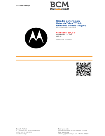 www.bcmarket.pl Nasadka do terminala Motorola/Zebra TC55 do ładowania w bazie ładującej Part number: CUPTC55XX-1000R Cena netto: 134,7 zł Cena brutto: 134,70 zł VAT: % Oferta z dnia: 2017-03-03 Barcode Market ul. Cieszyńska 365, 43-382 Bielsko-Biała tel./fax: +48 33 812 30 79 www.bcmarket.pl Dział sprzedaży [email protected] | kom. +48 726 160 800 Dział techniczny [email protected] | kom. +48 726 160 900