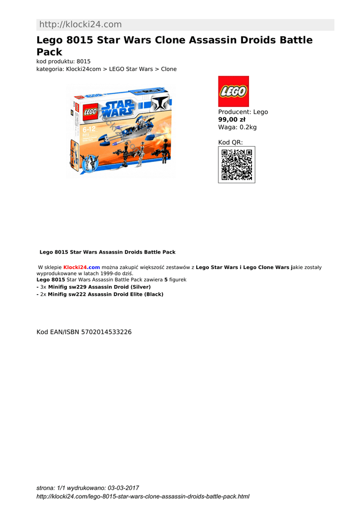 http://klocki24.com Lego 8015 Star Wars Clone Assassin Droids Battle Pack kod produktu: 8015 kategoria: Klocki24com > LEGO Star Wars > Clone Producent: Lego 99,00 zł Waga: 0.2kg Kod QR: Lego 8015 Star Wars Assassin Droids Battle Pack W sklepie Klocki24.com można zakupić większość zestawów z Lego Star Wars i Lego Clone Wars jakie zostały wyprodukowane w latach 1999-do dziś. Lego 8015 Star Wars Assassin Battle Pack zawiera 5 figurek - 3x Minifig sw229 Assassin Droid (Silver) - 2x Minifig sw222 Assassin Droid Elite (Black) Kod EAN/ISBN 5702014533226 strona: 1/1 wydrukowano: 03-03-2017 http://klocki24.com/lego-8015-star-wars-clone-assassin-droids-battle-pack.html