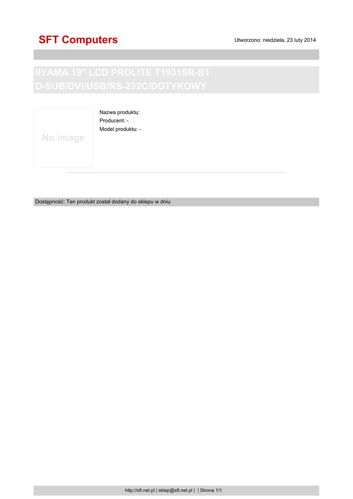 SFT Computers Utworzono: niedziela, 23 luty 2014 IIYAMA 19'' LCD PROLITE T1931SR-B1 D-SUB/DVI/USB/RS-232C/DOTYKOWY Nazwa produktu: Producent: Model produktu: - No image Dostępność: Ten produkt został dodany do sklepu w dniu http://sft.net.pl | [email protected] | | Strona 1/1