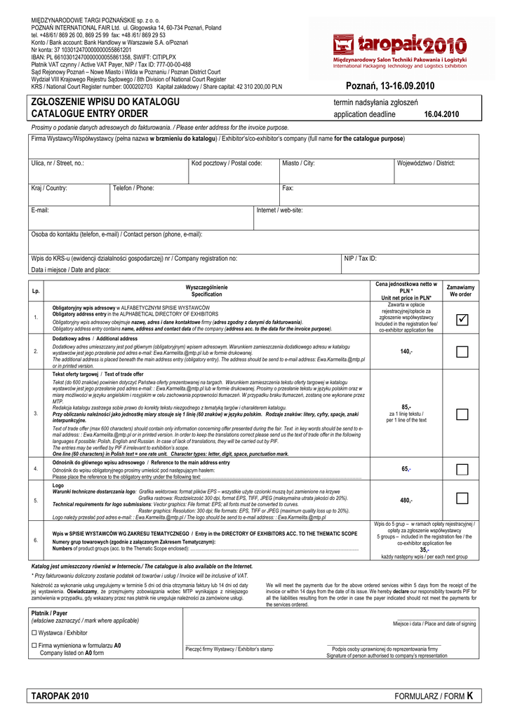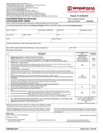 MIĘDZYNARODOWE TARGI POZNAŃSKIE sp. z o. o. POZNAŃ INTERNATIONAL FAIR Ltd. ul. Głogowska 14, 60-734 Poznań, Poland tel. +48/61/ 869 26 00, 869 25 99 fax: +48 /61/ 869 29 53 Konto / Bank account: Bank Handlowy w Warszawie S.A. o/Poznań Nr konta: 37 103012470000000055861201 IBAN: PL 66103012470000000055861358, SWIFT: CITIPLPX Płatnik VAT czynny / Active VAT Payer, NIP / Tax ID: 777-00-00-488 Sąd Rejonowy Poznań – Nowe Miasto i Wilda w Poznaniu / Poznan District Court Wydział VIII Krajowego Rejestru Sądowego / 8th Division of National Court Register KRS / National Court Register number: 0000202703 Kapitał zakładowy / Share capital: 42 310 200,00 PLN Poznań, 13-16.09.2010 ZGŁOSZENIE WPISU DO KATALOGU CATALOGUE ENTRY ORDER termin nadsyłania zgłoszeń application deadline 16.04.2010 Prosimy o podanie danych adresowych do fakturowania. / Please enter address for the invoice purpose. Firma Wystawcy/Współwystawcy (pełna nazwa w brzmieniu do katalogu) / Exhibitor’s/co-exhibitor’s company (full name for the catalogue purpose) Ulica, nr / Street, no.: Kraj / Country: Kod pocztowy / Postal code: Miasto / City: Telefon / Phone: Województwo / District: Fax: E-mail: Internet / web-site: Osoba do kontaktu (telefon, e-mail) / Contact person (phone, e-mail): Wpis do KRS-u (ewidencji działalności gospodarczej) nr / Company registration no: NIP / Tax ID: Data i miejsce / Date and place: Cena jednostkowa netto w PLN * Unit net price in PLN* Wyszczególnienie Specification Lp. Zamawiamy We order Zawarta w opłacie rejestracyjnej/opłacie za zgłoszenie współwystawcy Included in the registration fee/ co-exhibitor application fee 1. Obligatoryjny wpis adresowy w ALFABETYCZNYM SPISIE WYSTAWCÓW Obligatory address entry in the ALPHABETICAL DIRECTORY OF EXHIBITORS Obligatoryjny wpis adresowy obejmuje nazwę, adres i dane kontaktowe firmy (adres zgodny z danymi do fakturowania). Obligatory address entry contains name, address and contact data of the company (address acc. to the data for the invoice purpose). 2. Dodatkowy adres / Additional address Dodatkowy adres umieszczany jest pod głównym (obligatoryjnym) wpisem adresowym. Warunkiem zamieszczenia dodatkowego adresu w katalogu wystawców jest jego przesłanie pod adres e-mail: [email protected] lub w formie drukowanej. The additional address is placed beneath the main address entry (obligatory entry). The address should be send to e-mail address: [email protected] or in printed version. 3. Tekst oferty targowej / Text of trade offer Tekst (do 600 znaków) powinien dotyczyć Państwa oferty prezentowanej na targach. Warunkiem zamieszczenia tekstu oferty targowej w katalogu wystawców jest jego przesłanie pod adres e-mail: : [email protected] lub w formie drukowanej. Prosimy o przesłanie tekstu w języku polskim oraz w miarę moŜliwości w języku angielskim i rosyjskim w celu zachowania poprawności tłumaczeń. W przypadku braku tłumaczeń, zostaną one wykonane przez MTP. Redakcja katalogu zastrzega sobie prawo do korekty tekstu niezgodnego z tematyką targów i charakterem katalogu. Przy obliczaniu naleŜności jako jednostkę miary stosuje się 1 linię (60 znaków) w języku polskim. Rodzaje znaków: litery, cyfry, spacje, znaki interpunkcyjne. Text of trade offer (max 600 characters) should contain only information concerning offer presented during the fair. Text in key words should be send to email address: : [email protected] or in printed version. In order to keep the translations correct please send us the text of trade offer in the following languages if possible: Polish, English and Russian. In case of lack of translations, they will be carried out by PIF. The entries may be verified by PIF if irrelevant to exhibition’s scope. One line (60 characters) in Polish text = one rate unit. Character types: letter, digit, space, punctuation mark. 4. Odnośnik do głównego wpisu adresowego / Reference to the main address entry Odnośnik do wpisu obligatoryjnego prosimy umieścić pod następującym hasłem: Please place the reference to the obligatory entry under the following text: …………………………………………………………………………………………… 65,- 5. Logo Warunki techniczne dostarczania logo: Grafika wektorowa: format plików EPS – wszystkie uŜyte czcionki muszą być zamienione na krzywe Grafika rastrowa: Rozdzielczość 300 dpi, format EPS, TIFF, JPEG (maksymalna utrata jakości do 20%). Technical requirements for logo submissions: Vector graphics: File format: EPS; all fonts must be converted to curves. Raster graphics: Resolution: 300 dpi; file formats: EPS, TIFF or JPEG (maximum quality loss up to 20%). Logo naleŜy przesłać pod adres e-mail: : [email protected] / The logo should be send to e-mail address: : [email protected] 480,- 6. Wpis w SPISIE WYSTAWCÓW WG ZAKRESU TEMATYCZNEGO / Entry in the DIRECTORY OF EXHIBITORS ACC. TO THE THEMATIC SCOPE Numery grup towarowych (zgodnie z załączonym Zakresem Tematycznym): Numbers of product groups (acc. to the Thematic Scope enclosed): ..................................................................................................................................... 140,- 85,za 1 linię tekstu / per 1 line of the text Wpis do 5 grup – w ramach opłaty rejestracyjnej / opłaty za zgłoszenie współwystawcy 5 groups – included in the registration fee / the co-exhibitor application fee 35,kaŜdy następny wpis / per each next group Katalog jest umieszczony równieŜ w Internecie./ The catalogue is also available on the Internet. * Przy fakturowaniu doliczony zostanie podatek od towarów i usług / Invoice will be inclusive of VAT. NaleŜność za wykonanie usług uregulujemy w terminie 5 dni od dnia otrzymania faktury lub 14 dni od daty jej wystawienia. Oświadczamy, Ŝe przejmujemy zobowiązania wobec MTP wynikające z niniejszego zamówienia w przypadku, gdy wskazany przez nas płatnik nie ureguluje naleŜności za zam