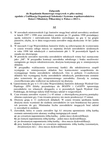 Załącznik do Regulamin Ramowego rozgrywek w piłce nożnej zgodnie z Unifikacją Organizacji Szkolenia i Systemu współzawodnictwa Dzieci i Młodzieży Piłkarskiej w Polsce z 2013 r. A1 1. W zawodach mistrzowskich Ligi Juniorów mogą brać udział zawodnicy urodzeni w latach 1997 i 1998 oraz zawodnicy urodzeni po 31 grudnia 1998 posiadający zgodę rodziców i zaświadczenie lekarskie zezwalające na grę w tej grupie juniorów, chyba, że w dniu rozgrywania zawodów mają ukończone 16 lat i jeden dzień. 2. W meczach I Ligi Wojewódzkiej Juniorów kluby są zobowiązane do wystawiania w czasie trwania całego meczu co najmniej dwóch zawodników urodzonych w roku 1998 lub młodszych z zastrzeżeniem pkt 1. W pozostałych ligach ta zasada nie obowiązuje. 3. W protokole zawodów nazwiska zawodników młodszych winny być zaznaczone jako „Mł”. W przypadku kontuzji zawodnika młodszego i braku możliwości zastąpienia go innym młodzieżowcem, drużyna kontynuuje grę w zmniejszonym składzie. W przypadku wykluczenia (czerwonej kartki) dla młodzieżowca zespół występuje w zmniejszonym składzie bez konieczności uzupełnienia do wymaganego limitu zawodników młodszych. Gra w pełnym 11-osobowym składzie bez wymaganej liczby zawodników młodszych, potraktowana zostanie jako wstawienie do gry nieuprawnionego zawodnika. Zawody te zostaną zweryfikowane jako walkower na niekorzyść tej drużyny. 4. Uprawnienia do gry w I i II Lidze Wojewódzkiej Juniorów dokonuje Wydział Gier Śląskiego ZPN (kluby przynależące do BOZPN i CzOZPN uprawniają zawodników we własnych okręgach), a w pozostałych ligach Wydział Gier Podokręgu, do którego należy klub biorący udział w rozgrywkach. 5. Czas trwania zawodów wynosi 2 x 45 minut z obowiązkową przerwą pomiędzy obiema częściami gry. Czas trwania przerwy nie może przekroczyć 15 minut. 6. Drużyny grają w 11 osobowych składach. W czasie trwania spotkania każda drużyna może wymienić do siedmiu zawodników (w tym bramkarza) bez prawa ich powrotu do gry. Minimalna liczba zawodników mogących brać udział w zawodach to siedmiu. 7. Zawodnik, który w czasie zawodów ligi A1 otrzyma upomnienie żółtą kartką zostanie automatycznie ukarany według następujących zasad: a) po czwartym napomnieniu żółtą kartką – jeden mecz dyskwalifikacji; b) po ósmym napomnieniu żółtą kartką – jeden mecz dyskwalifikacji; c) po dwunastym napomnieniu żółtą kartką – dwa mecze dyskwalifikacji; d) przy każdym kolejnym co czwartym napomnieniu żółtą kartką (szesnastym, dwudziestym itd.) – dwa mecze dyskwalifikacji. 8. Zawody mogą być rozgrywane na boiskach trawiastych lub o nawierzchni sztucznej o zalecanych wymiarach 90-105 m x 60-68 m. 9. Obsady sędziowskiej I Ligi Wojewódzkiej Juniorów dokonuje Kolegium Sędziów Śląskiego ZPN, a pozostałych lig Kolegium Sędziów Podokręgu, na terenie którego odbywają się zawody. Mecze Ligi Juniorów sędziuje 3 sędziów. B1 1. W zawodach mistrzowskich Ligi Juniorów Młodszych mogą brać udział zawodnicy urodzeni w latach 1999 i 2000 oraz zawodnicy urodzeni po 31 grudnia 2000 posiadający zgodę rodziców i zaświadczenie lekarskie zezwalające na grę na grę w tej grupie juniorów. 2. Uprawnienia do gry w I i II Lidze Wojewódzkiej Juniorów Młodszych dokonuje Wydział Gier Śląskiego ZPN (kluby przynależące do BOZPN i CzOZPN uprawniają zawodników we własnych okręgach), a w pozostałych ligach Wydział Gier Podokręgu, do którego należy klub biorący udział w rozgrywkach. 3. Czas trwania zawodów wynosi 2 x 40 minut gry z obowiązkową przerwą pomiędzy obiema częściami gry. Czas trwania przerwy nie może przekroczyć 15 minut. 4. W czasie trwania spotkania każda drużyna może wymienić do siedmiu zawodników (w tym bramkarza) bez prawa ich powrotu do gry. Minimalna liczba zawodników mogących brać udział w zawodach to siedmiu. 5. Zawodnik, który w czasie zawodów ligi B1 otrzyma upomnienie żółtą kartką zostanie automatycznie ukarany według następujących zasad: a) po czwartym napomnieniu żółtą kartką – jeden mecz dyskwalifikacji; b) po ósmym napomnieniu żółtą kartką – jeden mecz dyskwalifikacji; c) po dwunastym napomnieniu żółtą kartką – dwa mecze dyskwalifikacji; d) przy każdym kolejnym co czwartym napomnieniu żółtą kartką (szesnastym, dwudziestym itd.) – dwa mecze dyskwalifikacji. 6. Żółte kartki po rundzie jesiennej zostają anulowane (dotyczy rozgrywek, w których są awanse i spadki po rundzie jesiennej), natomiast kary dyskwalifikacji wymierzone ilością meczów przechodzą na rundę wiosenną. 7. Zawody mogą być rozgrywane na boiskach trawiastych lub o nawierzchni sztucznej o zalecanych wymiarach 90-105 m x 60-68 m. 8. Obsady sędziowskiej dokonuje Kolegium Sędziów Podokręgu, na terenie którego odbywają się zawody. Mecze sędziuje 3 sędziów. C1 1. W zawodach o mistrzostwo Ligi Trampkarzy mogą brać udział zawodnicy urodzeni w latach 2001 i 2002 oraz zawodnicy urodzeni po 31 grudnia 2002 posiadający zgodę rodziców i zaświadczenie lekarskie zezwalające na grę w tej grupie trampkarzy. 2. Uprawnienia do gry dokonuje Wydział Gier Podokręgu, do którego należy klub biorący udział w rozgrywkach. 2 3. Czas trwania zawodów wynosi 2 x 40 minut z obowiązkową 15-minutową przerwą pomiędzy obiema częściami gry. 4. Mecze rozgrywane są piłkami nr 5. 5. Zawody mogą być rozgrywane na boiskach trawiastych lub o nawierzchni sztucznej o zalecanych wymiarach 90-105 m x 55-68 m. 6. Wymiary bramek wynoszą: 7,32 m x 2,44 m. 7. Drużyny grają w 11 osobowych składach. W czasie spotkania każda drużyna może wymienić dowolną ilość zawodników – zmiany powrotne. Minimalna liczba zawodników mogących brać udział w zawodach to siedmiu. 8. Obuwie miękkie – tzw. lanki (zakaz gry we wkrętach i mixach). 9. Obowiązuje przepis o spalonym. 10. Kary: 3, 5, 10 minut oraz wy