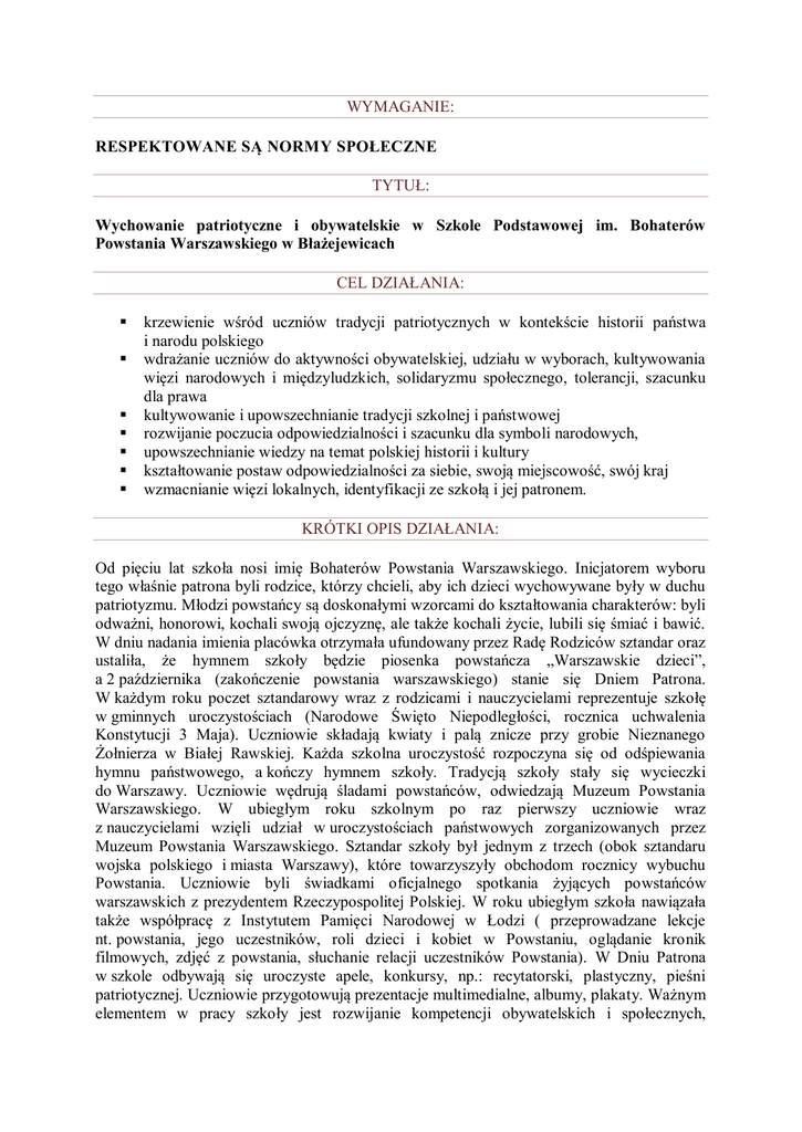 WYMAGANIE: RESPEKTOWANE SĄ NORMY SPOŁECZNE TYTUŁ: Wychowanie patriotyczne i obywatelskie w Szkole Podstawowej im. Bohaterów Powstania Warszawskiego w Błażejewicach CEL DZIAŁANIA: krzewienie wśród uczniów tradycji patriotycznych w kontekście historii państwa i narodu polskiego wdrażanie uczniów do aktywności obywatelskiej, udziału w wyborach, kultywowania więzi narodowych i międzyludzkich, solidaryzmu społecznego, tolerancji, szacunku dla prawa kultywowanie i upowszechnianie tradycji szkolnej i państwowej rozwijanie poczucia odpowiedzialności i szacunku dla symboli narodowych, upowszechnianie wiedzy na temat polskiej historii i kultury kształtowanie postaw odpowiedzialności za siebie, swoją miejscowość, swój kraj wzmacnianie więzi lokalnych, identyfikacji ze szkołą i jej patronem. KRÓTKI OPIS DZIAŁANIA: Od pięciu lat szkoła nosi imię Bohaterów Powstania Warszawskiego. Inicjatorem wyboru tego właśnie patrona byli rodzice, którzy chcieli, aby ich dzieci wychowywane były w duchu patriotyzmu. Młodzi powstańcy są doskonałymi wzorcami do kształtowania charakterów: byli odważni, honorowi, kochali swoją ojczyznę, ale także kochali życie, lubili się śmiać i bawić. W dniu nadania imienia placówka otrzymała ufundowany przez Radę Rodziców sztandar oraz ustaliła, że hymnem szkoły będzie piosenka powstańcza „Warszawskie dzieci”, a 2 października (zakończenie powstania warszawskiego) stanie się Dniem Patrona. W każdym roku poczet sztandarowy wraz z rodzicami i nauczycielami reprezentuje szkołę w gminnych uroczystościach (Narodowe Święto Niepodległości, rocznica uchwalenia Konstytucji 3 Maja). Uczniowie składają kwiaty i palą znicze przy grobie Nieznanego Żołnierza w Białej Rawskiej. Każda szkolna uroczystość rozpoczyna się od odśpiewania hymnu państwowego, a kończy hymnem szkoły. Tradycją szkoły stały się wycieczki do Warszawy. Uczniowie wędrują śladami powstańców, odwiedzają Muzeum Powstania Warszawskiego. W ubiegłym roku szkolnym po raz pierwszy uczniowie wraz z nauczycielami wzięli udział w uroczystościach państwowych zorganizowanych przez Muzeum Powstania Warszawskiego. Sztandar szkoły był jednym z trzech (obok sztandaru wojska polskiego i miasta Warszawy), które towarzyszyły obchodom rocznicy wybuchu Powstania. Uczniowie byli świadkami oficjalnego spotkania żyjących powstańców warszawskich z prezydentem Rzeczypospolitej Polskiej. W roku ubiegłym szkoła nawiązała także współpracę z Instytutem Pamięci Narodowej w Łodzi ( przeprowadzane lekcje nt. powstania, jego uczestników, roli dzieci i kobiet w Powstaniu, oglądanie kronik filmowych, zdjęć z powstania, słuchanie relacji uczestników Powstania). W Dniu Patrona w szkole odbywają się uroczyste apele, konkursy, np.: recytatorski, plastyczny, pieśni patriotycznej. Uczniowie przygotowują prezentacje multimedialne, albumy, plakaty. Ważnym elementem w pracy szkoły jest rozwijanie kompetencji obywatelskich i społecznych, przygotowanie uczniów do życia w społeczeństwie. Służy temu m.in. działalność Szkolnego Koła Wolontariatu „Podaj rękę swemu bratu”. W ramach pracy klubu wolontariusza uczniowie uczestniczą w akcjach charytatywnych. EFEKTY: Rezultaty działań mają wymiar wielostronny. Wszystkie podjęte działania przede wszystkim integrują społeczność szkoły. Uczniowie znają w całości hymn państwowy i tekst pieśni „Warszawskie dzieci”, potrafią zachować się podczas ich śpiewania. Znają fakty dotyczące Powstania Warszawskiego i sylwetki jego bohaterów – Patrona Szkoły, rozpoznają postawę patriotyczną, mają możliwość rozwijać zainteresowania historyczne, kulturowe. Lekcje muzealne i zwiedzanie stolicy uczy tolerancji, wzmacnia poczucie własnej wartości oraz tożsamości narodowej, rozwija dociekliwość poznawczą i twórczą. Działania poza szkołą skupione są na rozwijaniu świadomości narodowej współczesnego, młodego pokolenia, kultywowaniu tradycji, reprezentowaniu postaw patriotycznych. RADY I PRZESTROGI: Bardzo ważnym elementem jest prowadzenie lekcji przez osoby z zewnątrz – pracowników IPN, Muzeum Powstania Warszawskiego oraz spotkania z ciekawymi ludźmi. Uczniowie w ramach zajęć wyrażają własne uczucia, sądy, poszukują prawdy, rozbudzają swoją wrażliwość i refleksyjność na temat prawdy historycznej. SPOSOBY UPOWSZECHNIANIA: O podejmowanych działaniach szkoła informuje środowisko poprzez zamieszczanie artykułów i zdjęć w lokalnej prasie i na szkolnej stronie internetowej. Na bieżąco prowadzona jest kronika szkoły oraz kronika sztandaru. W działania inicjowane przez szkolę włączani są rodzice uczniów – udział w uroczystościach szkolnych, gminnych.