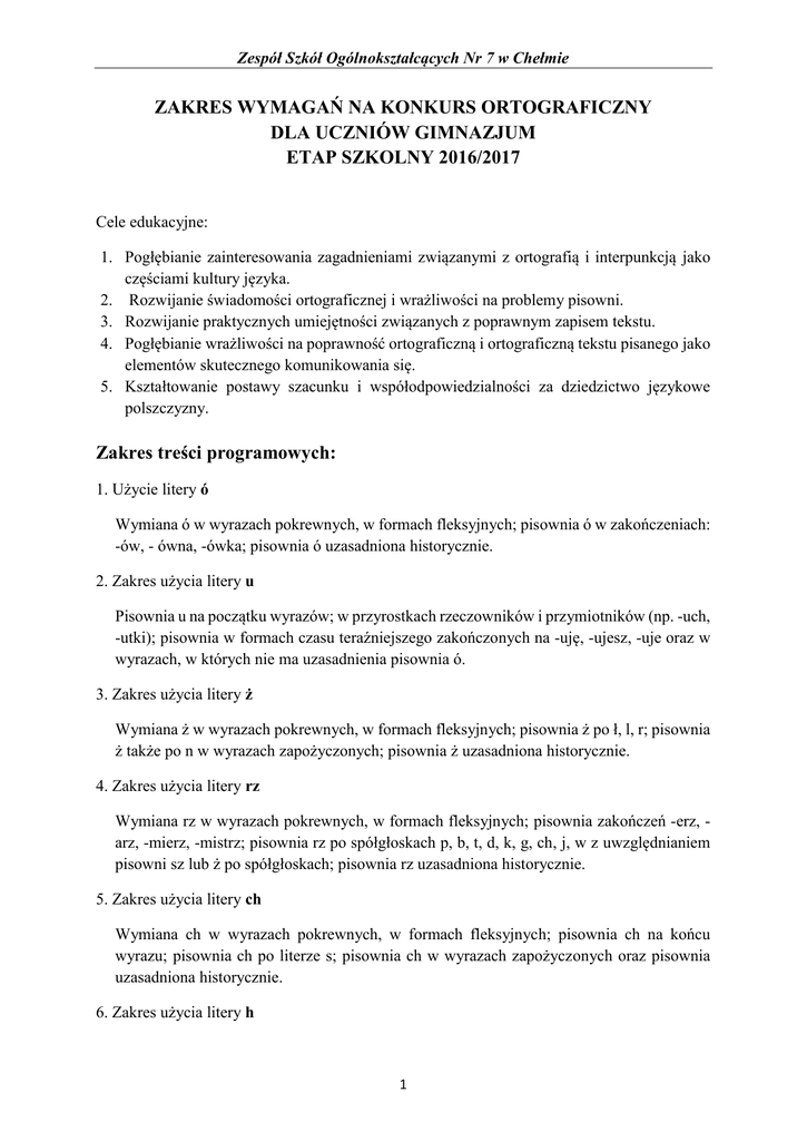 Zespół Szkół Ogólnokształcących Nr 7 w Chełmie ZAKRES WYMAGAŃ NA KONKURS ORTOGRAFICZNY DLA UCZNIÓW GIMNAZJUM ETAP SZKOLNY 2016/2017 Cele edukacyjne: 1. Pogłębianie zainteresowania zagadnieniami związanymi z ortografią i interpunkcją jako częściami kultury języka. 2. Rozwijanie świadomości ortograficznej i wrażliwości na problemy pisowni. 3. Rozwijanie praktycznych umiejętności związanych z poprawnym zapisem tekstu. 4. Pogłębianie wrażliwości na poprawność ortograficzną i ortograficzną tekstu pisanego jako elementów skutecznego komunikowania się. 5. Kształtowanie postawy szacunku i współodpowiedzialności za dziedzictwo językowe polszczyzny. Zakres treści programowych: 1. Użycie litery ó Wymiana ó w wyrazach pokrewnych, w formach fleksyjnych; pisownia ó w zakończeniach: -ów, - ówna, -ówka; pisownia ó uzasadniona historycznie. 2. Zakres użycia litery u Pisownia u na początku wyrazów; w przyrostkach rzeczowników i przymiotników (np. -uch, -utki); pisownia w formach czasu teraźniejszego zakończonych na -uję, -ujesz, -uje oraz w wyrazach, w których nie ma uzasadnienia pisownia ó. 3. Zakres użycia litery ż Wymiana ż w wyrazach pokrewnych, w formach fleksyjnych; pisownia ż po ł, l, r; pisownia ż także po n w wyrazach zapożyczonych; pisownia ż uzasadniona historycznie. 4. Zakres użycia litery rz Wymiana rz w wyrazach pokrewnych, w formach fleksyjnych; pisownia zakończeń -erz, arz, -mierz, -mistrz; pisownia rz po spółgłoskach p, b, t, d, k, g, ch, j, w z uwzględnianiem pisowni sz lub ż po spółgłoskach; pisownia rz uzasadniona historycznie. 5. Zakres użycia litery ch Wymiana ch w wyrazach pokrewnych, w formach fleksyjnych; pisownia ch na końcu wyrazu; pisownia ch po literze s; pisownia ch w wyrazach zapożyczonych oraz pisownia uzasadniona historycznie. 6. Zakres użycia litery h 1 Zespół Szkół Ogólnokształcących Nr 7 w Chełmie Wymiana h w wyrazach pokrewnych; pisownia w rozpoczynającej wyraz cząstce hekto-, hiper -hydro-, hidro-, hipo-; pisownia h uzasadniona historycznie. 7. Pisownia ą, ę, on, om, en, em w wyrazach rodzimych, spolszczonych i zapożyczonych, w formach deklinacyjnych i koniugacyjnych. 8. Pisownia i, j, zwłaszcza w rzeczownikach zakończonych na -ja, -ia, -eja, -ea, -ua. 9. Pisownia przedrostków z-, s-, ś-, wz-, weź-, ws-, wes-, bez-, nad-, ob-, od-, pod-, przed-, roz, w-. 10. Zakres użycia spółgłosek podwójnych (np. poddasze, lekki, o Jagielle, o Traugucie). 11. Pisownia przymiotników zakończonych na -ski, -cki, -dzki. 12. Pisownia przymiotników od nazw miejscowych. 13. Pisownia rzeczowników zakończonych na -stwo, -ctwo, -dztwo, -yzna, -izna. 14. Pisownia łączna i rozdzielna partykuł by, że,-ż, nie, zrostów i zestawień, przymiotników złożonych, wyrażeń przyimkowych, przyimków złożonych, wyrazu indziej. 15. Pisownia łączna lub rozdzielna liczebnika pół. 16. Użycie wielkiej i małej litery. 17. Pisownia nazw, imion i nazwisk obcego pochodzenia. 18. Pisownia z łącznikiem lub bez łącznika. 19. Zasady dzielenia wyrazów przy przenoszeniu. 20. Zasady użycia kropki, przecinka, pytajnika, dwukropka, myślnika, cudzysłowu. 21. Pisownia skrótów i skrótowców. Obowiązuje również poprawna pisownia słownictwa, którego zapis jest wyjątkiem od wyżej wymienionych zasad. Forma i organizacja konkursu- uczestnicy konkursu piszą ze słuchu przygotowany tekst, czyli dyktando. Dyktando to tekst zawierający od 250 do 350 wyrazów. Na jego przeprowadzenie przeznacza się 45 minut po odliczeniu czynności organizacyjnych. O przejściu do eliminacji okręgowych i wojewódzkich decyduje kryterium ilościowe. Uczeń musi spełnić dwa warunki: popełnia w dyktandzie najwyżej trzy błędy ortograficzne i najwyżej pięć błędów interpunkcyjnych. Proponowana literatura dla nauczycieli i uczniów szkoły podstawowej i gimnazjum: 1. Bańko M., Polszczyzna na co dzień, Warszawa 2013 (rozdz. 7. Zasady pisowni, 8. Zasady interpunkcji). 2. Polański E., Dydaktyka ortografii i interpunkcji, Warszawa 1987. 2 Zespół Szkół Ogólnokształcących Nr 7 w Chełmie 3. Polański E., Kita M., Dereń E., Nowak T., Słownik ortograficzny w wyrażeniach, Wrocław 2005. 4. Stypka A., Ortografia w szkole podstawowej. Ćwiczenia dla klas IV – VI, Warszawa 2000. 5. Stypka A., Ortografia w gimnazjum, Warszawa 2000 6. Wielki słownik ortograficzny PWN z zasadami pisowni i interpunkcji, pod red. E. Polańskiego, Warszawa 2012. 7. Strona internetowa Rady Języka Polskiego – www.rjp.pan.pl 3