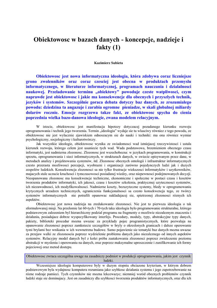 Obiektowosc w bazach danych - koncepcje, nadzieje i fakty (1) Kazimierz Subieta Obiektowosc jest nowa informatyczna ideologia, która zdobywa coraz liczniejsze grono zwolenników oraz coraz czesciej jest obecna w produktach przemyslu informatycznego, w literaturze informatycznej, programach nauczania i dzialalnosci naukowej. Przeladowanie terminu „obiektowy” powoduje czeste watpliwosci, czym naprawde jest obiektowosc i jakie ma konsekwencje dla obecnych i przyszlych technik, jezyków i systemów. Szczególnie goraca debata dotyczy baz danych, ze zrozumialego powodu: dziedzina ta angazuje i zarabia ogromne pieniadze, w skali globalnej miliardy dolarów rocznie. Emocje rozgrzewa takze fakt, ze obiektowosc spycha do cienia poprzednia wielka bazo-danowa ideologie, zwana modelem relacyjnym. W istocie, obiektowosc jest manifestacja hipotezy dotyczacej pozadanego kierunku rozwoju oprogramowania i technik jego tworzenia. Termin „ideologia” wydaje sie tu wlasciwy równiez z tego powodu, ze obiektowosc nie jest wylacznie zjawiskiem odnoszacym sie do nauki i techniki: ma ona równiez wymiar psychologiczny, socjologiczny i kulturotwórczy. Jak wszystkie ideologie, obiektowosc wynika ze swiadomosci wad istniejacej rzeczywistosci i ustala kierunek rozwoju, którego celem jest usuniecie tych wad. Wada podstawowa, brzemieniem obecnego czasu informatyki, jest nadmierna zlozonosc. Zlozonosc jest wszechobecna: w jezykach programowania, w konstrukcji sprzetu, oprogramowania i sieci informatycznych, w strukturach danych, w swiecie opisywanym przez dane, w metodach analizy i projektowania systemów, itd. Zlozonosc obecnych ontologii i infrastruktur informatycznych czesto przerasta mozliwosci percepcji, wyobrazni i organizacji zarówno pojedynczych ludzi jak i duzych zespolów ludzkich. Konsekwencja zlozonosci sa nie tylko frustracje wiekszosci informatyków i uzytkowników, majacych stale uczucie kruchosci i tymczasowosci posiadanej wiedzy, oraz niepewnosci podejmowanych decyzji. Nieopanowana zlozonosc ma konsekwencje techniczne, ekonomiczne i spoleczne w postaci czasu i kosztów tworzenia produktów informatyki, ich jakosci, czasu i kosztów szkolenia, praktycznej uzytecznosci systemów, ich niezawodnosci, ich modyfikowalnosci. Nadmierne koszty, bezuzyteczne systemy, bledy w oprogramowaniu krytycznych urzadzen technicznych, ograniczenia funkcjonalnosci sa czesto konsekwencja tego, ze twórcy systemów informatycznych nie potrafili opanowac nakladajacej sie, spietrzonej zlozonosci róznych ich aspektów. Obiektowosc jest nowa nadzieja na zredukowanie zlozonosci. Nie jest to pierwsza ideologia o tak sformulowanej misji. Na przelomie lat 60-tych i 70-tych taka ideologia bylo programowanie strukturalne, którego podstawowym zalozeniem byl hierarchiczny podzial programu na fragmenty o mozliwie niezaleznym znaczeniu i dzialaniu, posiadajace dobrze wyspecyfikowany interfejs. Procedury, moduly, typy, abstrakcyjne typy danych, pakiety, biblioteki procedur mozna uwazac za przyklady pojec programistycznych, które pozwalaja na opanowanie zlozonosci poprzez zamkniecie szczególów w bryly o okreslonych granicach i dalsze operowanie tymi brylami bez wnikania w ich wewnetrzna budowe. Samo pojawienie sie tematyki baz danych mozna uwazac za przejaw walki ze zlozonoscia poprzez wydzielenie problemu danych jako niezaleznego od innych aspektów systemów. Relacyjny model danych byl z kolei próba zaatakowania zlozonosci poprzez zwiekszenie poziomu abstrakcji w mysleniu i operowaniu na danych, oraz poprzez maksymalne uproszczenie i zunifikowanie ich formy pojeciowej oraz metod dostepu. Obiektowosc zwraca szczególna uwage na zasadniczy podmiot w produkcji oprogramowania, jakim jest czynnik ludzki. Wczesniejsze ideologie komputerowe byly w duzym stopniu obciazone kryterium, w którym dobrem podstawowym byla wydajnosc komputera rozumiana jako szybkosc dzialania systemu i jego zapotrzebowanie na rózne rodzaje pamieci. Tych czynników nie mozna lekcewazyc; niemniej wsród obecnych problemów czynnik ludzki staje sie dominujacy. Jest on zasadniczy dla szybkosci tworzenia produktów informatycznych, oraz dla ich cech uzytkowych takich jak jakosc, uniwersalnosc, elastycznosc, niezawodnosc, skutecznosc, estetyka, które na równi z wydajnoscia staja sie kluczowe dla produktów wspólczesnej informatyki. Cel nadrzedny obiektowej ideologii polega na lepszym dopasowaniu modeli pojeciowych i modeli realizacyjnych systemów do wrodzonych instynktów, wlasnosci psychologicznych i mentalnych mechanizmów percepcji i rozumienia swiata. J. Martin pisze: „Mój kot jest zorientowany obiektowo”, co ma uzmyslowic fakt, ze miliony lat ewolucji wyksztalcilo mechanizmy percepcji, których podstawa jest wyróznianie w otaczajacym nas swiecie obiektów o okreslonych granicach, które maja odpowiedniki jezykowe w postaci rzeczowników lub fraz rzeczownikowych, i które podlegaja okreslonemu zachowaniu lub manipulacjom. Zwrot ku obiektowosci w informatyce jest zjawiskiem pozytywnym glównie ze wzgledu na to, ze centralnym punktem zainteresowan staje sie nie narzedzie w postaci komputera lub systemu komputerowego, lecz czlowiek (projektant, programista, uzytkownik), z jego wrodzona percepcja otaczajacego go swiata i odpowiadajaca mu wizja wnetrza systemu informatycznego. Nawet w przypadku, kiedy to wnetrze nie ma bezposrednich skojarzen ze swiatem zewnetrznym, projektant i programista buduje w swoim umysle obrazy tworzonych i przetwarzanych danych, które maja podobne cechy jak obrazy obiektów materialnych. Obiektowosc - w zalozeniu - bazuje na wlasnosciach i mechanizmach ludzkiego umyslu na podobnej zasadzie jak koncepcja klawiatury komputera bazuje na anatomicznym fakcie posiadania przez ludzi rak i palców. Dla realizacji obiektowosci zaproponowano ogromna kolekcje pojec, metod, narzedzi, jezyków i systemów. Obiektowosc, jako nazwana ideologia, liczy juz kilkanascie lat: jako poczatek jej intensywnego rozwoju obiektowosci mozna uznac rok