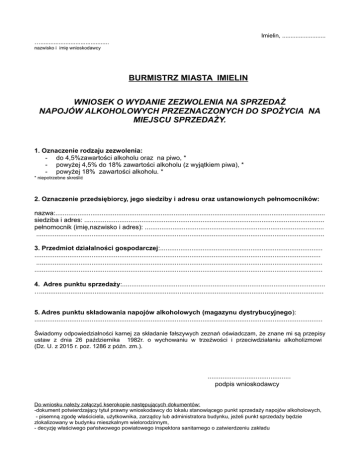 Imielin, .......................... …......................................... nazwisko i imię wnioskodawcy BURMISTRZ MIASTA IMIELIN WNIOSEK O WYDANIE ZEZWOLENIA NA SPRZEDAŻ NAPOJÓW ALKOHOLOWYCH PRZEZNACZONYCH DO SPOŻYCIA NA MIEJSCU SPRZEDAŻY. 1. Oznaczenie rodzaju zezwolenia: - do 4,5%zawartości alkoholu oraz na piwo, * - powyżej 4,5% do 18% zawartości alkoholu (z wyjątkiem piwa), * - powyżej 18% zawartości alkoholu. * * niepotrzebne skreślić 2. Oznaczenie przedsiębiorcy, jego siedziby i adresu oraz ustanowionych pełnomocników: nazwa:.................................................................................................................................................. siedziba i adres: .................................................................................................................................. pełnomocnik (imię,nazwisko i adres): ................................................................................................. ............................................................................................................................................................ 3. Przedmiot działalności gospodarczej:........................................................................................ ........................................................................................................................................................... ........................................................................................................................................................... ............................................................................................................................................................ 4. Adres punktu sprzedaży:.............................................................................................................. …......................................................................................................................................................... 5. Adres punktu składowania napojów alkoholowych (magazynu dystrybucyjnego): ............................................................................................................................................................ Świadomy odpowiedzialności karnej za składanie fałszywych zeznań oświadczam, że znane mi są przepisy ustaw z dnia 26 października 1982r. o wychowaniu w trzeźwości i przeciwdziałaniu alkoholizmowi (Dz. U. z 2015 r. poz. 1286 z późn. zm.). ............................................. podpis wnioskodawcy Do wniosku należy załączyć kserokopie następujących dokumentów: -dokument potwierdzający tytuł prawny wnioskodawcy do lokalu stanowiącego punkt sprzedaży napojów alkoholowych, - pisemną zgodę właściciela, użytkownika, zarządcy lub administratora budynku, jeżeli punkt sprzedaży będzie zlokalizowany w budynku mieszkalnym wielorodzinnym, - decyzję właściwego państwowego powiatowego inspektora sanitarnego o zatwierdzeniu zakładu