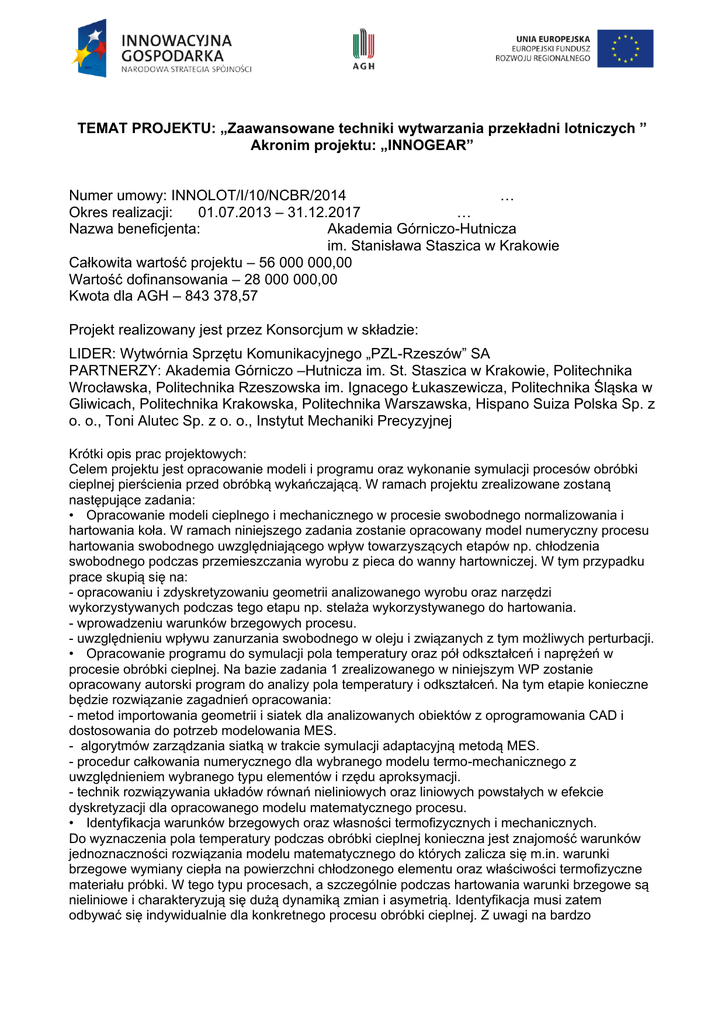 TEMAT PROJEKTU: „Zaawansowane techniki wytwarzania przekładni lotniczych ” Akronim projektu: „INNOGEAR” Numer umowy: INNOLOT/I/10/NCBR/2014 … Okres realizacji: 01.07.2013 – 31.12.2017 … Nazwa beneficjenta: Akademia Górniczo-Hutnicza im. Stanisława Staszica w Krakowie Całkowita wartość projektu – 56 000 000,00 Wartość dofinansowania – 28 000 000,00 Kwota dla AGH – 843 378,57 Projekt realizowany jest przez Konsorcjum w składzie: LIDER: Wytwórnia Sprzętu Komunikacyjnego „PZL-Rzeszów” SA PARTNERZY: Akademia Górniczo –Hutnicza im. St. Staszica w Krakowie, Politechnika Wrocławska, Politechnika Rzeszowska im. Ignacego Łukaszewicza, Politechnika Śląska w Gliwicach, Politechnika Krakowska, Politechnika Warszawska, Hispano Suiza Polska Sp. z o. o., Toni Alutec Sp. z o. o., Instytut Mechaniki Precyzyjnej Krótki opis prac projektowych: Celem projektu jest opracowanie modeli i programu oraz wykonanie symulacji procesów obróbki cieplnej pierścienia przed obróbką wykańczającą. W ramach projektu zrealizowane zostaną następujące zadania: • Opracowanie modeli cieplnego i mechanicznego w procesie swobodnego normalizowania i hartowania koła. W ramach niniejszego zadania zostanie opracowany model numeryczny procesu hartowania swobodnego uwzględniającego wpływ towarzyszących etapów np. chłodzenia swobodnego podczas przemieszczania wyrobu z pieca do wanny hartowniczej. W tym przypadku prace skupią się na: - opracowaniu i zdyskretyzowaniu geometrii analizowanego wyrobu oraz narzędzi wykorzystywanych podczas tego etapu np. stelaża wykorzystywanego do hartowania. - wprowadzeniu warunków brzegowych procesu. - uwzględnieniu wpływu zanurzania swobodnego w oleju i związanych z tym możliwych perturbacji. • Opracowanie programu do symulacji pola temperatury oraz pół odkształceń i naprężeń w procesie obróbki cieplnej. Na bazie zadania 1 zrealizowanego w niniejszym WP zostanie opracowany autorski program do analizy pola temperatury i odkształceń. Na tym etapie konieczne będzie rozwiązanie zagadnień opracowania: - metod importowania geometrii i siatek dla analizowanych obiektów z oprogramowania CAD i dostosowania do potrzeb modelowania MES. - algorytmów zarządzania siatką w trakcie symulacji adaptacyjną metodą MES. - procedur całkowania numerycznego dla wybranego modelu termo-mechanicznego z uwzględnieniem wybranego typu elementów i rzędu aproksymacji. - technik rozwiązywania układów równań nieliniowych oraz liniowych powstałych w efekcie dyskretyzacji dla opracowanego modelu matematycznego procesu. • Identyfikacja warunków brzegowych oraz własności termofizycznych i mechanicznych. Do wyznaczenia pola temperatury podczas obróbki cieplnej konieczna jest znajomość warunków jednoznaczności rozwiązania modelu matematycznego do których zalicza się m.in. warunki brzegowe wymiany ciepła na powierzchni chłodzonego elementu oraz właściwości termofizyczne materiału próbki. W tego typu procesach, a szczególnie podczas hartowania warunki brzegowe są nieliniowe i charakteryzują się dużą dynamiką zmian i asymetrią. Identyfikacja musi zatem odbywać się indywidualnie dla konkretnego procesu obróbki cieplnej. Z uwagi na bardzo ograniczone możliwości bezpośredniego pomiaru do wyznaczenia warunków brzegowych zastosowane zostanie rozwiązanie brzegowego zagadnienia odwrotnego. Na zaprojektowanym i zbudowanym w tym celu stanowisku laboratoryjnym zostaną wykonane pomiary pola temperatury w próbce podczas jej obróbki cieplnej z użyciem chłodziwa stosowanego w rzeczywistym procesie przemysłowym. Na tej podstawie zostaną wykonane obliczenia pozwalające na wyznaczenie współczynników przejmowania ciepła lub gęstości strumienia ciepła wymienianego pomiędzy chłodziwem a powierzchnią chłodzonego materiału zależnie od jej temperatury. Eksperymenty zostaną wykonane dla różnych prędkości przepływu czynnika względem badanej powierzchni i jej różnej konfiguracji względem wektora średniej prędkości przepływu (prostopadle i stycznie) w sposób uwzględniający rzeczywisty przepływ czynnika w warunkach przemysłowych. Do określenia przewodności cieplnej oraz ciepła właściwego przewiduje się wykonanie pomiarów na specjalistycznym stanowisku badawczym wykorzystującym metodę impulsową pomiaru dyfuzyjności cieplnej, która pozwoli określić zmienne z temperaturą właściwości materiału, poczynając od otoczenia aż do temperatury obróbki cieplnej. Uzyskane wyniki posłużą do zwiększenia dokładności oznaczenia warunków brzegowych wymiany ciepła oraz poprawnej symulacji pól temperatury, odkształceń i naprężeń. • Wykonanie obliczeń naprężeń i odkształceń. Na bazie opracowanych narzędzi numerycznych w poprzednich zadaniach zostanie przeprowadzona seria obliczeń numerycznych z uwzględnieniem różnych warunków realizacji procesu. • Weryfikacja modelu w oparciu o próby swobodnego normalizowania i hartowania. kontakt: dr inż. Łukasz Rauch, e-mail: [email protected]; tel +12 617 38 75 PROJEKT WSPÓŁFINANSOWANY ZE ŚRODKÓW EURPOEJSKIEGO FUNDUSZU ROZWOJU REGIONALNEGO W RAMACH PROGRAMU OPERACYJNEGO INNOWACYJNA GOSPODARKA