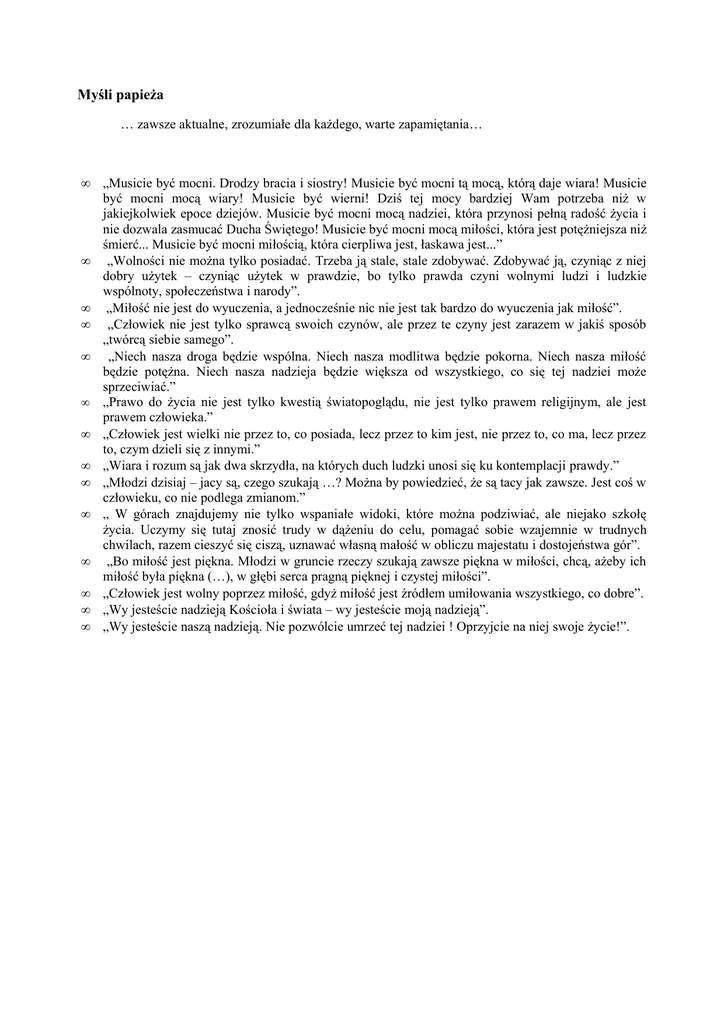Myśli papieża … zawsze aktualne, zrozumiałe dla każdego, warte zapamiętania… • • • • • • • • • • • • • • „Musicie być mocni. Drodzy bracia i siostry! Musicie być mocni tą mocą, którą daje wiara! Musicie być mocni mocą wiary! Musicie być wierni! Dziś tej mocy bardziej Wam potrzeba niż w jakiejkolwiek epoce dziejów. Musicie być mocni mocą nadziei, która przynosi pełną radość życia i nie dozwala zasmucać Ducha Świętego! Musicie być mocni mocą miłości, która jest potężniejsza niż śmierć... Musicie być mocni miłością, która cierpliwa jest, łaskawa jest...” „Wolności nie można tylko posiadać. Trzeba ją stale, stale zdobywać. Zdobywać ją, czyniąc z niej dobry użytek – czyniąc użytek w prawdzie, bo tylko prawda czyni wolnymi ludzi i ludzkie wspólnoty, społeczeństwa i narody”. „Miłość nie jest do wyuczenia, a jednocześnie nic nie jest tak bardzo do wyuczenia jak miłość”. „Człowiek nie jest tylko sprawcą swoich czynów, ale przez te czyny jest zarazem w jakiś sposób „twórcą siebie samego”. „Niech nasza droga będzie wspólna. Niech nasza modlitwa będzie pokorna. Niech nasza miłość będzie potężna. Niech nasza nadzieja będzie większa od wszystkiego, co się tej nadziei może sprzeciwiać.” „Prawo do życia nie jest tylko kwestią światopoglądu, nie jest tylko prawem religijnym, ale jest prawem człowieka.” „Człowiek jest wielki nie przez to, co posiada, lecz przez to kim jest, nie przez to, co ma, lecz przez to, czym dzieli się z innymi.” „Wiara i rozum są jak dwa skrzydła, na których duch ludzki unosi się ku kontemplacji prawdy.” „Młodzi dzisiaj – jacy są, czego szukają …? Można by powiedzieć, że są tacy jak zawsze. Jest coś w człowieku, co nie podlega zmianom.” „ W górach znajdujemy nie tylko wspaniałe widoki, które można podziwiać, ale niejako szkołę życia. Uczymy się tutaj znosić trudy w dążeniu do celu, pomagać sobie wzajemnie w trudnych chwilach, razem cieszyć się ciszą, uznawać własną małość w obliczu majestatu i dostojeństwa gór”. „Bo miłość jest piękna. Młodzi w gruncie rzeczy szukają zawsze piękna w miłości, chcą, ażeby ich miłość była piękna (…), w głębi serca pragną pięknej i czystej miłości”. „Człowiek jest wolny poprzez miłość, gdyż miłość jest źródłem umiłowania wszystkiego, co dobre”. „Wy jesteście nadzieją Kościoła i świata – wy jesteście moją nadzieją”. „Wy jesteście naszą nadzieją. Nie pozwólcie umrzeć tej nadziei ! Oprzyjcie na niej swoje życie!”.