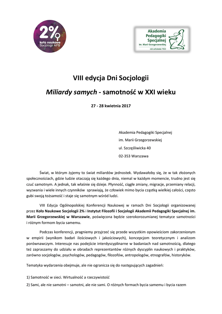 VIII edycja Dni Socjologii Miliardy samych - samotność w XXI wieku 27 - 28 kwietnia 2017 Akademia Pedagogiki Specjalnej im. Marii Grzegorzewskiej ul. Szczęśliwicka 40 02-353 Warszawa Świat, w którym żyjemy to świat miliardów jednostek. Wydawałoby się, że w tak złożonych społecznościach, gdzie ludzie otaczają się każdego dnia, niemal w każdym momencie, trudno jest się czuć samotnym. A jednak, tak właśnie się dzieje. Płynność, ciągłe zmiany, migracje, przemiany relacji, wyzwania i wiele innych czynników sprawiają, że człowiek mimo bycia cząstką wielkiej całości, często gubi swoją tożsamość i staje się samotnym wśród ludzi. VIII Edycja Ogólnopolskiej Konferencji Naukowej w ramach Dni Socjologii organizowanej przez Koło Naukowe Socjologii 2% i Instytut Filozofii i Socjologii Akademii Pedagogiki Specjalnej im. Marii Grzegorzewskiej w Warszawie, poświęcona będzie szerokorozumianej tematyce samotności i różnym formom bycia samemu. Podczas konferencji, pragniemy przyjrzeć się przede wszystkim opowieściom zakorzenionym w empirii (wynikom badań ilościowych i jakościowych), koncepcjom teoretycznym i analizom porównawczym. Interesuje nas podejście interdyscyplinarne w badaniach nad samotnością, dlatego też zapraszamy do udziału w obradach reprezentantów różnych dyscyplin naukowych i praktyków, zarówno socjologów, psychologów, pedagogów, filozofów, antropologów, etnografów, historyków. Tematyka wydarzenia obejmuje, ale nie ogranicza się do następujących zagadnień: 1) Samotność w sieci. Wirtualność a rzeczywistość 2) Sami, ale nie samotni – samotni, ale nie sami. O różnych formach bycia samemu i bycia razem 3) Skazani na samotność. Konsekwencje wykluczenia społecznego 4) Samotność. Wybór czy konieczność? 5) Samotność i osamotnienie. Różnice i podobieństwa doświadczeń w różnych stadiach życia 6) Samotność na emigracji. O różnych doświadczeniach migracyjnych m.in. samotność w dobie kryzysu imigracyjnego 7) Samotne rodzicielstwo. Wyzwania codzienności. 8) Miłość na odległość. O różnych formach bycia osobno (m.in. zjawisko eurosieroctwa) 8) Samotni w swych poglądach. O granicach wolności słowa 9) Samotność w chorobie i niepełnosprawności 10) Samotni w mieście. Samotni na wsi Zgłoszenia na konferencję prosimy wysłać na adres [email protected] do 17 marca 2017r. wypełniając formularz zgłoszeniowy znajdujący się w załączniku. Do zgłoszenia prosimy dołączyć abstrakt referatu (maks. 1,5 tys. znaków ze spacjami). Komitet Organizacyjny: Koło Naukowe Socjologii 2% Koordynator: Paulina Filipiak Komitet Naukowy: dr hab., prof. APS Danuta Duch-Krzystoszek dr Iwona Zielińska mgr Magda Prokopczuk Kontakt: [email protected] facebook.com/kn.2procent facebook.com/DniSocjologii Prosimy o udostępnianie niniejszej informacji wśród osób, które mogą być zainteresowane uczestnictwem w konferencji zarówno w roli prelegentów, jak i słuchaczy.