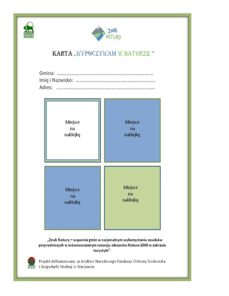 Karta "Wypoczywam w naturze" służy do kolekcjonowania naklejek przedstawiających znak natury gminy Tarnobrzeg. Naklejki rozmieszczone są w kilku wyznaczonych miejscach na terenie gminy. Zebranie 4 naklejek uprawnia do odbioru koszulki prezentującej znak natury. Wypełnioną naklejkami kartę należy dostarczyć osobiście do siedziby Regionalnego Centrum Promocji Obszaru Natury 2000 przy ul. Sandomierskiej 27 w Tarnobrzegu (Zamek Dzikowski) w godzinach otwarcia, gdzie wręczane będą koszulki. Można również przesłać skan karty na adres: [email protected], wówczas koszulka zostanie przesłana pocztą tradycyjną. Poniżej lista miejsc w których są dostępne naklejki. Gmina Tarnobrzeg 1. Liga Ochrony Przyrody, biuro w Tarnobrzegu, ul. Moniuszki 16 2. Regionalne Centrum Promocji Obszaru Natury 2000, ul. Sandomierska 27, Tarnobrzeg - Zamek Dzikowski 3. Stanica żeglarska Marina nad Jeziorem Tarnobrzeskim, ul. Żeglarska 2 4. MOSiR Tarnobrzeg al. Niepodległości 2 – bufet 5. Tarnobrzeski Dom Kultury , ul. Słowackiego 2 6. Bar Bocianówka, Tarnobrzeg, ul. Szkolna 5 7. Restauracja Fregata Tarnobrzeg, ul. Wiślna 11 8. Restauracja Małgośka Tarnobrzeg, ul. Wyspiańskiego 1 9. Trattoria Chłopcy z Ferajny Tarnobrzeg, ul. Zwierzyniecka Polecamy lop.tarnobrzeg.pl znaknatury.lop.org.pl natura2000.tarnobrzeg.pl